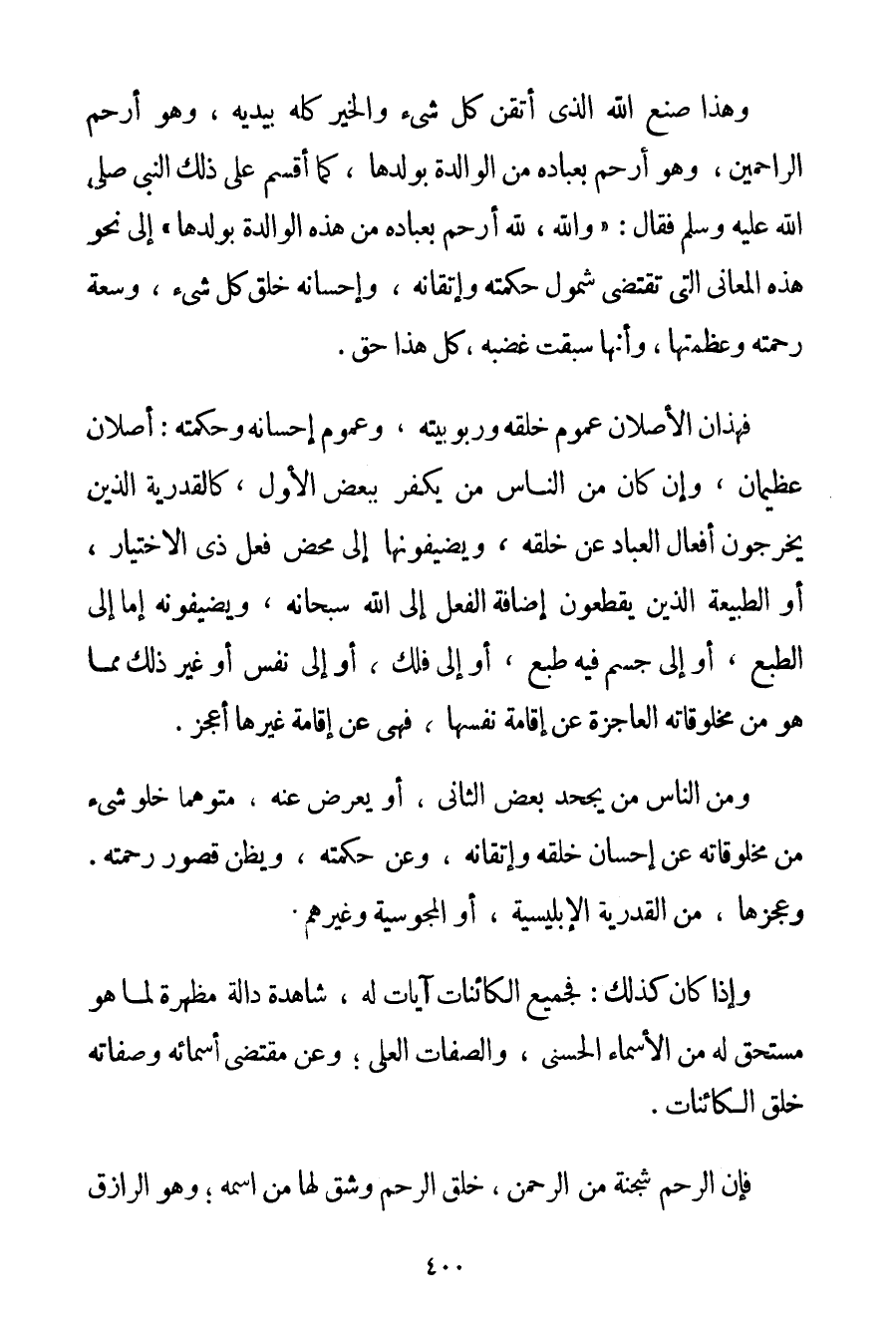 وَهَذَا صُنْعُ اللَّهِ الَّذِي أَتْقَنَ كُلَّ شَيْءٍ وَالْخَيْرُ كُلُّهُ بِيَدَيْهِ وَهُوَ أَرْحَمُ الرَّاحِمِينَ وَهُوَ أَرْحَمُ بِعِبَادِهِ مِنْ الْوَالِدَةِ بِوَلَدِهَا كَمَا أَقْسَمَ عَلَى ذَلِكَ النَّبِيُّ صَلَّى اللَّهُ عَلَيْهِ وَسَلَّمَ فَقَالَ: {وَاَللَّهِ لَلَّهُ أَرْحَمُ بِعِبَادِهِ مِنْ هَذِهِ الْوَالِدَةِ بِوَلَدِهَا} إلَى نَحْوِ هَذِهِ الْمَعَانِي الَّتِي تَقْتَضِي شُمُولَ حِكْمَتِهِ وَإِتْقَانَهُ وَإِحْسَانَهُ خَلْقَ كُلِّ شَيْءٍ وَسِعَةَ رَحْمَتِهِ وَعَظَمَتِهَا وَأَنَّهَا سَبَقَتْ غَضَبَهُ كُلُّ هَذَا حَقٌّ. فَهَذَانِ الْأَصْلَانِ عُمُومُ خَلْقِهِ وَرُبُوبِيَّتِهِ وَعُمُومُ إحْسَانِهِ وَحِكْمَتِهِ: أَصْلَانِ عَظِيمَانِ وَإِنْ كَانَ مِنْ النَّاسِ مَنْ يَكْفُرُ بِبَعْضِ الْأَوَّلِ كَالْقَدَرِيَّةِ الَّذِينَ يُخْرِجُونَ أَفْعَالَ الْعِبَادِ عَنْ خَلْقِهِ وَيُضِيفُونَهَا إلَى مَحْضِ فِعْلِ ذِي الِاخْتِيَارِ أَوْ الطَّبِيعَةِ الَّذِينَ يَقْطَعُونَ إضَافَةَ الْفِعْلِ إلَى اللَّهِ سُبْحَانَهُ وَيُضِيفُونَهُ إمَّا إلَى الطَّبْعِ أَوْ إلَى جِسْمٍ فِيهِ طَبْعٌ أَوْ إلَى فَلَكٍ أَوْ إلَى نَفْسٍ أَوْ غَيْرِ ذَلِكَ مِمَّا هُوَ مِنْ مَخْلُوقَاتِهِ الْعَاجِزَةِ عَنْ إقَامَةِ نَفْسِهَا فَهِيَ عَنْ إقَامَةِ غَيْرِهَا أَعْجَزُ. وَمِنْ النَّاسِ مَنْ يَجْحَدُ بَعْضَ الثَّانِي أَوْ يُعْرِضُ عَنْهُ مُتَوَهِّمًا خُلُوَّ شَيْءٍ مِنْ مَخْلُوقَاتِهِ عَنْ إحْسَانِ خَلْقِهِ وَإِتْقَانِهِ وَعَنْ حِكْمَتِهِ وَيَظُنُّ قُصُورَ رَحْمَتِهِ. وَعَجْزِهَا مِنْ الْقَدَرِيَّةِ الإبليسية أَوْ الْمَجُوسِيَّةِ وَغَيْرِهِمْ. وَإِذَا كَانَ كَذَلِكَ: فَجَمِيعُ الْكَائِنَاتِ: آيَاتٌ لَهُ شَاهِدَةٌ دَالَّةٌ مُظْهِرَةٌ لِمَا هُوَ مُسْتَحِقٌّ لَهُ مِنْ الْأَسْمَاءِ الْحُسْنَى وَالصِّفَاتِ الْعُلَى؛ وَعَنْ مُقْتَضَى أَسْمَائِهِ وَصِفَاتِهِ خَلَقَ الْكَائِنَاتِ. فَإِنَّ الرَّحِمَ شُجْنَةٌ مِنْ الرَّحْمَنِ خَلَقَ الرَّحِمَ وَشَقَّ لَهَا مِنْ اسْمِهِ؛ وَهُوَ الرَّازِقُ