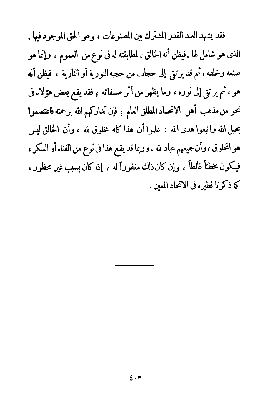 فَقَدْ يَشْهَدُ الْعَبْدُ الْقَدْرَ الْمُشْتَرَكَ بَيْنَ الْمَصْنُوعَاتِ وَهُوَ الْحَقُّ الْمَوْجُودُ فِيهَا الَّذِي هُوَ شَامِلٌ لَهَا فَيَظُنُّ أَنَّهُ الْخَالِقُ لِمُطَابَقَتِهِ لَهُ فِي نَوْعٍ مِنْ الْعُمُومِ وَإِنَّمَا هُوَ صُنْعُهُ وَخَلْقُهُ ثُمَّ قَدْ يَرْتَقِي إلَى حِجَابٍ مِنْ حُجُبِهِ النُّورِيَّةِ أَوْ النَّارِيَّةِ فَيَظُنُّ أَنَّهُ هُوَ ثُمَّ يَرْتَقِي إلَى نُورِهِ وَمَا يَظْهَرُ مِنْ أَثَرِ صِفَاتِهِ؛ فَقَدْ يَقَعُ بَعْضُ هَؤُلَاءِ فِي نَحْوٍ مَنْ مَذْهَبِ أَهْلِ الِاتِّحَادِ الْمُطْلَقِ الْعَامِّ؛ فَإِنْ تَدَارَكَهُمْ اللَّهُ بِرَحْمَتِهِ فَاعْتَصَمُوا بِحَبْلِ اللَّهِ وَاتَّبَعُوا هُدَى اللَّهِ: عَلِمُوا أَنَّ هَذَا كُلَّهُ مَخْلُوقٌ لِلَّهِ وَأَنَّ الْخَالِقَ لَيْسَ هُوَ الْمَخْلُوقَ وَأَنَّ جَمِيعَهُمْ عِبَادٌ لِلَّهِ وَرُبَّمَا قَدْ يَقَعُ هَذَا فِي نَوْعٍ مِنْ الْفَنَاءِ أَوْ السُّكْرِ فَيَكُونُ مُخْطِئًا غالطا وَإِنْ كَانَ ذَلِكَ مَغْفُورًا لَهُ إذَا كَانَ بِسَبَبِ غَيْرِ مَحْظُورٍ كَمَا ذَكَرْنَا نَظِيرَهُ فِي الِاتِّحَادِ الْمُعَيَّنِ.