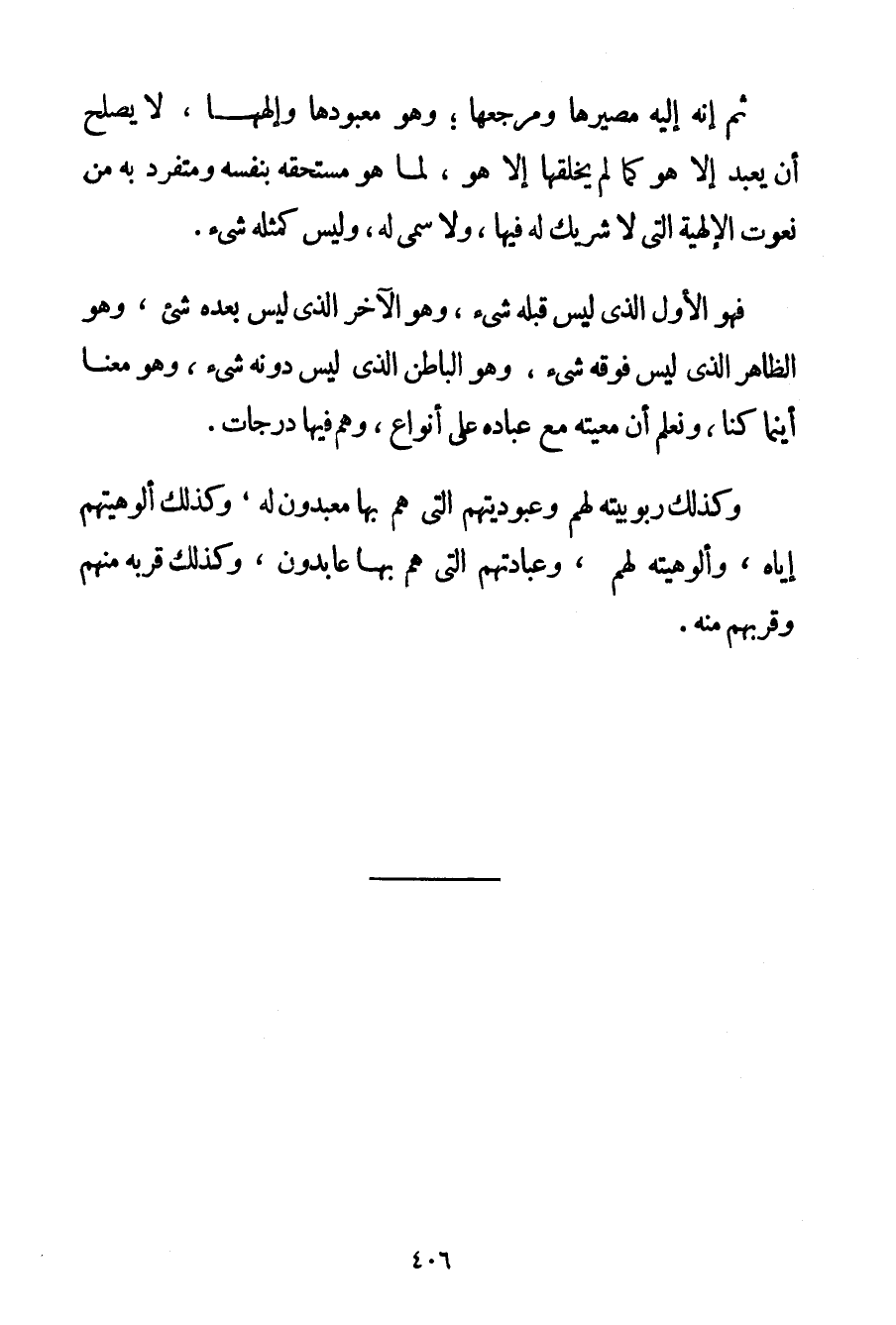 ثُمَّ إنَّهُ إلَيْهِ مَصِيرُهَا وَمَرْجِعُهَا؛ وَهُوَ مَعْبُودُهَا وَإِلَهُهَا لَا يَصْلُحُ أَنْ يُعْبَدَ إلَّا هُوَ كَمَا لَمْ يَخْلُقْهَا إلَّا هُوَ لِمَا هُوَ مُسْتَحِقُّهُ بِنَفْسِهِ وَمُتَفَرِّدٌ بِهِ مِنْ نُعُوتِ الْإِلَهِيَّةِ الَّتِي لَا شَرِيكَ لَهُ فِيهَا وَلَا سُمِّيَ لَهُ وَلَيْسَ كَمِثْلِهِ شَيْءٌ. فَهُوَ الْأَوَّلُ الَّذِي لَيْسَ قَبْلَهُ شَيْءٌ وَهُوَ الْآخِرُ الَّذِي لَيْسَ بَعْدَهُ شَيْءٌ وَهُوَ الظَّاهِرُ الَّذِي لَيْسَ فَوْقَهُ شَيْءٌ وَهُوَ الْبَاطِنُ الَّذِي لَيْسَ دُونَهُ شَيْءٌ وَهُوَ مَعَنَا أَيْنَمَا كُنَّا وَنَعْلَمُ أَنَّ مَعِيَّتَهُ مَعَ عِبَادِهِ عَلَى أَنْوَاعٍ وَهُمْ فِيهَا دَرَجَاتٌ. وَكَذَلِكَ رُبُوبِيَّتُهُ لَهُمْ وَعُبُودِيَّتُهُمْ الَّتِي هُمْ بِهَا مُعَبَّدُونَ لَهُ وَكَذَلِكَ أُلُوهِيَّتُهُمْ إيَّاهُ وَأُلُوهِيَّتُهُ لَهُمْ وَعِبَادَتُهُمْ الَّتِي هُمْ بِهَا عَابِدُونَ وَكَذَلِكَ قُرْبُهُ مِنْهُمْ وَقُرْبُهُمْ مِنْهُ.