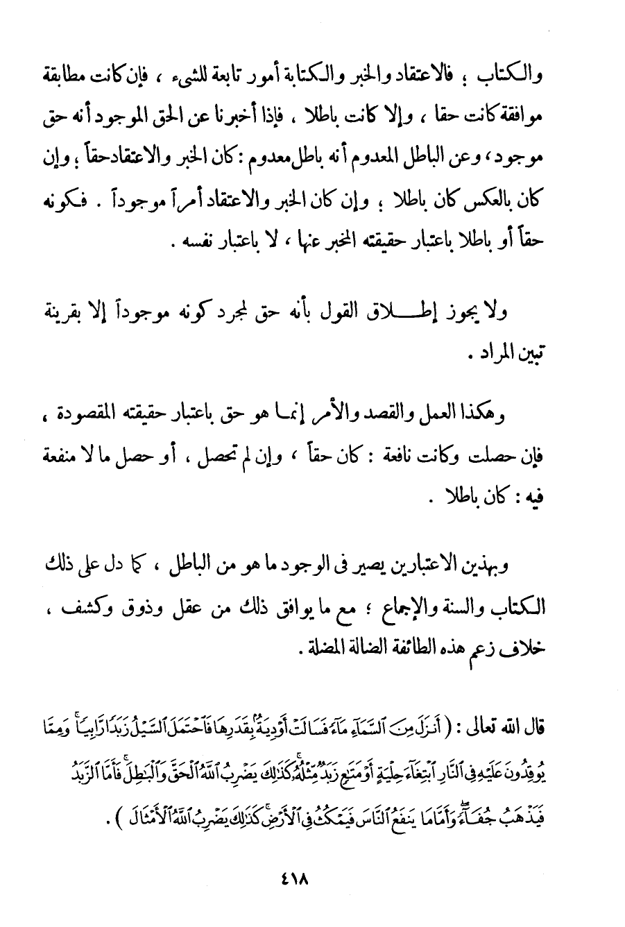 وَالْكِتَابُ؛ فَالِاعْتِقَادُ وَالْخَبَرُ وَالْكِتَابَةُ أُمُورٌ تَابِعَةٌ لِلشَّيْءِ فَإِنْ كَانَتْ مُطَابِقَةً مُوَافِقَةً كَانَتْ حَقًّا وَإِلَّا كَانَتْ بَاطِلًا فَإِذَا أَخْبَرْنَا عَنْ الْحَقِّ الْمَوْجُودِ أَنَّهُ حَقٌّ مَوْجُودٌ وَعَنْ الْبَاطِلِ الْمَعْدُومِ أَنَّهُ بَاطِلٌ مَعْدُومٌ: كَانَ الْخَبَرُ وَالِاعْتِقَادُ حَقًّا؛ وَإِنْ كَانَ بِالْعَكْسِ كَانَ بَاطِلًا؛ وَإِنْ كَانَ الْخَبَرُ وَالِاعْتِقَادُ أَمْرًا مَوْجُودًا. فَكَوْنُهُ حَقًّا أَوْ بَاطِلًا بِاعْتِبَارِ حَقِيقَتِهِ الْمُخْبَرِ عَنْهَا لَا بِاعْتِبَارِ نَفْسِهِ. وَلَا يَجُوزُ إطْلَاقُ الْقَوْلِ بِأَنَّهُ حَقٌّ لِمُجَرَّدِ كَوْنِهِ مَوْجُودًا إلَّا بِقَرِينَةٍ تُبَيِّنُ الْمُرَادَ. وَهَكَذَا الْعَمَلُ وَالْقَصْدُ وَالْأَمْرُ إنَّمَا هُوَ حَقٌّ بِاعْتِبَارِ حَقِيقَتِهِ الْمَقْصُودَةِ فَإِنْ حَصَلَتْ وَكَانَتْ نَافِعَةً: كَانَ حَقًّا وَإِنْ لَمْ تَحْصُلْ أَوْ حَصَلَ مَا لَا مَنْفَعَةَ فِيهِ: كَانَ بَاطِلًا. وَبِهَذَيْنِ الِاعْتِبَارَيْنِ يَصِيرُ فِي الْوُجُودِ مَا هُوَ مِنْ الْبَاطِلِ كَمَا دَلَّ عَلَى ذَلِكَ الْكِتَابُ وَالسُّنَّةُ وَالْإِجْمَاعُ مَعَ مَا يُوَافِقُ ذَلِكَ مِنْ عَقْلِ وَذَوْقِ وَكَشْفِ خِلَافِ زَعْمِ هَذِهِ الطَّائِفَةِ الضَّالَّةِ الْمُضِلَّةِ. قَالَ اللَّهُ تَعَالَى: {أَنْزَلَ مِنَ السَّمَاءِ مَاءً فَسَالَتْ أَوْدِيَةٌ بِقَدَرِهَا فَاحْتَمَلَ السَّيْلُ زَبَدًا رَابِيًا وَمِمَّا يُوقِدُونَ عَلَيْهِ فِي النَّارِ ابْتِغَاءَ حِلْيَةٍ أَوْ مَتَاعٍ زَبَدٌ مِثْلُهُ كَذَلِكَ يَضْرِبُ اللَّهُ الْحَقَّ وَالْبَاطِلَ فَأَمَّا الزَّبَدُ فَيَذْهَبُ جُفَاءً وَأَمَّا مَا يَنْفَعُ النَّاسَ فَيَمْكُثُ فِي الْأَرْضِ كَذَلِكَ يَضْرِبُ اللَّهُ الْأَمْثَالَ} .
