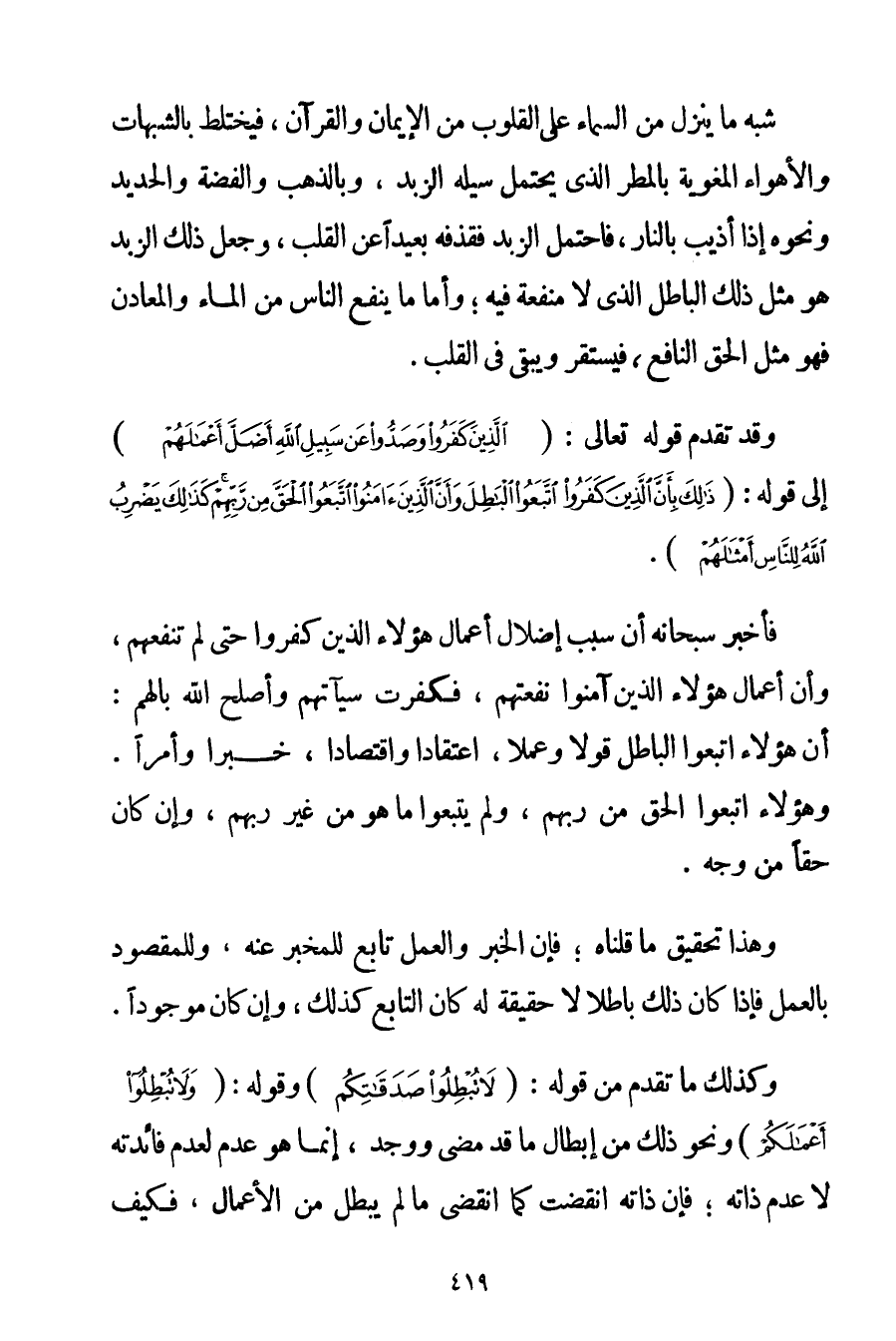 شَبَّهَ مَا يَنْزِلُ مِنْ السَّمَاءِ عَلَى الْقُلُوبِ مِنْ الْإِيمَانِ وَالْقُرْآنِ فَيَخْتَلِطُ بِالشُّبُهَاتِ وَالْأَهْوَاءِ الْمُغْوِيَةِ بِالْمَطَرِ الَّذِي يَحْتَمِلُ سَيْلُهُ الزَّبَدَ وَبِالذَّهَبِ وَالْفِضَّةِ وَالْحَدِيدِ وَنَحْوِهِ إذَا أُذِيبَ بِالنَّارِ فَاحْتَمَلَ الزَّبَدَ فَقَذَفَهُ بَعِيدًا عَنْ الْقَلْبِ وَجَعَلَ ذَلِكَ الزَّبَدَ هُوَ مَثَلُ ذَلِكَ الْبَاطِلِ الَّذِي لَا مَنْفَعَةَ فِيهِ؛ وَأَمَّا مَا يَنْفَعُ النَّاسَ مِنْ الْمَاءِ وَالْمَعَادِنِ فَهُوَ مِثْلُ الْحَقِّ النَّافِعِ فَيَسْتَقِرُّ وَيَبْقَى فِي الْقَلْبِ. وَقَدْ تَقَدَّمَ قَوْله تَعَالَى {الَّذِينَ كَفَرُوا وَصَدُّوا عَنْ سَبِيلِ اللَّهِ أَضَلَّ أَعْمَالَهُمْ} إلَى قَوْلِهِ: {ذَلِكَ بِأَنَّ الَّذِينَ كَفَرُوا اتَّبَعُوا الْبَاطِلَ وَأَنَّ الَّذِينَ آمَنُوا اتَّبَعُوا الْحَقَّ مِنْ رَبِّهِمْ كَذَلِكَ يَضْرِبُ اللَّهُ لِلنَّاسِ أَمْثَالَهُمْ} . فَأَخْبَرَ سُبْحَانَهُ أَنَّ سَبَبَ إضْلَالِ أَعْمَالِ هَؤُلَاءِ الَّذِينَ كَفَرُوا حَتَّى لَمْ تَنْفَعْهُمْ وَأَنَّ أَعْمَالَ هَؤُلَاءِ الَّذِينَ آمَنُوا نَفَعَتْهُمْ فَكَفَّرَتْ سَيِّئَاتِهِمْ وَأَصْلَحَ اللَّهُ بَالَهُمْ: أَنَّ هَؤُلَاءِ اتَّبَعُوا الْبَاطِلَ قَوْلًا وَعَمَلًا اعْتِقَادًا وَاقْتِصَادًا خَبَرًا وَأَمْرًا. وَهَؤُلَاءِ اتَّبَعُوا الْحَقَّ مِنْ رَبِّهِمْ وَلَمْ يَتَّبِعُوا مَا هُوَ مِنْ غَيْرِ رَبِّهِمْ وَإِنْ كَانَ حَقًّا مِنْ وَجْهٍ. وَهَذَا تَحْقِيقُ مَا قُلْنَاهُ؛ فَإِنَّ الْخَبَرَ وَالْعَمَلَ تَابِعٌ لِلْمُخْبَرِ عَنْهُ وَلِلْمَقْصُودِ بِالْعَمَلِ فَإِذَا كَانَ ذَلِكَ بَاطِلًا لَا حَقِيقَةَ لَهُ كَانَ التَّابِعُ كَذَلِكَ وَإِنْ كَانَ مَوْجُودًا. وَكَذَلِكَ مَا تَقَدَّمَ مِنْ قَوْلِهِ: {لَا تُبْطِلُوا صَدَقَاتِكُمْ} وَقَوْلُهُ: {وَلَا تُبْطِلُوا أَعْمَالَكُمْ} وَنَحْوُ ذَلِكَ مِنْ إبْطَالِ مَا قَدْ مَضَى وَوُجِدَ إنَّمَا هُوَ عَدَمٌ لِعَدَمِ فَائِدَتِهِ لَا عَدَمِ ذَاتِهِ؛ فَإِنَّ ذَاتَهُ انْقَضَتْ كَمَا انْقَضَى مَا لَمْ يَبْطُلْ مِنْ الْأَعْمَالِ فَكَيْفَ