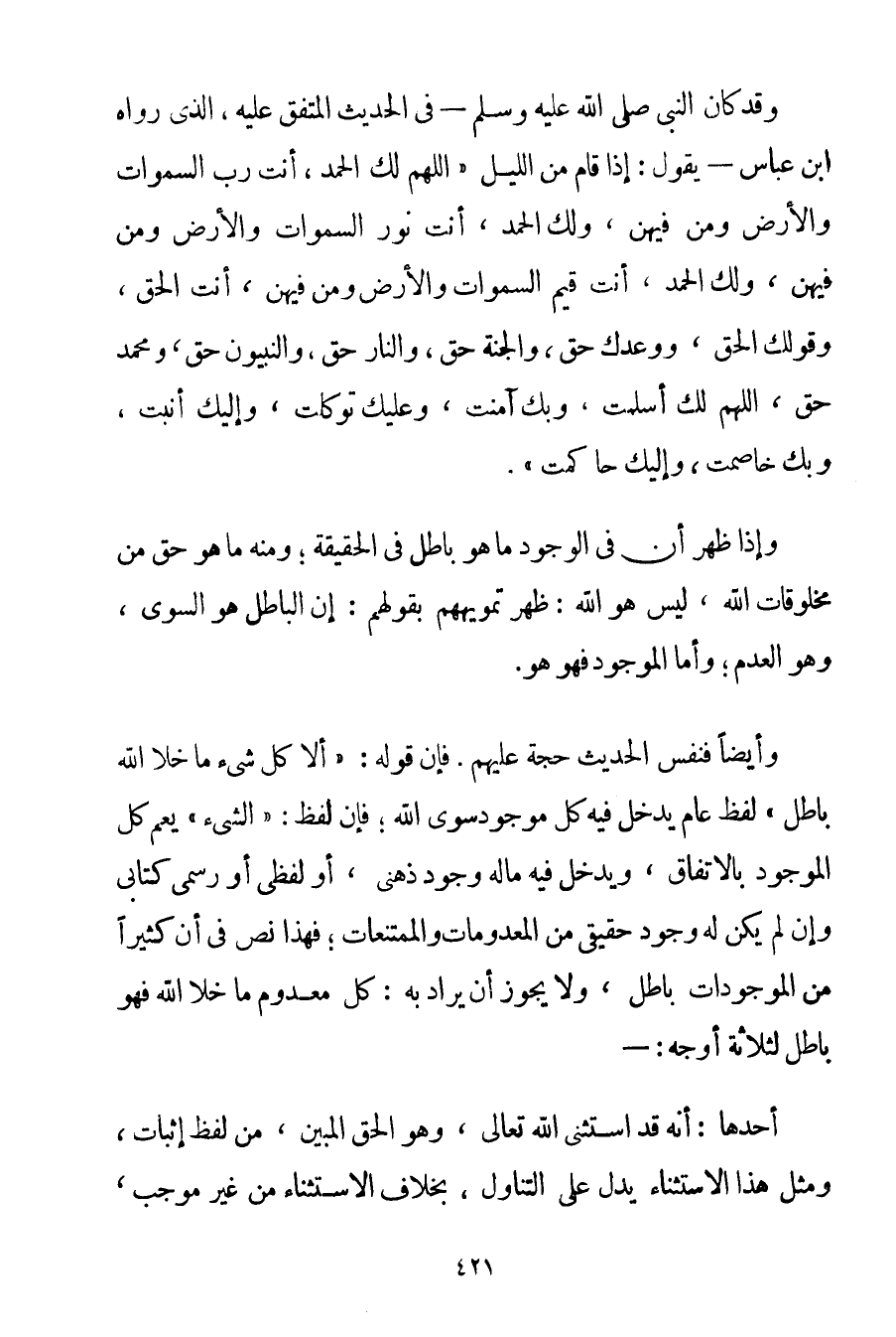 وَقَدْ كَانَ النَّبِيُّ صَلَّى اللَّهُ عَلَيْهِ وَسَلَّمَ - فِي الْحَدِيثِ الْمُتَّفَقِ عَلَيْهِ الَّذِي رَوَاهُ ابْنُ عَبَّاسٍ - يَقُولُ: {إذَا قَامَ مِنْ اللَّيْلِ اللَّهُمَّ لَك الْحَمْدُ أَنْتَ رَبُّ السَّمَوَاتِ وَالْأَرْضِ وَمَنْ فِيهِنَّ وَلَك الْحَمْدُ أَنْتَ نُورُ السَّمَوَاتِ وَالْأَرْضِ وَمَنْ فِيهِنَّ وَلَك الْحَمْدُ أَنْتَ قَيِّمُ السَّمَوَاتِ وَالْأَرْضِ وَمَنْ فِيهِنَّ أَنْتَ الْحَقُّ وَقَوْلُك الْحَقُّ وَوَعْدُك حَقٌّ وَالْجَنَّةُ حَقٌّ وَالنَّارُ حَقٌّ وَالنَّبِيُّونَ حَقٌّ وَمُحَمَّدٌ حَقٌّ اللَّهُمَّ لَك أَسْلَمْت وَبِك آمَنْت وَعَلَيْك تَوَكَّلْت وَإِلَيْك أَنَبْت وَبِك خَاصَمْت وَإِلَيْك حَاكَمْت.} وَإِذَا ظَهَرَ أَنَّ فِي الْوُجُودِ مَا هُوَ بَاطِلٌ فِي الْحَقِيقَةِ؛ وَمِنْهُ مَا هُوَ حَقٌّ مِنْ مَخْلُوقَاتِ اللَّهِ لَيْسَ هُوَ اللَّهَ: ظَهَرَ تَمْوِيهُهُمْ بِقَوْلِهِمْ: إنَّ الْبَاطِلَ هُوَ السَّوِيُّ وَهُوَ الْعَدَمُ؛ وَأَمَّا الْمَوْجُودُ فَهُوَ هُوَ. وَأَيْضًا فَنَفْسُ الْحَدِيثِ حُجَّةٌ عَلَيْهِمْ. فَإِنَّ قَوْلَهُ: " أَلَا كُلُّ شَيْءٍ مَا خَلَا اللَّهَ بَاطِلٌ " لَفْظٌ عَامٌّ يَدْخُلُ فِيهِ كُلُّ مَوْجُودٍ سِوَى اللَّهِ؛ فَإِنَّ لَفْظَ: " الشَّيْءُ " يَعُمُّ كُلَّ الْمَوْجُودِ بِالِاتِّفَاقِ وَيَدْخُلُ فِيهِ مَا لَهُ وُجُودٌ ذِهْنِيٌّ أَوْ لَفْظِيٌّ أَوْ رَسْمِيٌّ كِتَابِيٌّ وَإِنْ لَمْ يَكُنْ لَهُ وُجُودٌ حَقِيقِيٌّ مِنْ الْمَعْدُومَاتِ وَالْمُمْتَنِعَاتِ؛ فَهَذَا نَصٌّ فِي أَنَّ كَثِيرًا مِنْ الْمَوْجُودَاتِ بَاطِلٌ وَلَا يَجُوزُ أَنْ يُرَادَ بِهِ: كُلُّ مَعْدُومٍ مَا خَلَا اللَّهَ فَهُوَ بَاطِلٌ لِخَمْسَةِ أَوْجُهٍ: