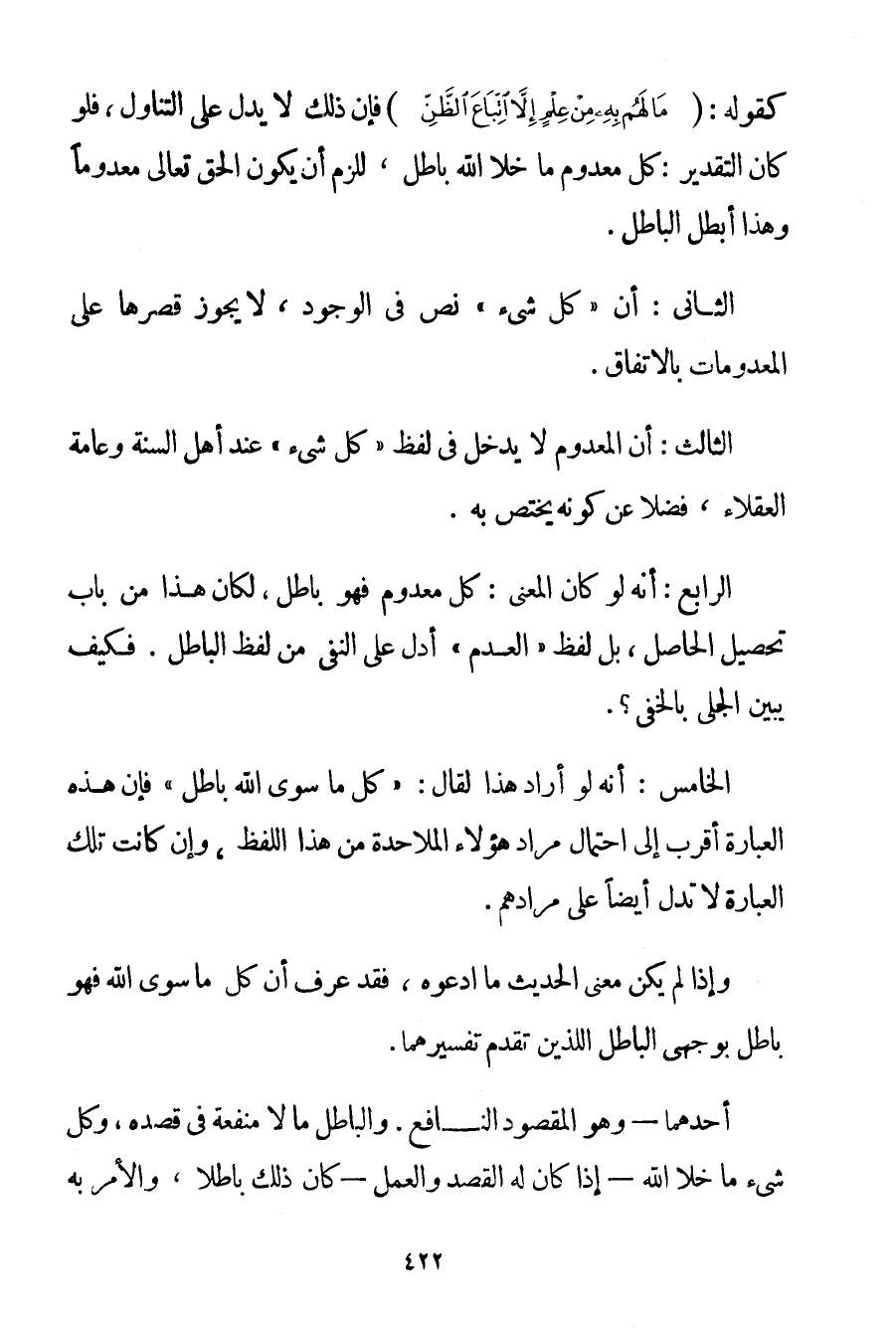 الرَّابِعُ: أَنَّهُ لَوْ كَانَ الْمَعْنَى: كُلُّ مَعْدُومٍ فَهُوَ بَاطِلٌ لَكَانَ هَذَا مِنْ بَابِ تَحْصِيلِ الْحَاصِلِ بَلْ لَفْظُ " الْعَدَمِ " أَدَلُّ عَلَى النَّفْيِ مِنْ لَفْظِ الْبَاطِلِ. فَكَيْفَ يُبَيَّنُ الْجَلِيُّ بِالْخَفِيِّ؟ . الْخَامِسُ: أَنَّهُ لَوْ أَرَادَ هَذَا لَقَالَ: " كُلُّ مَا سِوَى اللَّهِ بَاطِلٌ " فَإِنَّ هَذِهِ الْعِبَارَةَ أَقْرَبُ إلَى احْتِمَالِ مُرَادِ هَؤُلَاءِ الْمَلَاحِدَةِ مِنْ هَذَا اللَّفْظِ وَإِنْ كَانَتْ تِلْكَ الْعِبَارَةُ لَا تَدُلُّ أَيْضًا عَلَى مُرَادِهِمْ. وَإِذَا لَمْ يَكُنْ مَعْنَى الْحَدِيثِ مَا ادَّعَوْهُ فَقَدْ عُرِفَ أَنَّ كُلَّ مَا سِوَى اللَّهِ فَهُوَ بَاطِلٌ بِوَجْهَيْ الْبَاطِلِ اللَّذَيْنِ تَقَدَّمَ تَفْسِيرُهُمَا.