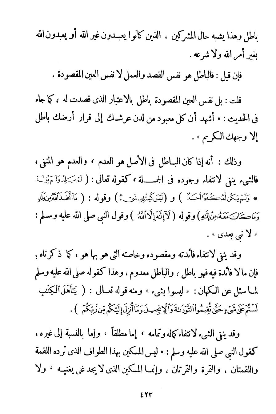 بَاطِلٌ وَهَذَا يُشْبِهُ حَالَ الْمُشْرِكِينَ الَّذِينَ كَانُوا يَعْبُدُونَ غَيْرَ اللَّهِ أَوْ يَعْبُدُونَ اللَّهَ بِغَيْرِ أَمْرِ اللَّهِ وَلَا شَرْعِهِ. فَإِنْ قِيلَ: فَالْبَاطِلُ هُوَ نَفْسُ الْقَصْدِ وَالْعَمَلِ لَا نَفْسُ الْعَيْنِ الْمَقْصُودَةِ. قُلْت: بَلْ نَفْسُ الْعَيْنِ الْمَقْصُودَةِ بَاطِلٌ بِالِاعْتِبَارِ الَّذِي قُصِدَتْ لَهُ كَمَا جَاءَ فِي الْحَدِيثِ: {أَشْهَدُ أَنَّ كُلَّ مَعْبُودٍ مِنْ لَدُنْ عَرْشِك إلَى قَرَارِ أَرْضِك بَاطِلٌ إلَّا وَجْهَك الْكَرِيمَ} . وَذَلِكَ: أَنَّهُ إذَا كَانَ الْبَاطِلُ فِي الْأَصْلِ هُوَ الْعَدَمُ وَالْعَدَمُ هُوَ الْمَنْفِيُّ فَالشَّيْءُ يُنْفَى لِانْتِفَاءِ وُجُودِهِ فِي الْجُمْلَةِ كَقَوْلِهِ تَعَالَى: {لَمْ يَلِدْ وَلَمْ يُولَدْ} {وَلَمْ يَكُنْ لَهُ كُفُوًا أَحَدٌ} وَ {لَيْسَ كَمِثْلِهِ شَيْءٌ} وَقَوْلِهِ: {مَا اتَّخَذَ اللَّهُ مِنْ وَلَدٍ وَمَا كَانَ مَعَهُ مِنْ إلَهٍ} وَقَوْلِهِ {لَا إلَهَ إلَّا اللَّهُ} وَقَوْلِ النَّبِيِّ صَلَّى اللَّهُ عَلَيْهِ وَسَلَّمَ {: لَا نَبِيَّ بَعْدِي} . وَقَدْ يُنْفَى لِانْتِفَاءِ فَائِدَتِهِ وَمَقْصُودِهِ وَخَاصَّتِهِ الَّتِي هُوَ بِهَا هُوَ كَمَا ذَكَرْنَاهُ؛ فَإِنَّ مَا لَا فَائِدَةَ فِيهِ فَهُوَ بَاطِلٌ وَالْبَاطِلُ مَعْدُومٌ وَهَذَا {كَقَوْلِهِ صَلَّى اللَّهُ عَلَيْهِ وَسَلَّمَ لَمَّا سُئِلَ عَنْ الْكُهَّانِ: لَيْسُوا بِشَيْءِ} وَمِنْهُ قَوْله تَعَالَى تَعَالَى: {يَا أَهْلَ الْكِتَابِ لَسْتُمْ عَلَى شَيْءٍ حَتَّى تُقِيمُوا التَّوْرَاةَ وَالْإِنْجِيلَ وَمَا أُنْزِلَ إلَيْكُمْ مِنْ رَبِّكُمْ} . وَقَدْ يُنْفَى الشَّيْءُ لِانْتِفَاءِ كَمَالِهِ وَتَمَامِهِ إمَّا مُطْلَقًا وَإِمَّا بِالنِّسْبَةِ إلَى غَيْرِهِ كَقَوْلِ النَّبِيِّ صَلَّى اللَّهُ عَلَيْهِ وَسَلَّمَ {: لَيْسَ الْمِسْكِينُ بِهَذَا الطَّوَافِ الَّذِي تَرُدُّهُ اللُّقْمَةُ وَاللُّقْمَتَانِ وَالتَّمْرَةُ وَالتَّمْرَتَانِ وَإِنَّمَا الْمِسْكِينُ الَّذِي لَا يَجِدُ غِنًى يُغْنِيهِ