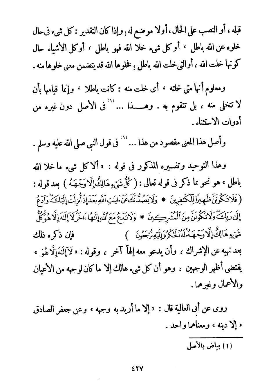 وَهَذَا التَّوْحِيدُ وَتَفْسِيرُهُ الْمَذْكُورُ فِي قَوْلِهِ: " أَلَا كُلُّ شَيْءٍ مَا خَلَا اللَّهَ بَاطِلٌ " هُوَ نَحْوٌ مِمَّا ذَكَرَ فِي قَوْله تَعَالَى {كُلُّ شَيْءٍ هَالِكٌ إلَّا وَجْهَهُ} بَعْدَ قَوْلِهِ: {فَلَا تَكُونَنَّ ظَهِيرًا لِلْكَافِرِينَ} {وَلَا يَصُدُّنَّكَ عَنْ آيَاتِ اللَّهِ بَعْدَ إذْ أُنْزِلَتْ إلَيْكَ وَادْعُ إلَى رَبِّكَ وَلَا تَكُونَنَّ مِنَ الْمُشْرِكِينَ} {وَلَا تَدْعُ مَعَ اللَّهِ إلَهًا آخَرَ لَا إلَهَ إلَّا هُوَ كُلُّ شَيْءٍ هَالِكٌ إلَّا وَجْهَهُ لَهُ الْحُكْمُ وَإِلَيْهِ تُرْجَعُونَ} فَإِنَّ ذِكْرَهُ ذَلِكَ بَعْدَ نَهْيِهِ عَنْ الْإِشْرَاكِ وَأَنْ يَدْعُوَ مَعَهُ إلَهًا آخَرَ وَقَوْلِهِ: {لَا إلَهَ إلَّا هُوَ} يَقْتَضِي أَظْهَرَ الْوَجْهَيْنِ وَهُوَ أَنَّ كُلَّ شَيْءٍ هَالِكٌ إلَّا مَا كَانَ لِوَجْهِهِ مِنْ الْأَعْيَانِ وَالْأَعْمَالِ وَغَيْرِهِمَا. رُوِيَ عَنْ أَبِي الْعَالِيَةِ قَالَ: " إلَّا مَا أُرِيدَ بِهِ وَجْهُهُ وَعَنْ " جَعْفَرٍ الصَّادِقِ " إلَّا دِينَهُ " وَمَعْنَاهُمَا وَاحِدٌ.