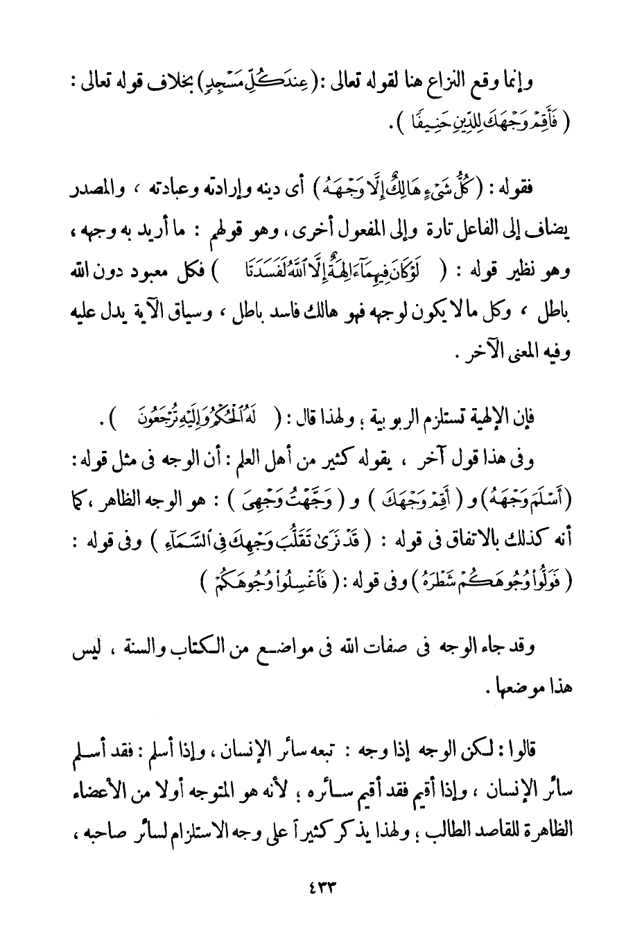 وَإِنَّمَا وَقَعَ النِّزَاعُ هُنَا لِقَوْلِهِ تَعَالَى {عِنْدَ كُلِّ مَسْجِدٍ} بِخِلَافِ قَوْله تَعَالَى {فَأَقِمْ وَجْهَكَ لِلدِّينِ حَنِيفًا} . فَقَوْلُهُ: {كُلُّ شَيْءٍ هَالِكٌ إلَّا وَجْهَهُ} أَيْ دِينَهُ وَإِرَادَتَهُ وَعِبَادَتَهُ وَالْمَصْدَرُ يُضَافُ إلَى الْفَاعِلِ تَارَةً وَإِلَى الْمَفْعُولِ أُخْرَى وَهُوَ قَوْلُهُمْ: مَا أُرِيدَ بِهِ وَجْهُهُ وَهُوَ نَظِيرُ قَوْلِهِ: {لَوْ كَانَ فِيهِمَا آلِهَةٌ إلَّا اللَّهُ لَفَسَدَتَا} فَكُلُّ مَعْبُودٍ دُونَ اللَّهِ بَاطِلٌ وَكُلُّ مَا لَا يَكُونُ لِوَجْهِهِ فَهُوَ هَالِكٌ فَاسِدٌ بَاطِلٌ وَسِيَاقُ الْآيَةِ يَدُلُّ عَلَيْهِ وَفِيهِ الْمَعْنَى الْآخَرُ. فَإِنَّ الْإِلَهِيَّةَ تَسْتَلْزِمُ الرُّبُوبِيَّةَ؛ وَلِهَذَا قَالَ: {لَهُ الْحُكْمُ وَإِلَيْهِ تُرْجَعُونَ} . وَفِي هَذَا قَوْلُ آخَرُ يَقُولُهُ كَثِيرٌ مِنْ أَهْلِ الْعِلْمِ: أَنَّ الْوَجْهَ فِي مِثْلِ قَوْلِهِ: أَسْلَمَ وَجْهَهُ وَأَقِمْ وَجْهَك وَوَجَّهْت وجهي: هُوَ الْوَجْهُ الظَّاهِرُ كَمَا أَنَّهُ كَذَلِكَ بِالِاتِّفَاقِ فِي قَوْلِهِ: {قَدْ نَرَى تَقَلُّبَ وَجْهِكَ فِي السَّمَاءِ} وَفِي قَوْلِهِ: {فَوَلُّوا وُجُوهَكُمْ شَطْرَهُ} وَفِي قَوْلِهِ: {فَاغْسِلُوا وُجُوهَكُمْ} وَقَدْ جَاءَ الْوَجْهُ فِي صِفَاتِ اللَّهِ فِي مَوَاضِعَ مِنْ الْكِتَابِ وَالسُّنَّةِ لَيْسَ هَذَا مَوْضِعَهَا. قَالُوا: لَكِنَّ الْوَجْهَ إذَا وُجِّهَ: تَبِعَهُ سَائِرُ الْإِنْسَانِ وَإِذَا أُسْلِمَ: فَقَدْ أُسْلِمَ سَائِرُ الْإِنْسَانِ وَإِذَا أُقِيمَ فَقَدْ أُقِيمَ سَائِرُهُ؛ لِأَنَّهُ هُوَ الْمُتَوَجِّهُ أَوَّلًا مِنْ الْأَعْضَاءِ الظَّاهِرَةِ لِلْقَاصِدِ الطَّالِبِ؛ وَلِهَذَا يُذْكَرُ كَثِيرًا عَلَى وَجْهِ الِاسْتِلْزَامِ لِسَائِرِ صَاحِبِهِ،