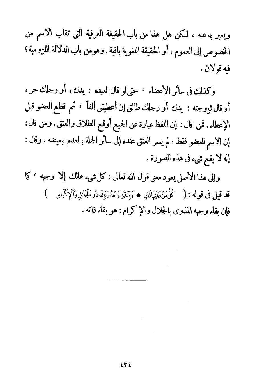 وَيُعَبَّرُ بِهِ عَنْهُ لَكِنْ هَلْ هَذَا مِنْ بَابِ الْحَقِيقَةِ الْعُرْفِيَّةِ الَّتِي تَقْلِبُ الِاسْمَ مِنْ الْخُصُوصِ إلَى الْعُمُومِ أَوْ الْحَقِيقَةُ اللُّغَوِيَّةُ بَاقِيَةٌ وَهُوَ مِنْ بَابِ الدَّلَالَةِ اللُّزُومِيَّةِ؟ فِيهِ قَوْلَانِ. وَكَذَلِكَ فِي سَائِرِ الْأَعْضَاءِ حَتَّى لَوْ قَالَ لِعَبْدِهِ: يَدُك أَوْ رِجْلُك حُرٌّ أَوْ قَالَ لِزَوْجَتِهِ: يَدُك أَوْ رِجْلُك طَالِقٌ إنْ أَعْطَيْتِنِي أَلْفًا ثُمَّ قَطَعَ الْعُضْوَ قَبْلَ الْإِعْطَاءِ. فَمَنْ قَالَ: إنَّ اللَّفْظَ عِبَارَةٌ عَنْ الْجَمِيعِ أَوْقَعَ الطَّلَاقَ وَالْعِتْقَ. وَمَنْ قَالَ: إنَّ الِاسْمَ لِلْعُضْوِ فَقَطْ لَمْ يَسْرِ الْعِتْقُ عِنْدَهُ إلَى سَائِرِ الْجُمْلَةِ؛ لِعَدَمِ تَبْعِيضِهِ. وَقَالَ: إنَّهُ لَا يَقَعُ شَيْءٌ فِي هَذِهِ الصُّورَةِ. وَإِلَى هَذَا الْأَصْلِ يَعُودُ مَعْنَى قَوْلِ مَنْ قَالَ: كُلُّ شَيْءٍ هَالِكٌ إلَّا وَجْهَهُ كَمَا قَدْ قِيلَ فِي قَوْلِهِ: {كُلُّ مَنْ عَلَيْهَا فَانٍ} {وَيَبْقَى وَجْهُ رَبِّكَ ذُو الْجَلَالِ وَالْإِكْرَامِ} فَإِنَّ بَقَاءَ وَجْهِهِ الْمُذْوَى بِالْجَلَالِ وَالْإِكْرَامِ: هُوَ بَقَاءُ ذَاتِهِ.