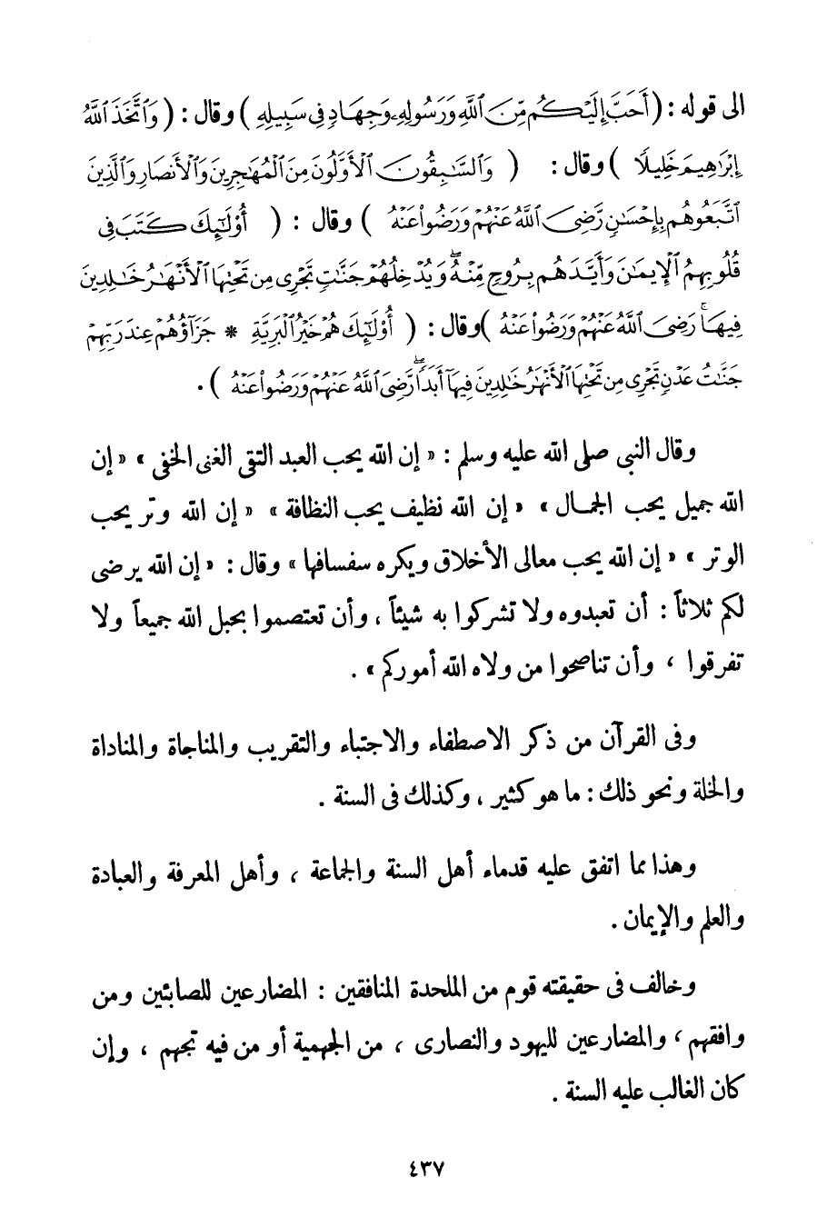 إلَى قَوْلِهِ: {أَحَبَّ إلَيْكُمْ مِنَ اللَّهِ وَرَسُولِهِ وَجِهَادٍ فِي سَبِيلِهِ} وَقَالَ: {وَاتَّخَذَ اللَّهُ إبْرَاهِيمَ خَلِيلًا} وَقَالَ: {وَالسَّابِقُونَ الْأَوَّلُونَ مِنَ الْمُهَاجِرِينَ وَالْأَنْصَارِ وَالَّذِينَ اتَّبَعُوهُمْ بِإِحْسَانٍ رَضِيَ اللَّهُ عَنْهُمْ وَرَضُوا عَنْهُ} وَقَالَ: {أُولَئِكَ كَتَبَ فِي قُلُوبِهِمُ الْإِيمَانَ وَأَيَّدَهُمْ بِرُوحٍ مِنْهُ وَيُدْخِلُهُمْ جَنَّاتٍ تَجْرِي مِنْ تَحْتِهَا الْأَنْهَارُ خَالِدِينَ فِيهَا رَضِيَ اللَّهُ عَنْهُمْ وَرَضُوا عَنْهُ} وَقَالَ: {أُولَئِكَ هُمْ خَيْرُ الْبَرِيَّةِ} {جَزَاؤُهُمْ عِنْدَ رَبِّهِمْ جَنَّاتُ عَدْنٍ تَجْرِي مِنْ تَحْتِهَا الْأَنْهَارُ خَالِدِينَ فِيهَا أَبَدًا رَضِيَ اللَّهُ عَنْهُمْ وَرَضُوا عَنْهُ} . وَقَالَ النَّبِيُّ {: إنَّ اللَّهَ يُحِبُّ الْعَبْدَ التَّقِيَّ الْغَنِيَّ الْخَفِيَّ} {إنَّ اللَّهَ جَمِيلٌ يُحِبُّ الْجَمَالَ} {إنَّ اللَّهَ نَظِيفٌ يُحِبُّ النَّظَافَةَ} {إنَّ اللَّهَ وِتْرٌ يُحِبُّ الْوِتْرَ} {إنَّ اللَّهَ يُحِبُّ مَعَالِيَ الْأَخْلَاقِ وَيَكْرَهُ سَفْسَافَهَا} وَقَالَ: {إنَّ اللَّهَ يَرْضَى لَكُمْ ثَلَاثًا: أَنْ تَعْبُدُوهُ وَلَا تُشْرِكُوا بِهِ شَيْئًا وَأَنْ تَعْتَصِمُوا بِحَبْلِ اللَّهِ جَمِيعًا وَلَا تَفَرَّقُوا وَأَنْ تَنَاصَحُوا مَنْ وَلَّاهُ اللَّهُ أُمُورَكُمْ} . وَفِي الْقُرْآنِ مِنْ ذِكْرِ الِاصْطِفَاءِ وَالِاجْتِبَاءِ وَالتَّقْرِيبِ وَالْمُنَاجَاةِ وَالْمُنَادَاةِ وَالْخِلَّةِ وَنَحْوِ ذَلِكَ: مَا هُوَ كَثِيرٌ وَكَذَلِكَ فِي السُّنَّةِ. وَهَذَا مِمَّا اتَّفَقَ عَلَيْهِ قُدَمَاءُ أَهْلِ السُّنَّةِ وَالْجَمَاعَةِ وَأَهْلِ الْمَعْرِفَةِ وَالْعِبَادَةِ وَالْعِلْمِ وَالْإِيمَانِ. وَخَالَفَ فِي حَقِيقَتِهِ قَوْمٌ مِنْ الْمُلْحِدَةِ الْمُنَافِقِينَ: الْمُضَارِعِينَ لِلصَّابِئِينَ وَمَنْ وَافَقَهُمْ وَالْمُضَارِعِينَ لِلْيَهُودِ وَالنَّصَارَى مِنْ الْجَهْمِيَّة أَوْ مَنْ فِيهِ تَجَهُّمٌ وَإِنْ كَانَ الْغَالِبُ عَلَيْهِ السُّنَّةُ.