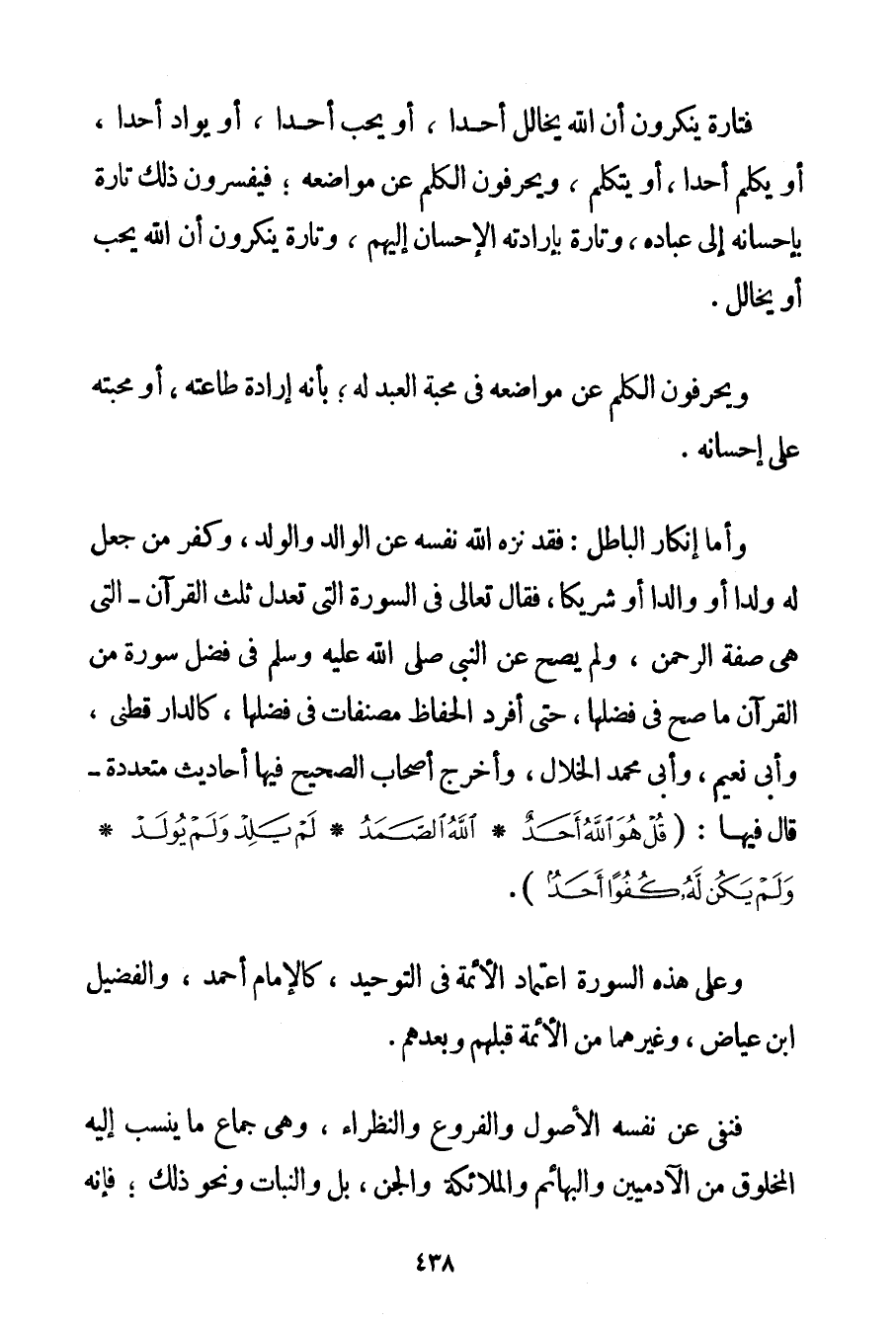 فَتَارَةً يُنْكِرُونَ أَنَّ اللَّهَ يخالل أَحَدًا أَوْ يُحِبُّ أَحَدًا أَوْ يُوَادُّ أَحَدًا أَوْ يُكَلِّمُ أَحَدًا أَوْ يَتَكَلَّمُ وَيُحَرِّفُونَ الْكَلِمَ عَنْ مَوَاضِعِهِ؛ فَيُفَسِّرُونَ ذَلِكَ تَارَةً بِإِحْسَانِهِ إلَى عِبَادِهِ وَتَارَةً بِإِرَادَتِهِ الْإِحْسَانَ إلَيْهِمْ وَتَارَةً يُنْكِرُونَ أَنَّ اللَّهَ يُحِبُّ أَوْ يخالل. وَيُحَرِّفُونَ الْكَلِمَ عَنْ مَوَاضِعِهِ فِي مَحَبَّةِ الْعَبْدِ لَهُ؛ بِأَنَّهُ إرَادَةُ طَاعَتِهِ أَوْ مَحَبَّتُهُ عَلَى إحْسَانِهِ. وَأَمَّا إنْكَارُ الْبَاطِلِ: فَقَدْ نَزَّهَ اللَّهُ نَفْسَهُ عَنْ الْوَالِدِ وَالْوَلَدِ وَكَفَّرَ مَنْ جَعَلَ لَهُ وَلَدًا أَوْ وَالِدًا أَوْ شَرِيكًا فَقَالَ تَعَالَى فِي السُّورَةِ الَّتِي تَعْدِلُ ثُلُثَ الْقُرْآنِ - الَّتِي هِيَ صِفَةُ الرَّحْمَنِ وَلَمْ يَصِحَّ عَنْ النَّبِيِّ صَلَّى اللَّهُ عَلَيْهِ وَسَلَّمَ فِي فَضْلِ سُورَةٍ مِنْ الْقُرْآنِ مَا صَحَّ فِي فَضْلِهَا حَتَّى أَفْرَدَ الْحُفَّاظُ مُصَنَّفَاتٍ فِي فَضْلِهَا كَالدَّارَقُطْنِىِّ وَأَبِي نُعَيْمٍ وَأَبِي مُحَمَّدٍ الْخَلَّالِ وَأَخْرَجَ أَصْحَابُ الصَّحِيحِ فِيهَا أَحَادِيثَ مُتَعَدِّدَةً - قَالَ فِيهَا: {قُلْ هُوَ اللَّهُ أَحَدٌ} {اللَّهُ الصَّمَدُ} {لَمْ يَلِدْ وَلَمْ يُولَدْ} {وَلَمْ يَكُنْ لَهُ كُفُوًا أَحَدٌ} . وَعَلَى هَذِهِ السُّورَةِ اعْتِمَادُ الْأَئِمَّةِ فِي التَّوْحِيدِ كَالْإِمَامِ أَحْمَدَ والْفُضَيْل بْنِ عِيَاضٍ وَغَيْرِهِمَا مِنْ الْأَئِمَّةِ قَبْلَهُمْ وَبَعْدَهُمْ. فَنَفَى عَنْ نَفْسِهِ الْأُصُولَ وَالْفُرُوعَ وَالنُّظَرَاءَ وَهِيَ جِمَاعُ مَا يُنْسَبُ إلَيْهِ الْمَخْلُوقُ مِنْ الْآدَمِيِّينَ وَالْبَهَائِمِ وَالْمَلَائِكَةِ وَالْجِنِّ بَلْ وَالنَّبَاتِ وَنَحْوِ ذَلِكَ؛ فَإِنَّهُ