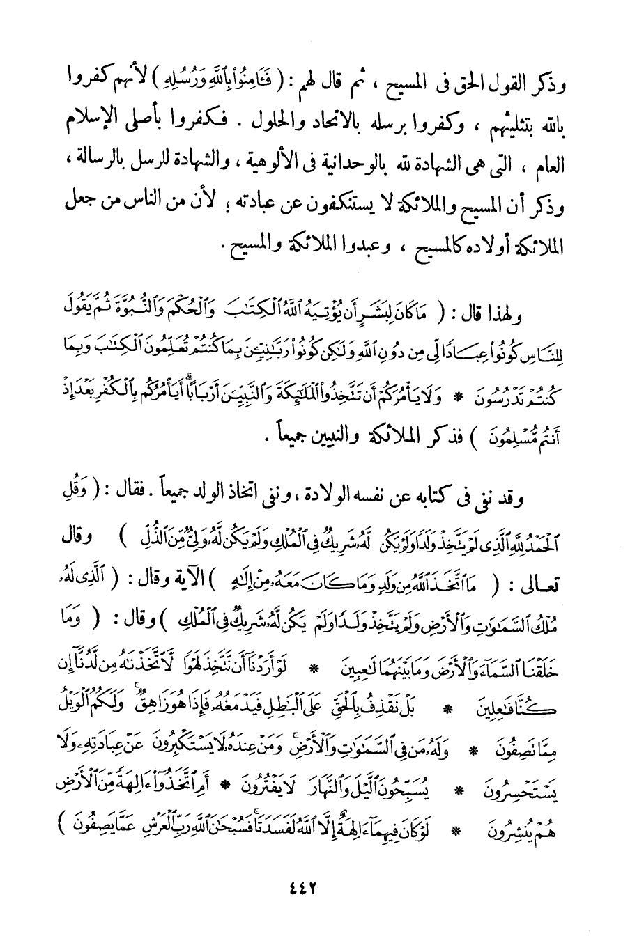 وَلِهَذَا قَالَ: {مَا كَانَ لِبَشَرٍ أَنْ يُؤْتِيَهُ اللَّهُ الْكِتَابَ وَالْحُكْمَ وَالنُّبُوَّةَ ثُمَّ يَقُولَ لِلنَّاسِ كُونُوا عِبَادًا لِي مِنْ دُونِ اللَّهِ وَلَكِنْ كُونُوا رَبَّانِيِّينَ بِمَا كُنْتُمْ تُعَلِّمُونَ الْكِتَابَ وَبِمَا كُنْتُمْ تَدْرُسُونَ} {وَلَا يَأْمُرَكُمْ أَنْ تَتَّخِذُوا الْمَلَائِكَةَ وَالنَّبِيِّينَ أَرْبَابًا أَيَأْمُرُكُمْ بِالْكُفْرِ بَعْدَ إذْ أَنْتُمْ مُسْلِمُونَ} فَذَكَرَ الْمَلَائِكَةَ وَالنَّبِيِّينَ جَمِيعًا. وَقَدْ نَفَى فِي كِتَابِهِ عَنْ نَفْسِهِ الْوِلَادَةَ وَنَفَى اتِّخَاذَ الْوَلَدِ جَمِيعًا. فَقَالَ: {وَقُلِ الْحَمْدُ لِلَّهِ الَّذِي لَمْ يَتَّخِذْ وَلَدًا وَلَمْ يَكُنْ لَهُ شَرِيكٌ فِي الْمُلْكِ وَلَمْ يَكُنْ لَهُ وَلِيٌّ مِنَ الذُّلِّ} وَقَالَ تَعَالَى: {مَا اتَّخَذَ اللَّهُ مِنْ وَلَدٍ وَمَا كَانَ مَعَهُ مِنْ إلَهٍ} الْآيَةَ وَقَالَ: {الَّذِي لَهُ مُلْكُ السَّمَاوَاتِ وَالْأَرْضِ وَلَمْ يَتَّخِذْ وَلَدًا وَلَمْ يَكُنْ لَهُ شَرِيكٌ فِي الْمُلْكِ} وَقَالَ: {وَمَا خَلَقْنَا السَّمَاءَ وَالْأَرْضَ وَمَا بَيْنَهُمَا لَاعِبِينَ} {لَوْ أَرَدْنَا أَنْ نَتَّخِذَ لَهْوًا لَاتَّخَذْنَاهُ مِنْ لَدُنَّا إنْ كُنَّا فَاعِلِينَ} {بَلْ نَقْذِفُ بِالْحَقِّ عَلَى الْبَاطِلِ فَيَدْمَغُهُ فَإِذَا هُوَ زَاهِقٌ وَلَكُمُ الْوَيْلُ مِمَّا تَصِفُونَ} {وَلَهُ مَنْ فِي السَّمَاوَاتِ وَالْأَرْضِ وَمَنْ عِنْدَهُ لَا يَسْتَكْبِرُونَ عَنْ عِبَادَتِهِ وَلَا يَسْتَحْسِرُونَ} {يُسَبِّحُونَ اللَّيْلَ وَالنَّهَارَ لَا يَفْتُرُونَ} {أَمِ اتَّخَذُوا آلِهَةً
