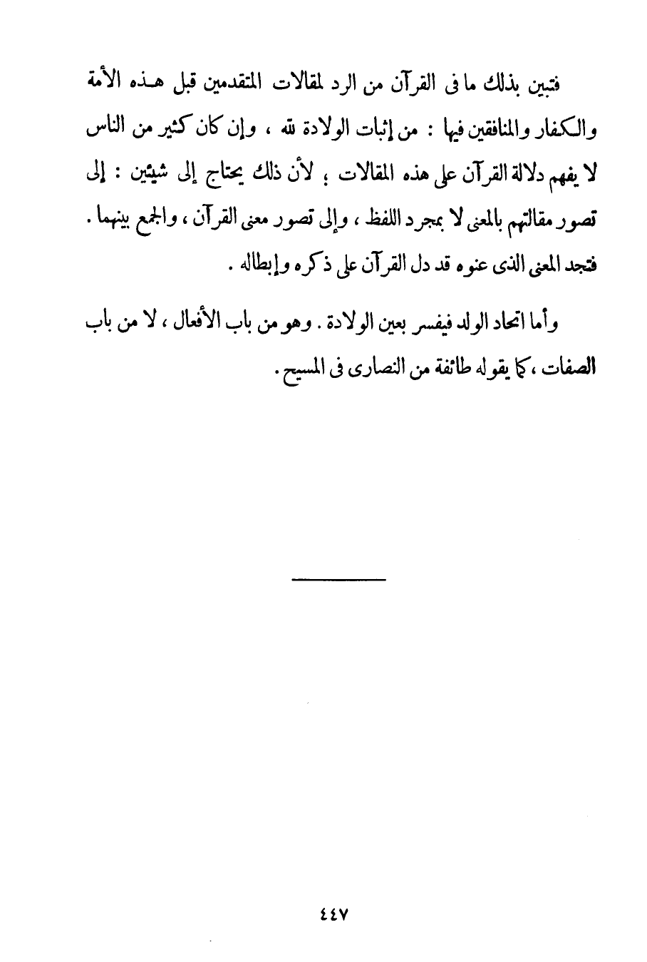 فَتَبَيَّنَ بِذَلِكَ مَا فِي الْقُرْآنِ مِنْ الرَّدِّ لِمَقَالَاتِ الْمُتَقَدِّمِينَ قَبْلَ هَذِهِ الْأُمَّةِ وَالْكُفَّارِ وَالْمُنَافِقِينَ فِيهَا: مِنْ إثْبَاتِ الْوِلَادَةِ لِلَّهِ وَإِنْ كَانَ كَثِيرٌ مِنْ النَّاسِ لَا يَفْهَمُ دَلَالَةَ الْقُرْآنِ عَلَى هَذِهِ الْمَقَالَاتِ؛ لِأَنَّ ذَلِكَ يَحْتَاجُ إلَى شَيْئَيْنِ: إلَى تَصَوُّرِ مَقَالَتِهِمْ بِالْمَعْنَى لَا بِمُجَرَّدِ اللَّفْظِ وَإِلَى تَصَوُّرِ مَعْنَى الْقُرْآنِ وَالْجَمْعِ بَيْنَهُمَا. فَتَجِدُ الْمَعْنَى الَّذِي عَنَوْهُ قَدْ دَلَّ الْقُرْآنُ عَلَى ذِكْرِهِ وَإِبْطَالِهِ. وَأَمَّا اتِّحَادُ الْوَلَدِ فَيُفَسَّرُ بِعَيْنِ الْوِلَادَةِ. وَهُوَ مِنْ بَابِ الْأَفْعَالِ لَا مِنْ بَابِ الصِّفَاتِ كَمَا يَقُولُهُ طَائِفَةٌ مِنْ النَّصَارَى فِي الْمَسِيحِ.