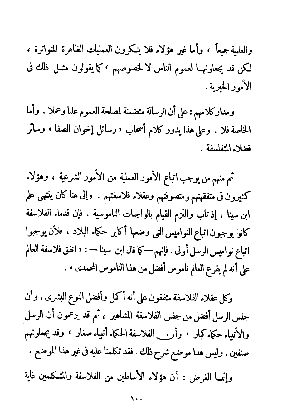 وَالْعِلْمِيَّةِ جَمِيعًا وَأَمَّا غَيْرُ هَؤُلَاءِ فَلَا يُنْكِرُونَ الْعَمَلِيَّاتِ الظَّاهِرَةَ الْمُتَوَاتِرَةَ لَكِنْ قَدْ يَجْعَلُونَهَا لِعُمُومِ النَّاسِ لَا لِخُصُوصِهِمْ كَمَا يَقُولُونَ مِثْلَ ذَلِكَ فِي الْأُمُورِ الْخَبَرِيَّةِ. وَمَدَارُ كَلَامِهِمْ: عَلَى أَنَّ الرِّسَالَةَ مُتَضَمِّنَةٌ لِمَصْلَحَةِ الْعُمُومِ عِلْمًا وَعَمَلًا. وَأَمَّا الْخَاصَّةُ فَلَا. وَعَلَى هَذَا يَدُورُ كَلَامُ أَصْحَابِ " رَسَائِلِ إخْوَانِ الصَّفَا " وَسَائِرِ فُضَلَاءِ الْمُتَفَلْسِفَةِ. ثُمَّ مِنْهُمْ مَنْ يُوجِبُ اتِّبَاعَ الْأُمُورِ الْعَمَلِيَّةِ مِنْ الْأُمُورِ الشَّرْعِيَّةِ وَهَؤُلَاءِ كَثِيرُونَ فِي مُتَفَقِّهَتِهِمْ ومتصوفتهم وَعُقَلَاءِ فَلَاسِفَتِهِمْ. وَإِلَى هُنَا كَانَ يَنْتَهِي عِلْمُ ابْنِ سِينَا إذْ تَابَ وَالْتَزَمَ الْقِيَامَ بِالْوَاجِبَاتِ الناموسية. فَإِنَّ قُدَمَاءَ الْفَلَاسِفَةِ كَانُوا يُوجِبُونَ اتِّبَاعَ النَّوَامِيسِ الَّتِي وَضَعَهَا أَكَابِرُ حُكَمَاءِ الْبِلَادِ فَلِأَنْ يُوجِبُوا اتِّبَاعَ نَوَامِيسَ الرُّسُلِ أَوْلَى. فَإِنَّهُمْ - كَمَا قَالَ ابْنُ سِينَا -: " اتَّفَقَ فَلَاسِفَةُ الْعَالَمِ عَلَى أَنَّهُ لَمْ يَقْرَعْ الْعَالَمَ نَامُوسٌ أَفْضَلُ مِنْ هَذَا النَّامُوسِ الْمُحَمَّدِيِّ ".