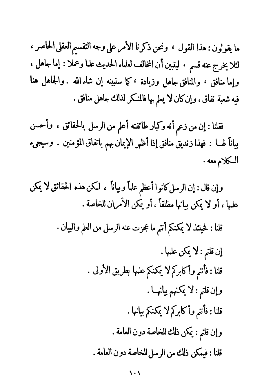 مَا يَقُولُونَ: هَذَا الْقَوْلُ وَنَحْنُ ذَكَرْنَا الْأَمْرَ عَلَى وَجْهِ التَّقْسِيمِ الْعَقْلِيِّ الْحَاصِرِ لِئَلَّا يَخْرُجَ عَنْهُ قِسْمٌ لِيَتَبَيَّنَ أَنَّ الْمُخَالِفَ لِعُلَمَاءِ الْحَدِيثِ عِلْمًا وَعَمَلًا: إمَّا جَاهِلٌ وَإِمَّا مُنَافِقٌ وَالْمُنَافِقُ جَاهِلٌ وَزِيَادَةً كَمَا سَنُبَيِّنُهُ إنْ شَاءَ اللَّهُ. وَالْجَاهِلُ هُنَا فِيهِ شُعْبَةُ نِفَاقٍ وَإِنْ كَانَ لَا يَعْلَمُ بِهَا فَالْمُنْكِرُ لِذَلِكَ جَاهِلٌ مُنَافِقٌ. فَقُلْنَا: إنَّ مَنْ زَعَمَ أَنَّهُ وَكِبَارَ طَائِفَتِهِ أَعْلَمُ مِنْ الرُّسُلِ بِالْحَقَائِقِ وَأَحْسَنُ بَيَانًا لَهَا: فَهَذَا زِنْدِيقٌ مُنَافِقٌ إذَا أَظْهَرَ الْإِيمَانَ بِهِمْ بِاتِّفَاقِ الْمُؤْمِنِينَ. وَسَيَجِيءُ الْكَلَامُ مَعَهُ. وَإِنْ قَالَ: إنَّ الرُّسُلَ كَانُوا أَعْظَمَ عِلْمًا وَبَيَانًا لَكِنَّ هَذِهِ الْحَقَائِقَ لَا يُمْكِنُ عِلْمُهَا أَوْ لَا يُمْكِنُ بَيَانُهَا مُطْلَقًا أَوْ يُمْكِنُ الْأَمْرَانِ لِلْخَاصَّةِ. قُلْنَا: فَحِينَئِذٍ لَا يُمْكِنُكُمْ أَنْتُمْ مَا عَجَزَتْ عَنْهُ الرُّسُلُ مِنْ الْعِلْمِ وَالْبَيَانِ. إنْ قُلْتُمْ: لَا يُمْكِنُ عِلْمُهَا. قُلْنَا: فَأَنْتُمْ وَأَكَابِرُكُمْ لَا يُمْكِنُكُمْ عِلْمُهَا بِطَرِيقِ الْأَوْلَى. وَإِنْ قُلْتُمْ: لَا يُمْكِنُهُمْ بَيَانُهَا. قُلْنَا: فَأَنْتُمْ وَأَكَابِرُكُمْ لَا يُمْكِنُكُمْ بَيَانُهَا. وَإِنْ قُلْتُمْ: يُمْكِنُ ذَلِكَ لِلْخَاصَّةِ دُونَ الْعَامَّةِ. قُلْنَا: فَيُمْكِنُ ذَلِكَ مِنْ الرُّسُلِ لِلْخَاصَّةِ دُونَ الْعَامَّةِ.
