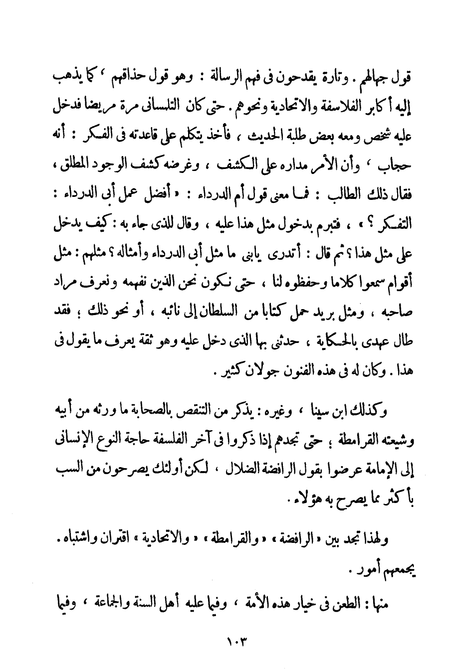 قَوْلُ جُهَّالِهِمْ. وَتَارَةً يَقْدَحُونَ فِي فَهْمِ الرِّسَالَةِ: وَهُوَ قَوْلُ حُذَّاقِهِمْ كَمَا يَذْهَبُ إلَيْهِ أَكَابِرُ الْفَلَاسِفَةِ والاتحادية وَنَحْوِهِمْ. حَتَّى كَانَ التلمساني مَرَّةً مَرِيضًا فَدَخَلَ عَلَيْهِ شَخْصٌ وَمَعَهُ بَعْضُ طَلَبَةِ الْحَدِيثِ فَأَخَذَ يَتَكَلَّمُ عَلَى قَاعِدَتِهِ فِي الْفِكْرِ: أَنَّهُ حِجَابٌ وَأَنَّ الْأَمْرَ مَدَارُهُ عَلَى الْكَشْفِ وَغَرَضُهُ كَشْفُ الْوُجُودِ الْمُطْلَقِ فَقَالَ ذَلِكَ الطَّالِبُ: فَمَا مَعْنَى قَوْلِ أُمِّ الدَّرْدَاءِ: " أَفْضَلُ عَمَلِ أَبِي الدَّرْدَاءِ: التَّفَكُّرُ؟ " فَتَبَرَّمَ بِدُخُولِ مِثْلِ هَذَا عَلَيْهِ وَقَالَ لِلَّذِي جَاءَ بِهِ: كَيْفَ يَدْخُلُ عَلَيَّ مِثْلُ هَذَا؟ ثُمَّ قَالَ: أَتَدْرِي يَا بُنَيَّ مَا مِثْلُ أَبِي الدَّرْدَاءِ وَأَمْثَالِهِ؟ مَثَلُهُمْ: مَثَلُ أَقْوَامٍ سَمِعُوا كَلَامًا وَحَفِظُوهُ لَنَا حَتَّى نَكُونَ نَحْنُ الَّذِينَ نَفْهَمُهُ وَنَعْرِفُ مُرَادَ صَاحِبِهِ وَمَثَلُ بَرِيدٍ حَمَلَ كِتَابًا مِنْ السُّلْطَانِ إلَى نَائِبِهِ أَوْ نَحْوَ ذَلِكَ؛ فَقَدْ طَالَ عَهْدِي بِالْحِكَايَةِ حَدَّثَنِي بِهَا الَّذِي دَخَلَ عَلَيْهِ وَهُوَ ثِقَةٌ يَعْرِفُ مَا يَقُولُ فِي هَذَا. وَكَانَ لَهُ فِي هَذِهِ الْفُنُونِ جَوَلَانٌ كَثِيرٌ. وَكَذَلِكَ ابْنُ سِينَا وَغَيْرُهُ: يَذْكُرُ مِنْ التَّنَقُّصِ بِالصَّحَابَةِ مَا وَرِثَهُ مِنْ أَبِيهِ وَشِيعَتِهِ الْقَرَامِطَةِ؛ حَتَّى تَجِدَهُمْ إذَا ذَكَرُوا فِي آخِرِ الْفَلْسَفَةِ حَاجَةَ النَّوْعِ الْإِنْسَانِيِّ إلَى الْإِمَامَةِ عَرَّضُوا بِقَوْلِ الرَّافِضَةِ الضُّلَّالِ لَكِنَّ أُولَئِكَ يُصَرِّحُونَ مِنْ السَّبِّ بِأَكْثَرِ مِمَّا يُصَرِّحُ بِهِ هَؤُلَاءِ.