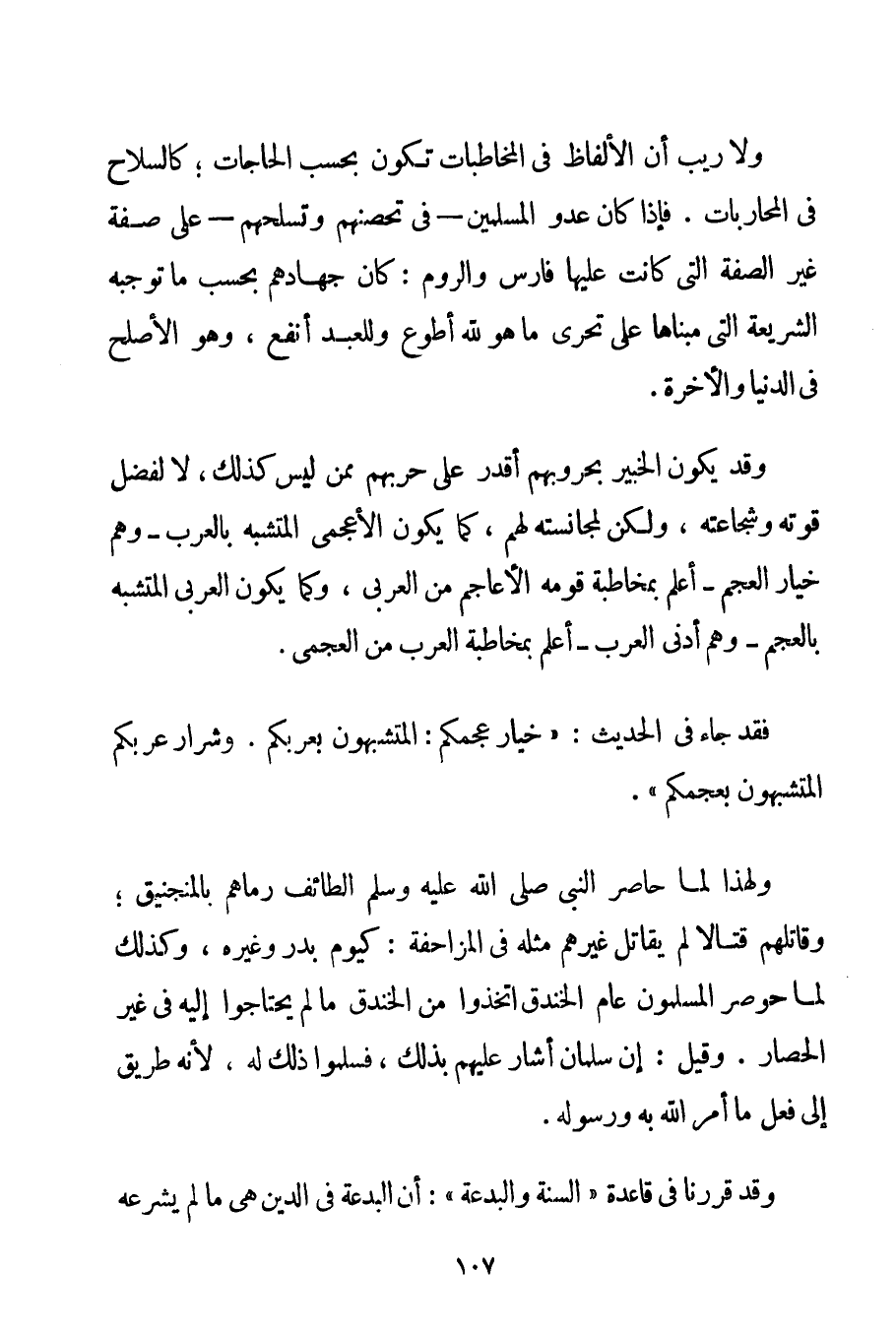 وَلَا رَيْبَ أَنَّ الْأَلْفَاظَ فِي الْمُخَاطَبَاتِ تَكُونُ بِحَسَبِ الْحَاجَاتِ؛ كَالسِّلَاحِ فِي الْمُحَارَبَاتِ. فَإِذَا كَانَ عَدُوُّ الْمُسْلِمِينَ - فِي تَحَصُّنِهِمْ وَتَسَلُّحِهِمْ - عَلَى صِفَةٍ غَيْرِ الصِّفَةِ الَّتِي كَانَتْ عَلَيْهَا فَارِسُ وَالرُّومُ: كَانَ جِهَادُهُمْ بِحَسَبِ مَا تُوجِبُهُ الشَّرِيعَةُ الَّتِي مَبْنَاهَا عَلَى تَحَرِّي مَا هُوَ لِلَّهِ أَطْوَعُ وَلِلْعَبْدِ أَنْفَعُ وَهُوَ الْأَصْلَحُ فِي الدُّنْيَا وَالْآخِرَةِ. وَقَدْ يَكُونُ الْخَبِيرُ بِحُرُوبِهِمْ أَقْدَرُ عَلَى حَرْبِهِمْ مِمَّنْ لَيْسَ كَذَلِكَ لَا لِفَضْلِ قُوَّتِهِ وَشَجَاعَتِهِ وَلَكِنْ لِمُجَانَسَتِهِ لَهُمْ كَمَا يَكُونُ الْأَعْجَمِيُّ الْمُتَشَبِّهُ بِالْعَرَبِ - وَهُمْ خِيَارُ الْعَجَمِ - أَعْلَمَ بِمُخَاطَبَةِ قَوْمِهِ الْأَعَاجِمِ مِنْ الْعَرَبِيِّ وَكَمَا يَكُونُ الْعَرَبِيُّ الْمُتَشَبِّهُ بِالْعَجَمِ - وَهُمْ أَدْنَى الْعَرَبِ - أَعْلَمَ بِمُخَاطَبَةِ الْعَرَبِ مِنْ الْعَجَمِيِّ. فَقَدْ جَاءَ فِي الْحَدِيثِ: {خِيَارُ عَجَمِكُمْ: الْمُتَشَبِّهُونَ بِعَرِبِكُمْ. وَشِرَارُ عَرِبِكُمْ الْمُتَشَبِّهُونَ بِعَجَمِكُمْ} . وَلِهَذَا لَمَّا حَاصَرَ النَّبِيُّ صَلَّى اللَّهُ عَلَيْهِ وَسَلَّمَ الطَّائِفَ رَمَاهُمْ بِالْمَنْجَنِيقِ؛ وَقَاتَلَهُمْ قِتَالًا لَمْ يُقَاتِلْ غَيْرَهُمْ مِثْلَهُ فِي الْمُزَاحَفَةِ: كَيَوْمِ بَدْرٍ وَغَيْرِهِ وَكَذَلِكَ لَمَّا حُوصِرَ الْمُسْلِمُونَ عَامَ الْخَنْدَقِ اتَّخَذُوا مِنْ الْخَنْدَقِ مَا لَمْ يَحْتَاجُوا إلَيْهِ فِي غَيْرِ الْحِصَارِ. وَقِيلَ: إنَّ سَلْمَانَ أَشَارَ عَلَيْهِمْ بِذَلِكَ فَسَلَّمُوا ذَلِكَ لَهُ لِأَنَّهُ طَرِيقٌ إلَى فِعْلِ مَا أَمَرَ اللَّهُ بِهِ وَرَسُولُهُ.