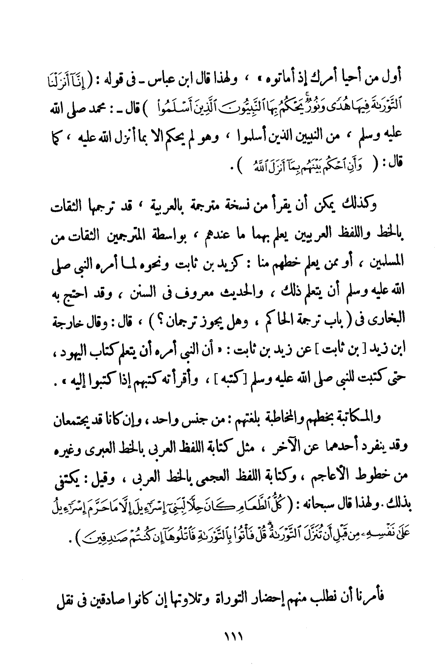 أَوَّلُ مَنْ أَحْيَا أَمْرَك إذْ أَمَاتُوهُ} وَلِهَذَا قَالَ ابْنُ عَبَّاسٍ - فِي قَوْلِهِ: {إنَّا أَنْزَلْنَا التَّوْرَاةَ فِيهَا هُدًى وَنُورٌ يَحْكُمُ بِهَا النَّبِيُّونَ الَّذِينَ أَسْلَمُوا} قَالَ -: مُحَمَّدٌ صَلَّى اللَّهُ عَلَيْهِ وَسَلَّمَ مِنْ النَّبِيِّينَ الَّذِينَ أَسْلَمُوا وَهُوَ لَمْ يَحْكُمْ إلَّا بِمَا أَنْزَلَ اللَّهُ عَلَيْهِ كَمَا قَالَ: {وَأَنِ احْكُمْ بَيْنَهُمْ بِمَا أَنْزَلَ اللَّهُ} . وَكَذَلِكَ يُمْكِنُ أَنْ يَقْرَأَ مِنْ نُسْخَةٍ مُتَرْجَمَةٍ بِالْعَرَبِيَّةِ قَدْ تَرْجَمَهَا الثِّقَاتُ بِالْخَطِّ وَاللَّفْظِ الْعَرَبِيَّيْنِ يَعْلَمُ بِهِمَا مَا عِنْدَهُمْ بِوَاسِطَةِ الْمُتَرْجِمِينَ الثِّقَاتِ مِنْ الْمُسْلِمِينَ أَوْ مِمَّنْ يَعْلَمُ خَطَّهُمْ مِنَّا: كَزَيْدِ بْنِ ثَابِتٍ وَنَحْوِهِ لَمَّا أَمَرَهُ النَّبِيُّ صَلَّى اللَّهُ عَلَيْهِ وَسَلَّمَ أَنْ يَتَعَلَّمَ ذَلِكَ وَالْحَدِيثُ مَعْرُوفٌ فِي السُّنَنِ وَقَدْ احْتَجَّ بِهِ الْبُخَارِيُّ فِي (بَابِ تَرْجَمَةِ الْحَاكِمِ وَهَلْ يَجُوزُ تُرْجُمَانٌ؟ قَالَ: وَقَالَ خَارِجَةُ بْنُ زَيْدِ بْنِ ثَابِتٍ {عَنْ زَيْدِ بْنِ ثَابِتٍ: أَنَّ النَّبِيَّ أَمَرَهُ أَنْ يَتَعَلَّمَ كِتَابَ الْيَهُودِ حَتَّى كَتَبْت لِلنَّبِيِّ صَلَّى اللَّهُ عَلَيْهِ وَسَلَّمَ كُتُبَهُ وَأَقْرَأْته كُتُبَهُمْ إذَا كَتَبُوا إلَيْهِ} . وَالْمُكَاتَبَةُ بِخَطِّهِمْ وَالْمُخَاطَبَةُ بِلُغَتِهِمْ: مِنْ جِنْسٍ وَاحِدٍ وَإِنْ كَانَا قَدْ يَجْتَمِعَانِ وَقَدْ يَنْفَرِدُ أَحَدُهُمَا عَنْ الْآخَرِ مِثْلُ كِتَابَةِ اللَّفْظِ الْعَرَبِيِّ بِالْخَطِّ الْعِبْرِيِّ وَغَيْرِهِ مِنْ خُطُوطِ الْأَعَاجِمِ وَكِتَابَةِ اللَّفْظِ الْعَجَمِيِّ بِالْخَطِّ الْعَرَبِيِّ وَقِيلَ: يُكْتَفَى بِذَلِكَ. وَلِهَذَا قَالَ سُبْحَانَهُ: {كُلُّ الطَّعَامِ كَانَ حِلًّا لِبَنِي إسْرَائِيلَ إلَّا مَا حَرَّمَ إسْرَائِيلُ عَلَى نَفْسِهِ مِنْ قَبْلِ أَنْ تُنَزَّلَ التَّوْرَاةُ قُلْ فَأْتُوا بِالتَّوْرَاةِ فَاتْلُوهَا إنْ كُنْتُمْ صَادِقِينَ} . فَأُمِرْنَا أَنْ نَطْلُبَ مِنْهُمْ إحْضَارَ التَّوْرَاةِ وَتِلَاوَتَهَا إنْ كَانُوا صَادِقِينَ فِي نَقْلِ