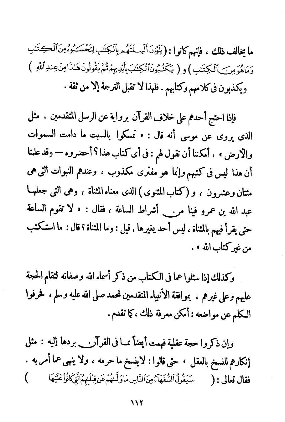 فَإِذَا احْتَجَّ أَحَدُهُمْ عَلَى خِلَافِ الْقُرْآنِ بِرِوَايَةِ عَنْ الرُّسُلِ الْمُتَقَدِّمِينَ مِثْلُ الَّذِي يُرْوَى عَنْ مُوسَى أَنَّهُ قَالَ: " تَمَسَّكُوا بِالسَّبْتِ مَا دَامَتْ السَّمَوَاتُ وَالْأَرْضُ " أَمْكَنَنَا أَنْ نَقُولَ لَهُمْ: فِي أَيِّ كِتَابٍ هَذَا؟ أَحْضِرُوهُ - وَقَدْ عَلِمْنَا أَنَّ هَذَا لَيْسَ فِي كُتُبِهِمْ وَإِنَّمَا هُوَ مُفْتَرًى مَكْذُوبٌ وَعِنْدَهُمْ النُّبُوَّاتُ الَّتِي هِيَ مِئَتَانِ وَعِشْرُونَ و (كِتَابُ الْمَثْنَوِيِّ الَّذِي مَعْنَاهُ الْمُثَنَّاةُ وَهِيَ الَّتِي جَعَلَهَا عَبْدُ اللَّهِ بْنُ عَمْرٍو فِينَا مِنْ أَشْرَاطِ السَّاعَةِ فَقَالَ: " لَا تَقُومُ السَّاعَةُ حَتَّى يُقْرَأَ فِيهِمْ بِالْمُثَنَّاةِ لَيْسَ أَحَدٌ يُغَيِّرُهَا قِيلَ: وَمَا الْمُثَنَّاةُ؟ قَالَ: مَا اُسْتُكْتِبَ مِنْ غَيْرِ كِتَابِ اللَّهِ ". وَكَذَلِكَ إذَا سُئِلُوا عَمَّا فِي الْكِتَابِ مِنْ ذِكْرِ أَسْمَاءِ اللَّهِ وَصِفَاتِهِ لِتُقَامَ الْحُجَّةُ عَلَيْهِمْ وَعَلَى غَيْرِهِمْ بِمُوَافَقَةِ الْأَنْبِيَاءِ الْمُتَقَدِّمِينَ لِمُحَمَّدِ صَلَّى اللَّهُ عَلَيْهِ وَسَلَّمَ فَحَرَّفُوا الْكَلِمَ عَنْ مَوَاضِعِهِ: أَمْكَنَ مَعْرِفَةُ ذَلِكَ كَمَا تَقَدَّمَ. وَإِنْ ذَكَرُوا حُجَّةً عَقْلِيَّةً فُهِمَتْ أَيْضًا مِمَّا فِي الْقُرْآنِ بِرَدِّهَا إلَيْهِ: مِثْلُ إنْكَارِهِمْ لِلنَّسْخِ بِالْعَقْلِ حَتَّى قَالُوا: لَا يُنْسَخُ مَا حَرَّمَهُ وَلَا يُنْهَى عَمَّا أَمَرَ بِهِ. فَقَالَ تَعَالَى: {سَيَقُولُ السُّفَهَاءُ مِنَ النَّاسِ مَا وَلَّاهُمْ عَنْ قِبْلَتِهِمُ الَّتِي كَانُوا عَلَيْهَا}