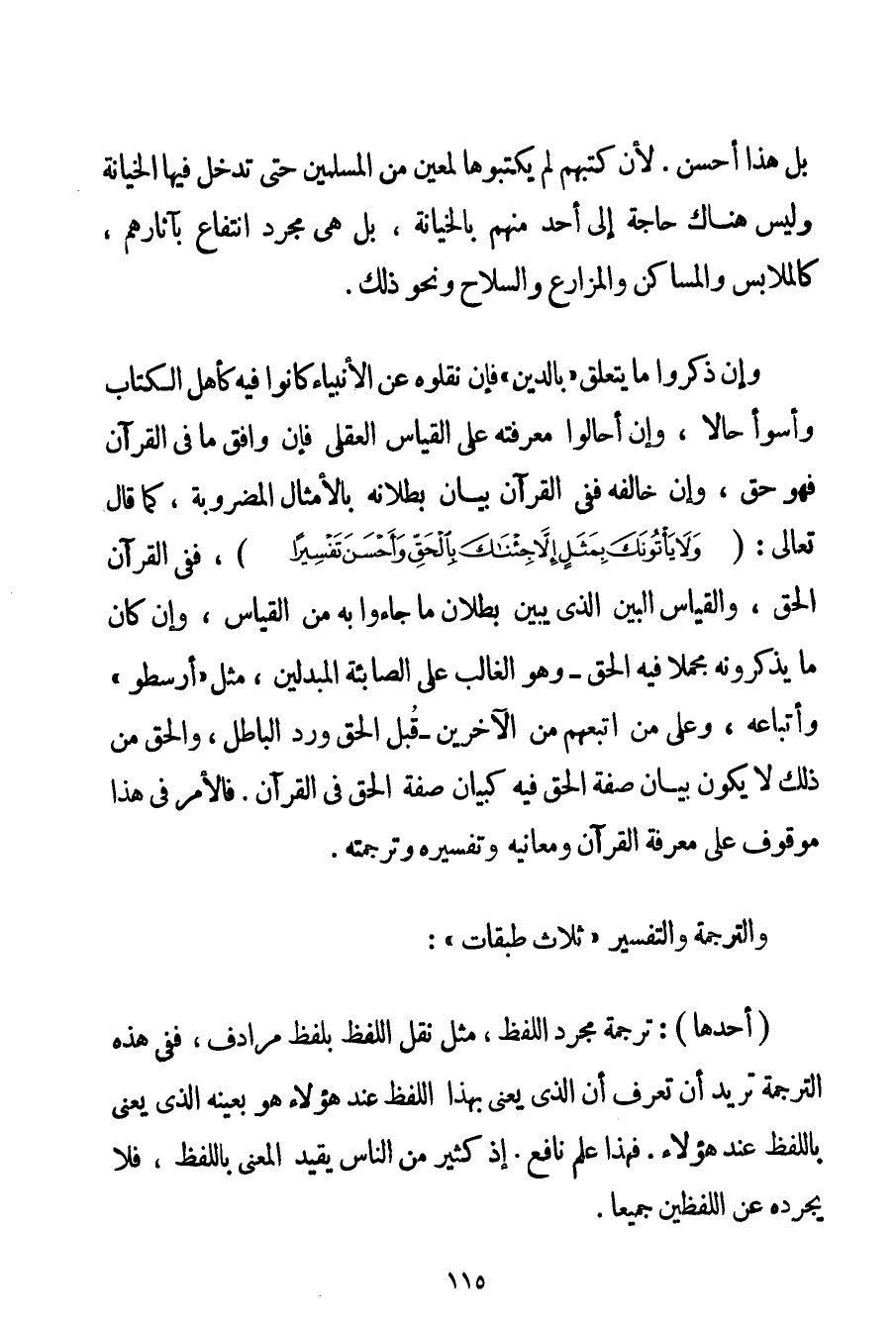 بَلْ هَذَا أَحْسَنُ. لِأَنَّ كُتُبَهُمْ لَمْ يَكْتُبُوهَا لِمُعَيَّنِ مِنْ الْمُسْلِمِينَ حَتَّى تَدْخُلَ فِيهَا الْخِيَانَةُ لَيْسَ هُنَاكَ حَاجَةٌ إلَى أَحَدٍ مِنْهُمْ بِالْخِيَانَةِ بَلْ هِيَ مُجَرَّدُ انْتِفَاعٍ بِآثَارِهِمْ كَالْمَلَابِسِ وَالْمَسَاكِنِ وَالْمَزَارِعِ وَالسِّلَاحِ وَنَحْوِ ذَلِكَ. وَإِنْ ذَكَرُوا مَا يَتَعَلَّقُ " بِالدِّينِ " فَإِنْ نَقَلُوهُ عَنْ الْأَنْبِيَاءِ كَانُوا فِيهِ كَأَهْلِ الْكِتَابِ وَأَسْوَأِ حَالًا وَإِنْ أَحَالُوا مَعْرِفَتَهُ عَلَى الْقِيَاسِ الْعَقْلِيِّ فَإِنْ وَافَقَ مَا فِي الْقُرْآنِ فَهُوَ حَقٌّ وَإِنْ خَالَفَهُ فَفِي الْقُرْآنِ بَيَانُ بُطْلَانِهِ بِالْأَمْثَالِ الْمَضْرُوبَةِ كَمَا قَالَ تَعَالَى: {وَلَا يَأْتُونَكَ بِمَثَلٍ إلَّا جِئْنَاكَ بِالْحَقِّ وَأَحْسَنَ تَفْسِيرًا} فَفِي الْقُرْآنِ الْحَقُّ وَالْقِيَاسُ الْبَيِّنُ الَّذِي يُبَيِّنُ بُطْلَانَ مَا جَاءُوا بِهِ مِنْ الْقِيَاسِ وَإِنْ كَانَ مَا يَذْكُرُونَهُ مُجْمَلًا فِيهِ الْحَقُّ - وَهُوَ الْغَالِبُ عَلَى الصَّابِئَةِ الْمُبَدِّلِينَ مِثْلُ " أَرِسْطُو " وَأَتْبَاعِهِ وَعَلَى مَنْ اتَّبَعَهُمْ مِنْ الْآخَرِينَ - قَبْلَ الْحَقِّ وَرَدِّ الْبَاطِلِ وَالْحَقُّ مِنْ ذَلِكَ لَا يَكُونُ بَيَانُ صِفَةِ الْحَقِّ فِيهِ كَبَيَانِ صِفَةِ الْحَقِّ فِي الْقُرْآنِ. فَالْأَمْرُ فِي هَذَا مَوْقُوفٌ عَلَى مَعْرِفَةِ الْقُرْآنِ وَمَعَانِيهِ وَتَفْسِيرِهِ وَتَرْجَمَتِهِ.