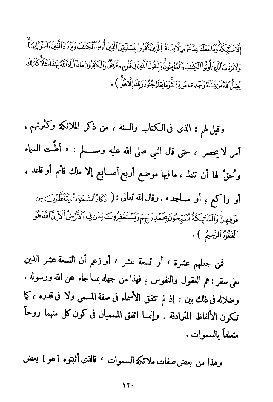 النَّارِ إلَّا مَلَائِكَةً وَمَا جَعَلْنَا عِدَّتَهُمْ إلَّا فِتْنَةً لِلَّذِينَ كَفَرُوا لِيَسْتَيْقِنَ الَّذِينَ أُوتُوا الْكِتَابَ وَيَزْدَادَ الَّذِينَ آمَنُوا إيمَانًا وَلَا يَرْتَابَ الَّذِينَ أُوتُوا الْكِتَابَ وَالْمُؤْمِنُونَ وَلِيَقُولَ الَّذِينَ فِي قُلُوبِهِمْ مَرَضٌ وَالْكَافِرُونَ مَاذَا أَرَادَ اللَّهُ بِهَذَا مَثَلًا كَذَلِكَ يُضِلُّ اللَّهُ مَنْ يَشَاءُ وَيَهْدِي مَنْ يَشَاءُ وَمَا يَعْلَمُ جُنُودَ رَبِّكَ إلَّا هُوَ} . وَقِيلَ لَهُمْ: الَّذِي فِي الْكِتَابِ وَالسُّنَّةِ مِنْ ذِكْرِ الْمَلَائِكَةِ وَكَثْرَتِهِمْ أَمْرٌ لَا يُحْصَرُ حَتَّى قَالَ النَّبِيُّ صَلَّى اللَّهُ عَلَيْهِ وَسَلَّمَ {أَطَّتْ السَّمَاءُ وَحُقَّ لَهَا أَنْ تَئِطَّ مَا فِيهَا مَوْضِعُ أَرْبَعِ أَصَابِعَ إلَّا مَلَكٌ قَائِمٌ أَوْ قَاعِدٌ أَوْ رَاكِعٌ؛ أَوْ سَاجِدٌ} وَقَالَ اللَّهُ تَعَالَى: {تَكَادُ السَّمَاوَاتُ يَتَفَطَّرْنَ مِنْ فَوْقِهِنَّ وَالْمَلَائِكَةُ يُسَبِّحُونَ بِحَمْدِ رَبِّهِمْ وَيَسْتَغْفِرُونَ لِمَنْ فِي الْأَرْضِ أَلَا إنَّ اللَّهَ هُوَ الْغَفُورُ الرَّحِيمُ} . فَمَنْ جَعَلَهُمْ عَشْرَةً أَوْ تِسْعَةَ عَشَرَ أَوْ زَعَمَ أَنَّ التِّسْعَةَ عَشَرَ الَّذِينَ عَلَى سَقَرَ: هُمْ الْعُقُولُ وَالنُّفُوسُ؛ فَهَذَا مِنْ جَهْلِهِ بِمَا جَاءَ عَنْ اللَّهِ وَرَسُولِهِ. وَضَلَالُهُ فِي ذَلِكَ بَيِّنٌ: إذَا لَمْ تَتَّفِقْ الْأَسْمَاءُ فِي صِفَةِ الْمُسَمَّى وَلَا فِي قَدْرِهِ كَمَا تَكُونُ الْأَلْفَاظُ الْمُتَرَادِفَةُ. وَإِنَّمَا اتَّفَقَ الْمُسَمَّيَانِ فِي كَوْنِ كُلٍّ مِنْهُمَا رُوحًا مُتَعَلِّقًا بِالسَّمَوَاتِ. وَهَذَا مِنْ بَعْضِ صِفَاتِ مَلَائِكَةِ السَّمَوَاتِ فَاَلَّذِي أَثْبَتُوهُ هُوَ بَعْضُ
