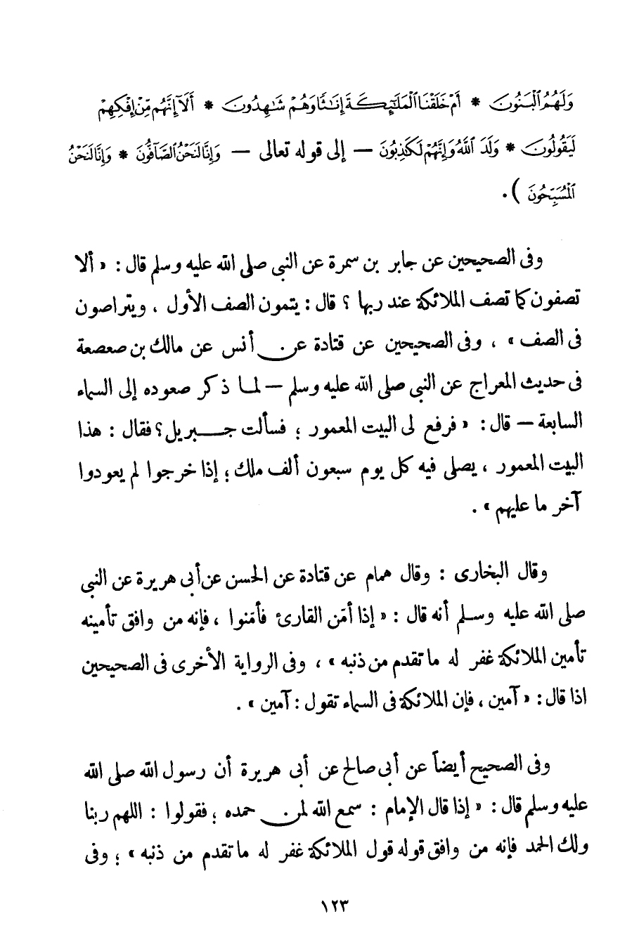 الْبَنَاتُ وَلَهُمُ الْبَنُونَ} {أَمْ خَلَقْنَا الْمَلَائِكَةَ إنَاثًا وَهُمْ شَاهِدُونَ} {أَلَا إنَّهُمْ مِنْ إفْكِهِمْ لَيَقُولُونَ} {وَلَدَ اللَّهُ وَإِنَّهُمْ لَكَاذِبُونَ} - إلَى قَوْله تَعَالَى - {وَإِنَّا لَنَحْنُ الصَّافُّونَ} {وَإِنَّا لَنَحْنُ الْمُسَبِّحُونَ} . وَفِي الصَّحِيحَيْنِ عَنْ جَابِرِ بْنِ سَمُرَةَ عَنْ النَّبِيِّ صَلَّى اللَّهُ عَلَيْهِ وَسَلَّمَ قَالَ: {أَلَا تَصُفُّونَ كَمَا تَصُفُّ الْمَلَائِكَةُ عِنْدَ رَبِّهَا؟ قَالَ: يُتِمُّونَ الصَّفَّ الْأَوَّلَ وَيَتَرَاصُّونَ فِي الصَّفِّ} وَفِي الصَّحِيحَيْنِ عَنْ قتادة عَنْ أَنَسٍ عَنْ مَالِكِ بْنِ صَعْصَعَةَ فِي حَدِيثِ الْمِعْرَاجِ {عَنْ النَّبِيِّ صَلَّى اللَّهُ عَلَيْهِ وَسَلَّمَ - لَمَّا ذَكَرَ صُعُودَهُ إلَى السَّمَاءِ السَّابِعَةِ - قَالَ: فَرُفِعَ لِي الْبَيْتُ الْمَعْمُورُ؛ فَسَأَلْت جِبْرِيلَ؟ فَقَالَ: هَذَا الْبَيْتُ الْمَعْمُورُ يُصَلِّي فِيهِ كُلَّ يَوْمٍ سَبْعُونَ أَلْفَ مَلَكٍ؛ إذَا خَرَجُوا لَمْ يَعُودُوا آخِرَ مَا عَلَيْهِمْ} . وَقَالَ الْبُخَارِيُّ: وَقَالَ هَمَّامٌ عَنْ قتادة عَنْ الْحَسَنِ عَنْ أَبِي هُرَيْرَةَ عَنْ النَّبِيِّ صَلَّى اللَّهُ عَلَيْهِ وَسَلَّمَ أَنَّهُ قَالَ: {إذَا أَمَّنَ الْقَارِئُ فَأَمِّنُوا فَإِنَّهُ مَنْ وَافَقَ تَأْمِينُهُ تَأْمِينَ الْمَلَائِكَةِ غُفِرَ لَهُ مَا تَقَدَّمَ مِنْ ذَنْبِهِ} وَفِي الرِّوَايَةِ الْأُخْرَى فِي الصَّحِيحَيْنِ {إذَا قَالَ: آمِينَ فَإِنَّ الْمَلَائِكَةَ فِي السَّمَاءِ تَقُولُ: آمِينَ} . وَفِي الصَّحِيحِ أَيْضًا عَنْ أَبِي صَالِحٍ عَنْ أَبِي هُرَيْرَةَ أَنَّ رَسُولَ اللَّهِ صَلَّى اللَّهُ عَلَيْهِ وَسَلَّمَ قَالَ: {إذَا قَالَ الْإِمَامُ: سَمِعَ اللَّهُ لِمَنْ حَمِدَهُ؛ فَقُولُوا: اللَّهُمَّ رَبَّنَا وَلَك الْحَمْدُ فَإِنَّهُ مَنْ وَافَقَ قَوْلُهُ قَوْلَ الْمَلَائِكَةِ غُفِرَ لَهُ مَا تَقَدَّمَ مِنْ ذَنْبِهِ} وَفِي