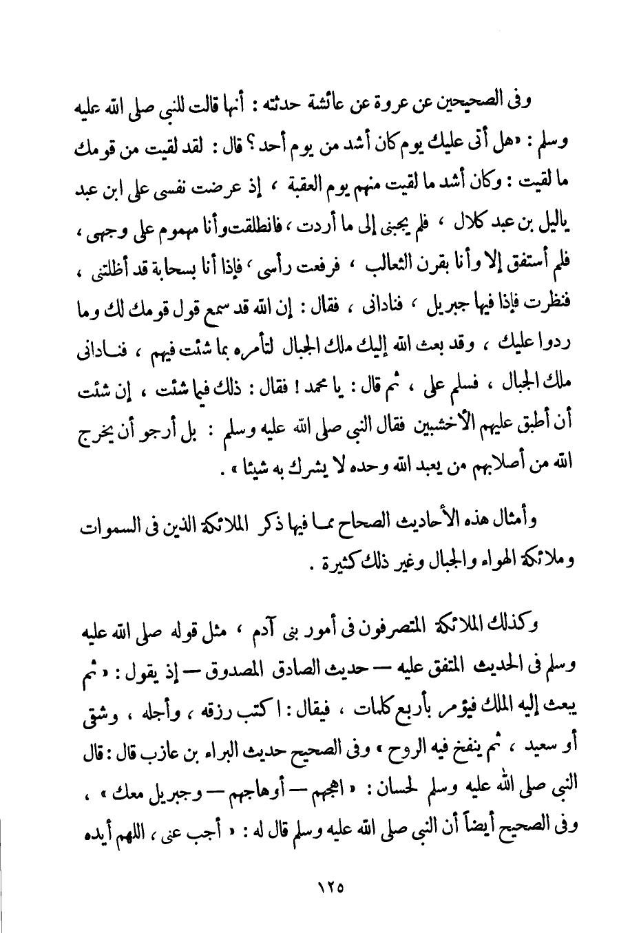 وَفِي الصَّحِيحَيْنِ {عَنْ عُرْوَةَ عَنْ عَائِشَةَ حَدَّثَتْهُ: أَنَّهَا قَالَتْ لِلنَّبِيِّ صَلَّى اللَّهُ عَلَيْهِ وَسَلَّمَ هَلْ أَتَى عَلَيْك يَوْمٌ كَانَ أَشَدَّ مِنْ يَوْمِ أُحُدٍ؟ قَالَ: لَقَدْ لَقِيت مِنْ قَوْمِك مَا لَقِيت: وَكَانَ أَشَدُّ مَا لَقِيت مِنْهُمْ يَوْمَ الْعَقَبَةِ إذْ عَرَضْت نَفْسِي عَلَى ابْنِ عَبْدِ ياليل بْنِ عَبْدِ كلال فَلَمْ يُجِبْنِي إلَى مَا أَرَدْت فَانْطَلَقْت وَأَنَا مَهْمُومٌ عَلَى وَجْهِي فَلَمْ أَسْتَفِقْ إلَّا وَأَنَا بِقَرْنِ الثَّعَالِبِ فَرَفَعْت رَأْسِي فَإِذَا أَنَا بِسَحَابَةِ قَدْ أَظَلَّتْنِي فَنَظَرْت فَإِذَا فِيهَا جِبْرِيلُ فَنَادَانِي فَقَالَ: إنَّ اللَّهَ قَدْ سَمِعَ قَوْلَ قَوْمِك لَك وَمَا رَدُّوا عَلَيْك وَقَدْ بَعَثَ اللَّهُ إلَيْك مَلَكَ الْجِبَالِ لِتَأْمُرَهُ بِمَا شِئْت فِيهِمْ فَنَادَانِي مَلَكُ الْجِبَالِ فَسَلَّمَ عَلَيَّ ثُمَّ قَالَ: يَا مُحَمَّدُ فَقَالَ: ذَلِكَ فِيمَا شِئْت إنْ شِئْت أَنْ أُطْبِقَ عَلَيْهِمْ الْأَخْشَبَيْنِ فَقَالَ النَّبِيُّ صَلَّى اللَّهُ عَلَيْهِ وَسَلَّمَ بَلْ أَرْجُو أَنْ يُخْرِجَ اللَّهُ مِنْ أَصْلَابِهِمْ مَنْ يَعْبُدُ اللَّهَ وَحْدَهُ لَا يُشْرِكُ بِهِ شَيْئًا} . وَأَمْثَالُ هَذِهِ الْأَحَادِيثِ الصِّحَاحِ مِمَّا فِيهَا ذِكْرُ الْمَلَائِكَةِ الَّذِينَ فِي السَّمَوَاتِ وَمَلَائِكَةِ الْهَوَاءِ وَالْجِبَالِ وَغَيْرِ ذَلِكَ كَثِيرَةٌ. وَكَذَلِكَ الْمَلَائِكَةُ الْمُتَصَرِّفُونَ فِي أُمُورِ بَنِي آدَمَ مِثْلُ قَوْلِهِ صَلَّى اللَّهُ عَلَيْهِ وَسَلَّمَ فِي الْحَدِيثِ الْمُتَّفَقِ عَلَيْهِ - حَدِيثِ الصَّادِقِ الْمَصْدُوقِ - إذْ يَقُولُ: {ثُمَّ يُبْعَثُ إلَيْهِ الْمَلَكُ فَيُؤْمَرُ بِأَرْبَعِ كَلِمَاتٍ فَيُقَالُ: اُكْتُبْ رِزْقَهُ وَأَجَلَهُ وَشَقِيٌّ أَوْ سَعِيدٌ ثُمَّ يُنْفَخُ فِيهِ الرُّوحُ} وَفِي الصَّحِيحِ حَدِيثُ الْبَرَاءِ بْنِ عَازِبٍ قَالَ: {قَالَ النَّبِيُّ صَلَّى اللَّهُ عَلَيْهِ وَسَلَّمَ لحسان: اُهْجُهُمْ - أَوْ هاجهم - وَجِبْرِيلُ مَعَك} وَفِي الصَّحِيحِ أَيْضًا {أَنَّ النَّبِيَّ صَلَّى اللَّهُ عَلَيْهِ وَسَلَّمَ قَالَ لَهُ: أَجِبْ عَنِّي اللَّهُمَّ أَيِّدْهُ