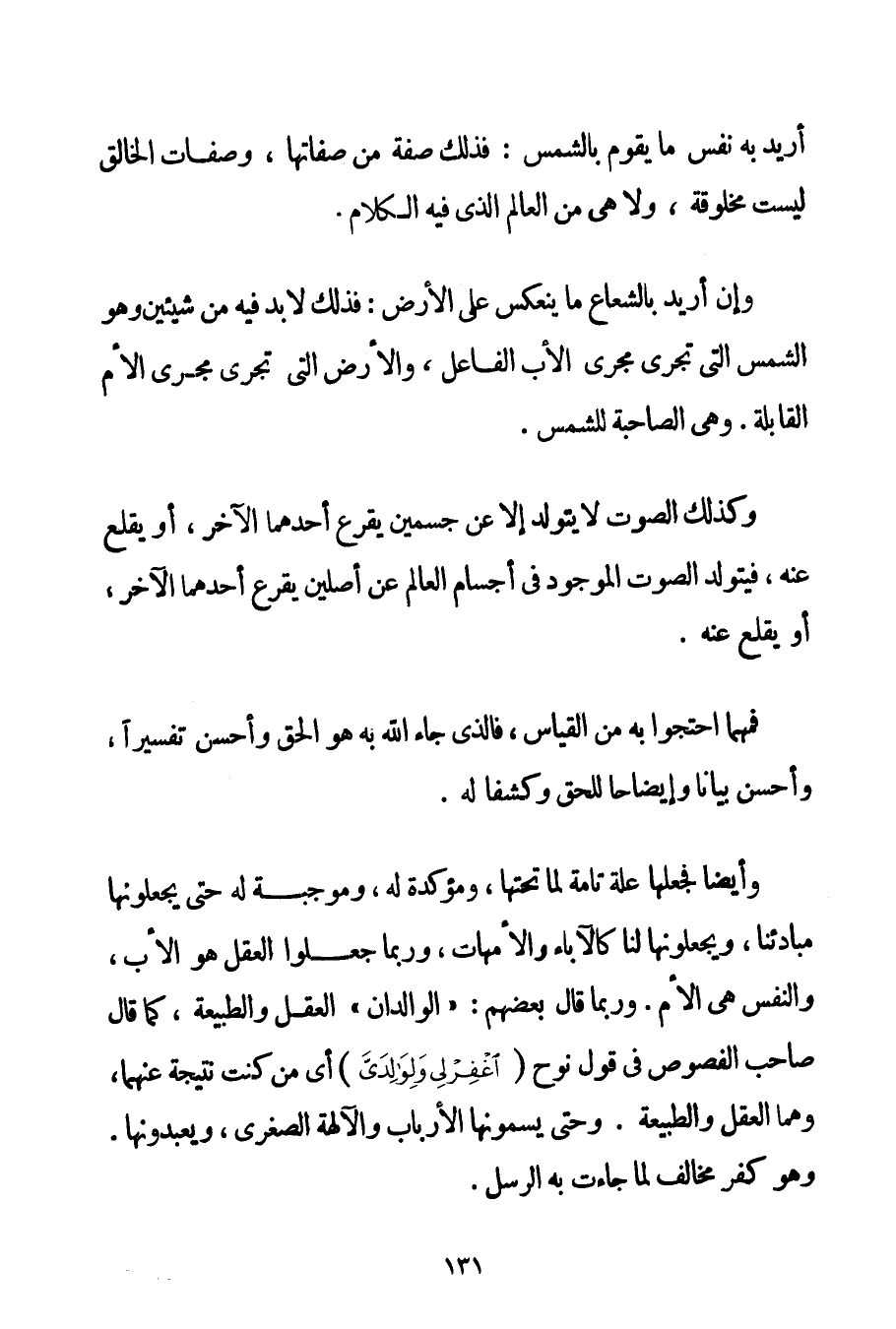 أُرِيدَ بِهِ نَفْسُ مَا يَقُومُ بِالشَّمْسِ: فَذَلِكَ صِفَةٌ مِنْ صِفَاتِهَا وَصِفَاتُ الْخَالِقِ لَيْسَتْ مَخْلُوقَةً وَلَا هِيَ مِنْ الْعَالَمِ الَّذِي فِيهِ الْكَلَامُ. وَإِنْ أُرِيدَ بِالشُّعَاعِ مَا يَنْعَكِسُ عَلَى الْأَرْضِ: فَذَلِكَ لَا بُدَّ فِيهِ مِنْ شَيْئَيْنِ وَهُمَا الشَّمْسُ الَّتِي تَجْرِي مَجْرَى الْأَبِ الْفَاعِلِ وَالْأَرْضِ الَّتِي تَجْرِي مَجْرَى الْأُمِّ الْقَابِلَةِ. وَهِيَ الصَّاحِبَةُ لِلشَّمْسِ. وَكَذَلِكَ الصَّوْتُ لَا يَتَوَلَّدُ إلَّا عَنْ جِسْمَيْنِ يَقْرَعُ أَحَدُهُمَا الْآخَرَ أَوْ يُقْلِعُ عَنْهُ فَيَتَوَلَّدُ الصَّوْتُ الْمَوْجُودُ فِي أَجْسَامِ الْعَالَمِ عَنْ أَصْلَيْنِ يَقْرَعُ أَحَدُهُمَا الْآخَرَ أَوْ يُقْلِعُ عَنْهُ. فَمَهْمَا احْتَجُّوا بِهِ مِنْ الْقِيَاسِ فَاَلَّذِي جَاءَ اللَّهُ بِهِ هُوَ الْحَقُّ وَأَحْسَنُ تَفْسِيرًا وَأَحْسَنُ بَيَانًا وَإِيضَاحًا لِلْحَقِّ وَكَشْفًا لَهُ. وَأَيْضًا فَجَعَلَهَا عِلَّةً تَامَّةً لِمَا تَحْتَهَا وَمُؤَكِّدَةً لَهُ وَمُوجِبَةً لَهُ حَتَّى يَجْعَلُونَهَا مَبَادِئَنَا وَيَجْعَلُونَهَا لَنَا كَالْآبَاءِ وَالْأُمَّهَاتِ وَرُبَّمَا جَعَلُوا الْعَقْلَ هُوَ الْأَبُ وَالنَّفْسُ هِيَ الْأُمُّ. وَرُبَّمَا قَالَ بَعْضُهُمْ: " الْوَالِدَانِ " الْعَقْلُ وَالطَّبِيعَةُ كَمَا قَالَ صَاحِبُ الْفُصُوصِ فِي قَوْلِ نُوحٍ {اغْفِرْ لِي وَلِوَالِدَيَّ} أَيْ مَنْ كُنْت نَتِيجَةً عَنْهُمَا وَهُمَا الْعَقْلُ وَالطَّبِيعَةُ. وَحَتَّى يُسَمُّونَهَا الْأَرْبَابَ وَالْآلِهَةَ الصُّغْرَى وَيَعْبُدُونَهَا. وَهُوَ كُفْرٌ مُخَالِفٌ لِمَا جَاءَتْ بِهِ الرُّسُلُ.