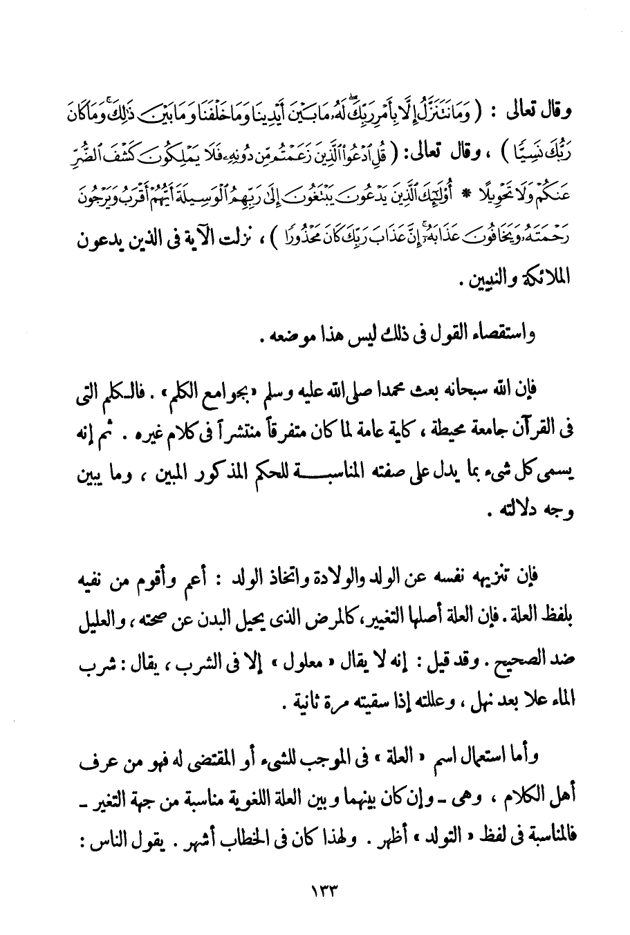 وَقَالَ تَعَالَى: {وَمَا نَتَنَزَّلُ إلَّا بِأَمْرِ رَبِّكَ لَهُ مَا بَيْنَ أَيْدِينَا وَمَا خَلْفَنَا وَمَا بَيْنَ ذَلِكَ وَمَا كَانَ رَبُّكَ نَسِيًّا} وَقَالَ تَعَالَى: {قُلِ ادْعُوا الَّذِينَ زَعَمْتُمْ مِنْ دُونِهِ فَلَا يَمْلِكُونَ كَشْفَ الضُّرِّ عَنْكُمْ وَلَا تَحْوِيلًا} {أُولَئِكَ الَّذِينَ يَدْعُونَ يَبْتَغُونَ إلَى رَبِّهِمُ الْوَسِيلَةَ أَيُّهُمْ أَقْرَبُ وَيَرْجُونَ رَحْمَتَهُ وَيَخَافُونَ عَذَابَهُ إنَّ عَذَابَ رَبِّكَ كَانَ مَحْذُورًا} نَزَلَتْ الْآيَةُ فِي الَّذِينَ يَدْعُونَ الْمَلَائِكَةَ وَالنَّبِيِّينَ. وَاسْتِقْصَاءُ الْقَوْلِ فِي ذَلِكَ لَيْسَ هَذَا مَوْضِعَهُ. فَإِنَّ اللَّهَ سُبْحَانَهُ بَعَثَ مُحَمَّدًا صَلَّى اللَّهُ عَلَيْهِ وَسَلَّمَ " بِجَوَامِعِ الْكَلِمِ ". فَالْكَلِمُ الَّتِي فِي الْقُرْآنِ جَامِعَةٌ مُحِيطَةٌ كُلِّيَّةٌ عَامَّةٌ لِمَا كَانَ مُتَفَرِّقًا مُنْتَشِرًا فِي كَلَامِ غَيْرِهِ. ثُمَّ إنَّهُ يُسَمِّي كُلَّ شَيْءٍ بِمَا يَدُلُّ عَلَى صِفَتِهِ الْمُنَاسِبَةِ لِلْحُكْمِ الْمَذْكُورِ الْمُبَيِّنِ وَمَا يُبَيِّنُ وَجْهَ دَلَالَتِهِ. فَإِنَّ تَنْزِيهَهُ نَفْسَهُ عَنْ الْوَلَدِ وَالْوِلَادَةِ وَاِتِّخَاذِ الْوَلَدِ: أَعَمُّ وَأَقْوَمُ مِنْ نَفْيِهِ بِلَفْظِ الْعِلَّةِ. فَإِنَّ الْعِلَّةَ أَصْلُهَا التَّغْيِيرُ كَالْمَرَضِ الَّذِي يُحِيلُ الْبَدَنَ عَنْ صِحَّتِهِ وَالْعَلِيلُ ضِدُّ الصَّحِيحِ. وَقَدْ قِيلَ: إنَّهُ لَا يُقَالُ " مَعْلُولٌ " إلَّا فِي الشُّرْبِ يُقَالُ: شَرِبَ الْمَاءَ عَلًّا بَعْدَ نَهَلٍ وَعَلَّلْته إذَا سَقَيْته مَرَّةً ثَانِيَةً.