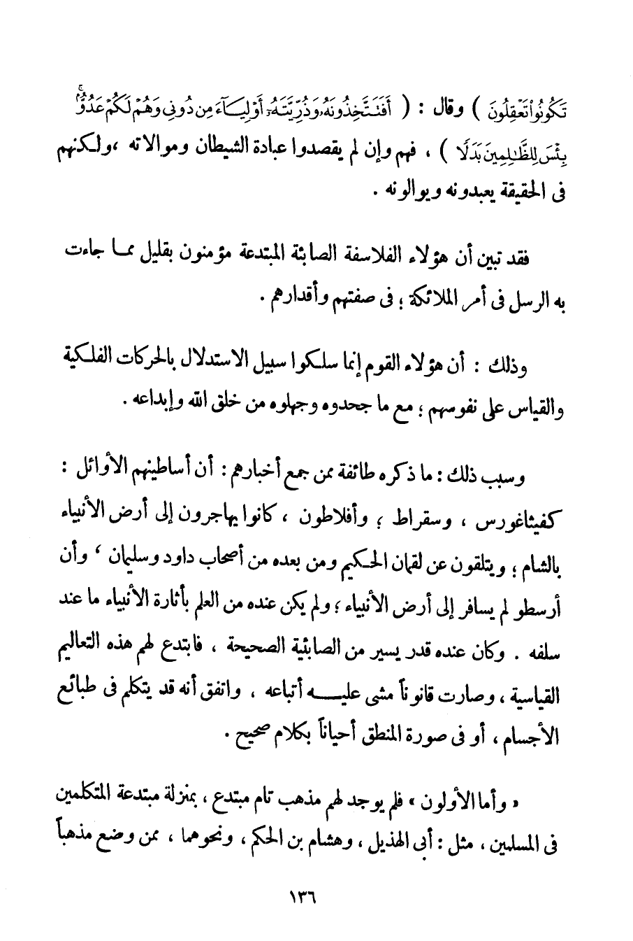 أَفَلَمْ تَكُونُوا تَعْقِلُونَ} وَقَالَ: {أَفَتَتَّخِذُونَهُ وَذُرِّيَّتَهُ أَوْلِيَاءَ مِنْ دُونِي وَهُمْ لَكُمْ عَدُوٌّ بِئْسَ لِلظَّالِمِينَ بَدَلًا} فَهُمْ وَإِنْ لَمْ يَقْصِدُوا عِبَادَةَ الشَّيْطَانِ وَمُوَالَاتَهُ وَلَكِنَّهُمْ فِي الْحَقِيقَةِ يَعْبُدُونَهُ وَيُوَالُونَهُ. فَقَدْ تَبَيَّنَ أَنَّ هَؤُلَاءِ الْفَلَاسِفَةَ الصَّابِئَةَ الْمُبْتَدِعَةَ مُؤْمِنُونَ بِقَلِيلِ مِمَّا جَاءَتْ بِهِ الرُّسُلُ فِي أَمْرِ الْمَلَائِكَةِ؛ فِي صِفَتِهِمْ وَأَقْدَارِهِمْ. وَذَلِكَ: أَنَّ هَؤُلَاءِ الْقَوْمَ إنَّمَا سَلَكُوا سَبِيلَ الِاسْتِدْلَالِ بِالْحَرَكَاتِ الْفَلَكِيَّةِ وَالْقِيَاسِ عَلَى نُفُوسِهِمْ؛ مَعَ مَا جَحَدُوهُ وَجَهِلُوهُ مِنْ خَلْقِ اللَّهِ وَإِبْدَاعِهِ. وَسَبَبُ ذَلِكَ: مَا ذَكَرَهُ طَائِفَةٌ مِمَّنْ جَمَعَ أَخْبَارَهُمْ: أَنَّ أَسَاطِينَهمْ الْأَوَائِلَ: كفيثاغورس وَسُقْرَاطَ؛ وَأَفْلَاطُونَ كَانُوا يُهَاجِرُونَ إلَى أَرْضِ الْأَنْبِيَاءِ بِالشَّامِ؛ وَيَتَلَقَّوْنَ عَنْ لُقْمَانَ الْحَكِيمِ وَمَنْ بَعْدَهُ مِنْ أَصْحَابِ دَاوُد وَسُلَيْمَانَ وَأَنَّ أَرِسْطُو لَمْ يُسَافِرْ إلَى أَرْضِ الْأَنْبِيَاءِ؛ وَلَمْ يَكُنْ عِنْدَهُ مِنْ الْعِلْمِ بِأَثَارَةِ الْأَنْبِيَاءِ مَا عِنْدَ سَلَفِهِ. وَكَانَ عِنْدَهُ قَدْرٌ يَسِيرٌ مِنْ الصابئية الصَّحِيحَةِ فَابْتَدَعَ لَهُمْ هَذِهِ التَّعَالِيمَ الْقِيَاسِيَّةَ وَصَارَتْ قَانُونًا مَشَى عَلَيْهِ أَتْبَاعُهُ وَاتَّفَقَ أَنَّهُ قَدْ يَتَكَلَّمُ فِي طَبَائِعِ الْأَجْسَامِ أَوْ فِي صُورَةِ الْمَنْطِقِ أَحْيَانًا بِكَلَامِ صَحِيحٍ. " وَأَمَّا الْأَوَّلُونَ " فَلَمْ يُوجَدْ لَهُمْ مَذْهَبٌ تَامٌّ مُبْتَدَعٌ بِمَنْزِلَةِ مُبْتَدِعَةِ الْمُتَكَلِّمِينَ فِي الْمُسْلِمِينَ مِثْلُ: أَبِي الهذيل وَهِشَامِ بْنِ الْحَكَمِ وَنَحْوِهِمَا مِمَّنْ وَضَعَ مَذْهَبًا