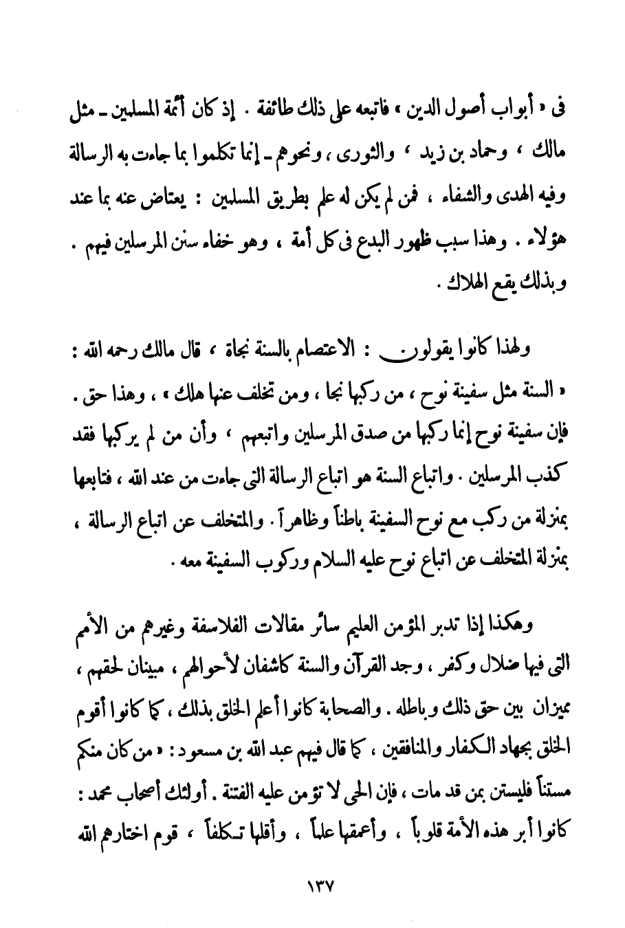 فِي " أَبْوَابِ أُصُولِ الدِّينِ " فَاتَّبَعَهُ عَلَى ذَلِكَ طَائِفَةٌ. إذْ كَانَ أَئِمَّةُ الْمُسْلِمِينَ - مِثْلُ مَالِكٍ وَحَمَّادِ بْنِ زَيْدٍ وَالثَّوْرِيِّ وَنَحْوِهِمْ - إنَّمَا تَكَلَّمُوا بِمَا جَاءَتْ بِهِ الرِّسَالَةُ وَفِيهِ الْهُدَى وَالشِّفَاءُ فَمَنْ لَمْ يَكُنْ لَهُ عِلْمٌ بِطَرِيقِ الْمُسْلِمِينَ: يَعْتَاضُ عَنْهُ بِمَا عِنْدَ هَؤُلَاءِ. وَهَذَا سَبَبُ ظُهُورِ الْبِدَعِ فِي كُلِّ أُمَّةٍ وَهُوَ خَفَاءُ سُنَنِ الْمُرْسَلِينَ فِيهِمْ. وَبِذَلِكَ يَقَعُ الْهَلَاكُ. وَلِهَذَا كَانُوا يَقُولُونَ: الِاعْتِصَامُ بِالسُّنَّةِ نَجَاةٌ قَالَ مَالِكٌ رَحِمَهُ اللَّهُ " السُّنَّةُ مِثْلُ سَفِينَةِ نُوحٍ مَنْ رَكِبَهَا نَجَا وَمَنْ تَخَلَّفَ عَنْهَا هَلَكَ " وَهَذَا حَقٌّ. فَإِنَّ سَفِينَةَ نُوحٍ إنَّمَا رَكِبَهَا مَنْ صَدَّقَ الْمُرْسَلِينَ وَاتَّبَعَهُمْ وَأَنَّ مَنْ لَمْ يَرْكَبْهَا فَقَدْ كَذَّبَ الْمُرْسَلِينَ. وَاتِّبَاعُ السُّنَّةِ هُوَ اتِّبَاعُ الرِّسَالَةِ الَّتِي جَاءَتْ مِنْ عِنْدِ اللَّهِ فَتَابِعُهَا بِمَنْزِلَةِ مَنْ رَكِبَ مَعَ نُوحٍ السَّفِينَةَ بَاطِنًا وَظَاهِرًا. وَالْمُتَخَلِّفُ عَنْ اتِّبَاعِ الرِّسَالَةِ بِمَنْزِلَةِ الْمُتَخَلِّفِ عَنْ اتِّبَاعِ نُوحٍ عَلَيْهِ السَّلَامُ وَرُكُوبِ السَّفِينَةِ مَعَهُ. وَهَكَذَا إذَا تَدَبَّرَ الْمُؤْمِنُ الْعَلِيمُ سَائِرَ مَقَالَاتِ الْفَلَاسِفَةِ وَغَيْرِهِمْ مِنْ الْأُمَمِ الَّتِي فِيهَا ضَلَالٌ وَكُفْرٌ وَجَدَ الْقُرْآنَ وَالسُّنَّةَ كَاشِفََين لِأَحْوَالِهِمْ مُبَيِّنَينَ لِحَقِّهِمْ مُمَيِّزَينَ بَيْنَ حَقِّ ذَلِكَ وَبَاطِلِهِ. وَالصَّحَابَةُ كَانُوا أَعْلَمَ الْخَلْقِ بِذَلِكَ كَمَا كَانُوا أَقْوَمَ الْخَلْقِ بِجِهَادِ الْكُفَّارِ وَالْمُنَافِقِينَ كَمَا قَالَ فِيهِمْ عَبْدُ اللَّهِ بْنُ مَسْعُودٍ: " مَنْ كَانَ مِنْكُمْ مُسْتَنًّا فَلْيَسْتَنَّ بِمَنْ قَدْ مَاتَ فَإِنَّ الْحَيَّ لَا تُؤْمَنُ عَلَيْهِ الْفِتْنَةُ. أُولَئِكَ أَصْحَابُ مُحَمَّدٍ: كَانُوا أَبَرَّ هَذِهِ الْأُمَّةِ قُلُوبًا وَأَعْمَقَهَا عِلْمًا وَأَقَلَّهَا تَكَلُّفًا قَوْمٌ اخْتَارَهُمْ اللَّهُ