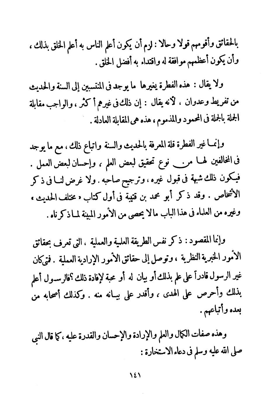 بِالْحَقَائِقِ وَأَقْوَمَهُمْ قَوْلًا وَحَالًا: لَزِمَ أَنْ يَكُونَ أَعْلَمُ النَّاسِ بِهِ أَعْلَمَ الْخَلْقِ بِذَلِكَ وَأَنْ يَكُونَ أَعْظَمُهُمْ مُوَافَقَةً لَهُ وَاقْتِدَاءً بِهِ أَفْضَلَ الْخَلْقِ. وَلَا يُقَالُ: هَذِهِ الْفِطْرَةُ يُغَيِّرُهَا مَا يُوجَدُ فِي الْمُنْتَسِبِينَ إلَى السُّنَّةِ وَالْحَدِيثِ مِنْ تَفْرِيطٍ وَعُدْوَانٍ لِأَنَّهُ يُقَالُ: إنَّ ذَلِكَ فِي غَيْرِهِمْ أَكْثَرُ وَالْوَاجِبُ مُقَابَلَةُ الْجُمْلَةِ بِالْجُمْلَةِ فِي الْمَحْمُودِ وَالْمَذْمُومِ هَذِهِ هِيَ الْمُقَابَلَةُ الْعَادِلَةُ. وَإِنَّمَا غَيْرُ الْفِطْرَةِ قِلَّةُ الْمَعْرِفَةِ بِالْحَدِيثِ وَالسُّنَّةِ وَاتِّبَاعِ ذَلِكَ مَعَ مَا يُوجَدُ فِي الْمُخَالِفِينَ لَهَا مِنْ نَوْعِ تَحْقِيقٍ لِبَعْضِ الْعِلْمِ وَإِحْسَانٍ لِبَعْضِ الْعَمَلِ. فَيَكُونُ ذَلِكَ شُبْهَةً فِي قَبُولِ غَيْرِهِ وَتَرْجِيحِ صَاحِبِهِ. وَلَا غَرَضَ لَنَا فِي ذِكْرِ الْأَشْخَاصِ. وَقَدْ ذَكَرَ أَبُو مُحَمَّدٍ بْنُ قُتَيْبَةَ فِي أَوَّلِ كِتَابِ " مُخْتَلِفِ الْحَدِيثِ " وَغَيْرُهُ مِنْ الْعُلَمَاءِ فِي هَذَا الْبَابِ مَا لَا يُحْصَى مِنْ الْأُمُورِ الْمُبَيِّنَةِ لِمَا ذَكَرْنَاهُ. وَإِنَّمَا الْمَقْصُودُ: ذِكْرُ نَفْسِ الطَّرِيقَةِ الْعِلْمِيَّةِ وَالْعَمَلِيَّةِ الَّتِي تُعْرَفُ بِحَقَائِقِ الْأُمُورِ الْخَبَرِيَّةِ النَّظَرِيَّةِ وَتُوَصِّلُ إلَى حَقَائِقِ الْأُمُورِ الْإِرَادِيَّةِ الْعَمَلِيَّةِ. فَمَتَى كَانَ غَيْرُ الرَّسُولِ قَادِرًا عَلَى عِلْمٍ بِذَلِكَ أَوْ بَيَانٍ لَهُ أَوْ مَحَبَّةٍ لِإِفَادَةِ ذَلِكَ؟ فَالرَّسُولُ أَعْلَمُ بِذَلِكَ وَأَحْرَصُ عَلَى الْهُدَى وَأَقْدَرُ عَلَى بَيَانِهِ مِنْهُ. وَكَذَلِكَ أَصْحَابُهُ مِنْ بَعْدِهِ وَأَتْبَاعُهُمْ. وَهَذِهِ صِفَاتُ الْكَمَالِ وَالْعِلْمِ وَالْإِرَادَةِ وَالْإِحْسَانِ وَالْقُدْرَةِ عَلَيْهِ كَمَا قَالَ النَّبِيُّ صَلَّى اللَّهُ عَلَيْهِ وَسَلَّمَ فِي دُعَاءِ الِاسْتِخَارَةِ: