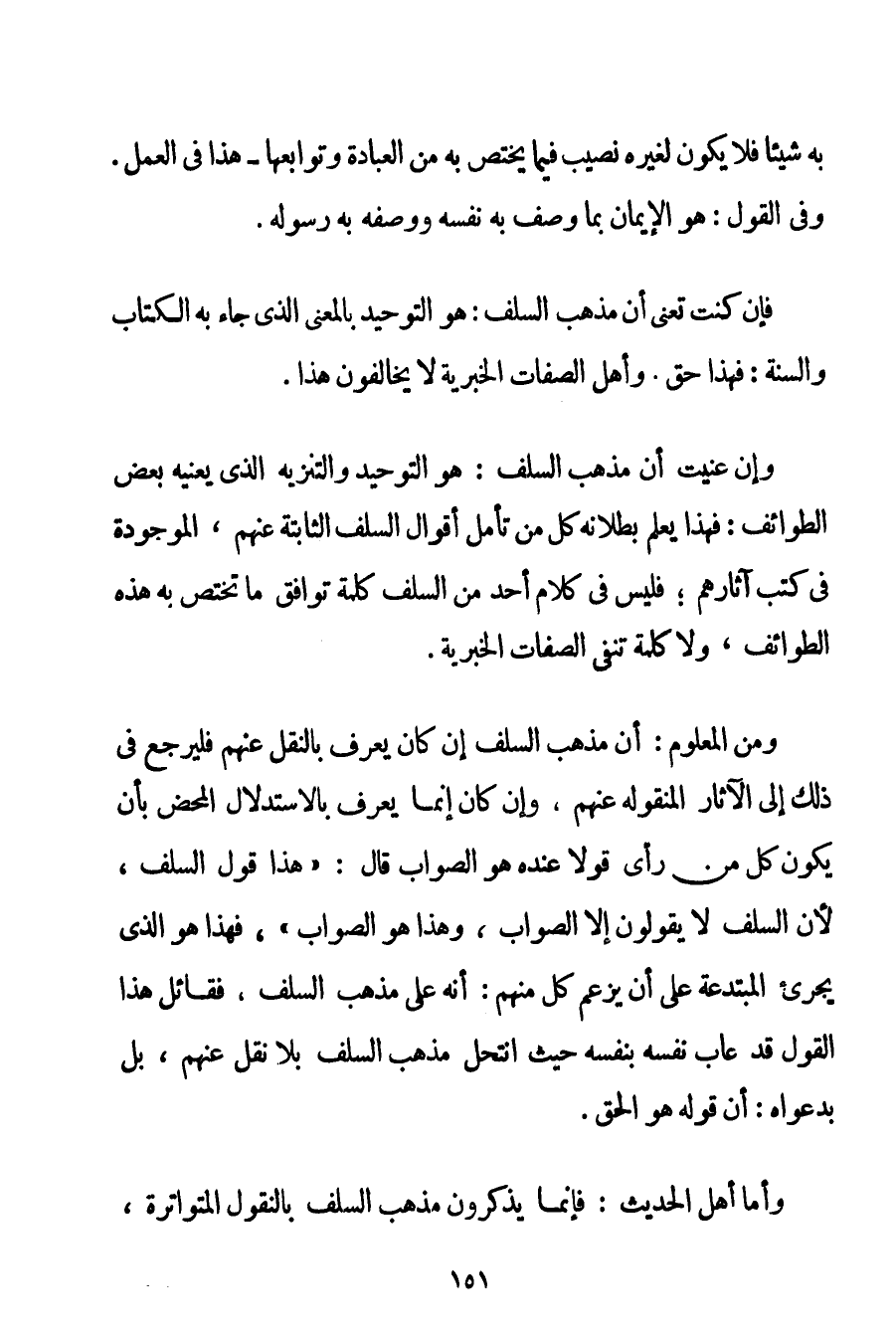 بِهِ شَيْئًا فَلَا يَكُونُ لِغَيْرِهِ نَصِيبٌ فِيمَا يَخْتَصُّ بِهِ مِنْ الْعِبَادَةِ وَتَوَابِعِهَا - هَذَا فِي الْعَمَلِ. وَفِي الْقَوْلِ: هُوَ الْإِيمَانُ بِمَا وَصَفَ بِهِ نَفْسَهُ وَوَصَفَهُ بِهِ رَسُولُهُ. فَإِنْ كُنْت تَعْنِي أَنَّ مَذْهَبَ السَّلَفِ: هُوَ التَّوْحِيدُ بِالْمَعْنَى الَّذِي جَاءَ بِهِ الْكِتَابُ وَالسُّنَّةُ: فَهَذَا حَقٌّ. وَأَهْلُ الصِّفَاتِ الْخَبَرِيَّةِ لَا يُخَالِفُونَ هَذَا. وَإِنْ عَنَيْت أَنَّ مَذْهَبَ السَّلَفِ: هُوَ التَّوْحِيدُ وَالتَّنْزِيهُ الَّذِي يَعْنِيهِ بَعْضُ الطَّوَائِفِ: فَهَذَا يَعْلَمُ بُطْلَانَهُ كُلُّ مَنْ تَأَمَّلَ أَقْوَالَ السَّلَفِ الثَّابِتَةَ عَنْهُمْ الْمَوْجُودَةَ فِي كُتُبِ آثَارِهِمْ؛ فَلَيْسَ فِي كَلَامِ أَحَدٍ مِنْ السَّلَفِ كَلِمَةٌ تُوَافِقُ مَا تَخْتَصُّ بِهِ هَذِهِ الطَّوَائِفُ وَلَا كَلِمَةٌ تَنْفِي الصِّفَاتِ الْخَبَرِيَّةَ. وَمِنْ الْمَعْلُومِ: أَنَّ مَذْهَبَ السَّلَفِ إنْ كَانَ يُعْرَفُ بِالنَّقْلِ عَنْهُمْ فَلْيُرْجَعْ فِي ذَلِكَ إلَى الْآثَارِ الْمَنْقُولَةِ عَنْهُمْ وَإِنْ كَانَ إنَّمَا يُعْرَفُ بِالِاسْتِدْلَالِ الْمَحْضِ بِأَنْ يَكُونَ كُلُّ مَنْ رَأَى قَوْلًا عِنْدَهُ هُوَ الصَّوَابُ قَالَ: " هَذَا قَوْلُ السَّلَفِ لِأَنَّ السَّلَفَ لَا يَقُولُونَ إلَّا الصَّوَابَ وَهَذَا هُوَ الصَّوَابُ " فَهَذَا هُوَ الَّذِي يُجَرِّئُ الْمُبْتَدِعَةَ عَلَى أَنْ يَزْعُمَ كُلٌّ مِنْهُمْ: أَنَّهُ عَلَى مَذْهَبِ السَّلَفِ فَقَائِلُ هَذَا الْقَوْلِ قَدْ عَابَ نَفْسَهُ بِنَفْسِهِ حَيْثُ انْتَحَلَ مَذْهَبَ السَّلَفِ بِلَا نَقْلٍ عَنْهُمْ بَلْ بِدَعْوَاهُ: أَنَّ قَوْلَهُ هُوَ الْحَقُّ. وَأَمَّا أَهْلُ الْحَدِيثِ: فَإِنَّمَا يَذْكُرُونَ مَذْهَبَ السَّلَفِ بِالنُّقُولِ الْمُتَوَاتِرَةِ