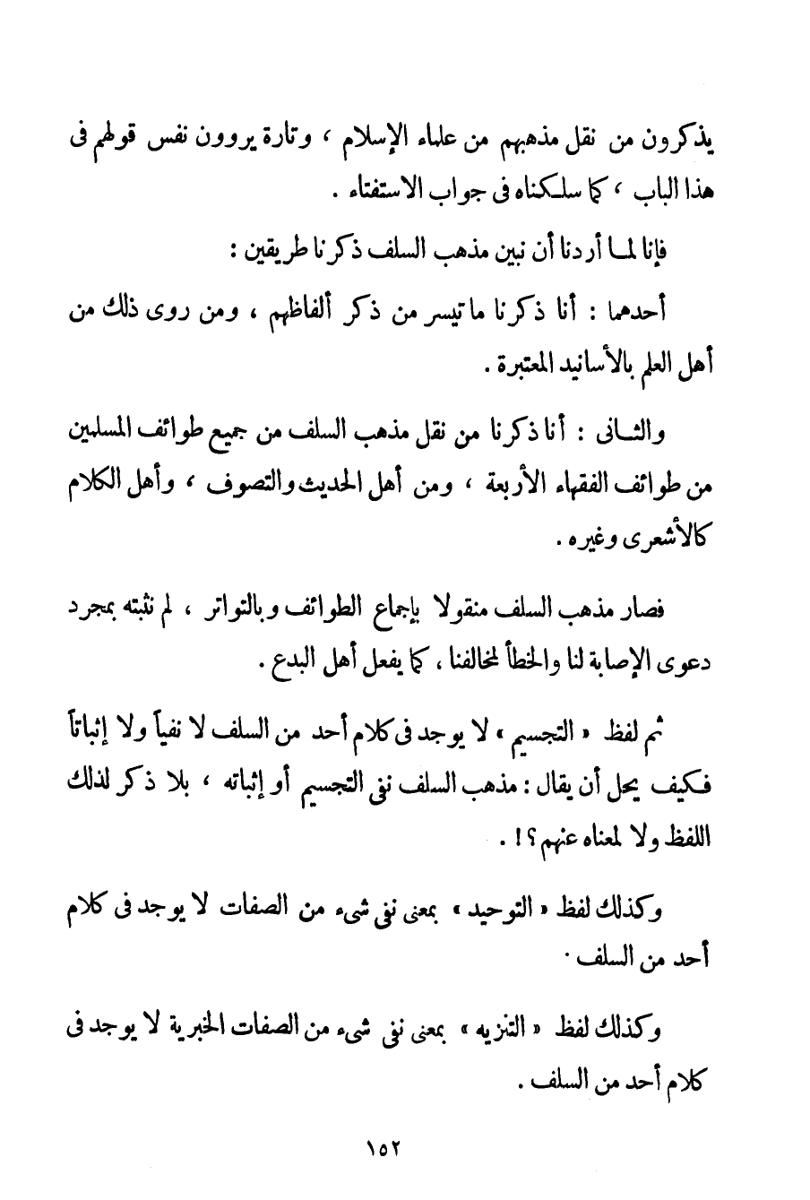 يَذْكُرُونَ مَنْ نَقَلَ مَذْهَبَهُمْ مِنْ عُلَمَاءِ الْإِسْلَامِ وَتَارَةً يَرْوُونَ نَفْسَ قَوْلِهِمْ فِي هَذَا الْبَابِ كَمَا سَلَكْنَاهُ فِي جَوَابِ الِاسْتِفْتَاءِ. فَإِنَّا لَمَّا أَرَدْنَا أَنْ نُبَيِّنَ مَذْهَبَ السَّلَفِ ذَكَرْنَا طَرِيقَيْنِ: أَحَدُهُمَا: أَنَّا ذَكَرْنَا مَا تَيَسَّرَ مِنْ ذِكْرِ أَلْفَاظِهِمْ وَمَنْ رَوَى ذَلِكَ مِنْ أَهْلِ الْعِلْمِ بِالْأَسَانِيدِ الْمُعْتَبَرَةِ. وَالثَّانِي: أَنَّا ذَكَرْنَا مَنْ نَقَلَ مَذْهَبَ السَّلَفِ مِنْ جَمِيعِ طَوَائِفِ الْمُسْلِمِينَ مِنْ طَوَائِفِ الْفُقَهَاءِ الْأَرْبَعَةِ وَمِنْ أَهْلِ الْحَدِيثِ وَالتَّصَوُّفِ وَأَهْلِ الْكَلَامِ كَالْأَشْعَرِيِّ وَغَيْرِهِ. فَصَارَ مَذْهَبُ السَّلَفِ مَنْقُولًا بِإِجْمَاعِ الطَّوَائِفِ وَبِالتَّوَاتُرِ لَمْ نُثْبِتْهُ بِمُجَرَّدِ دَعْوَى الْإِصَابَةِ لَنَا وَالْخَطَأِ لِمُخَالِفِنَا كَمَا يَفْعَلُ أَهْلُ الْبِدَعِ. ثُمَّ لَفْظُ " التَّجْسِيمِ " لَا يُوجَدُ فِي كَلَامِ أَحَدٍ مِنْ السَّلَفِ لَا نَفْيًا وَلَا إثْبَاتًا فَكَيْفَ يَحِلُّ أَنْ يُقَالَ: مَذْهَبُ السَّلَفِ نَفْيُ التَّجْسِيمِ أَوْ إثْبَاتُهُ بِلَا ذِكْرٍ لِذَلِكَ اللَّفْظِ وَلَا لِمَعْنَاهُ عَنْهُمْ؟ . وَكَذَلِكَ لَفْظُ " التَّوْحِيدِ " بِمَعْنَى نَفْيِ شَيْءٍ مِنْ الصِّفَاتِ لَا يُوجَدُ فِي كَلَامِ أَحَدٍ مِنْ السَّلَفِ. وَكَذَلِكَ لَفْظُ " التَّنْزِيهِ " بِمَعْنَى نَفْيِ شَيْءٍ مِنْ الصِّفَاتِ الْخَبَرِيَّةِ لَا يُوجَدُ فِي كَلَامِ أَحَدٍ مِنْ السَّلَفِ.