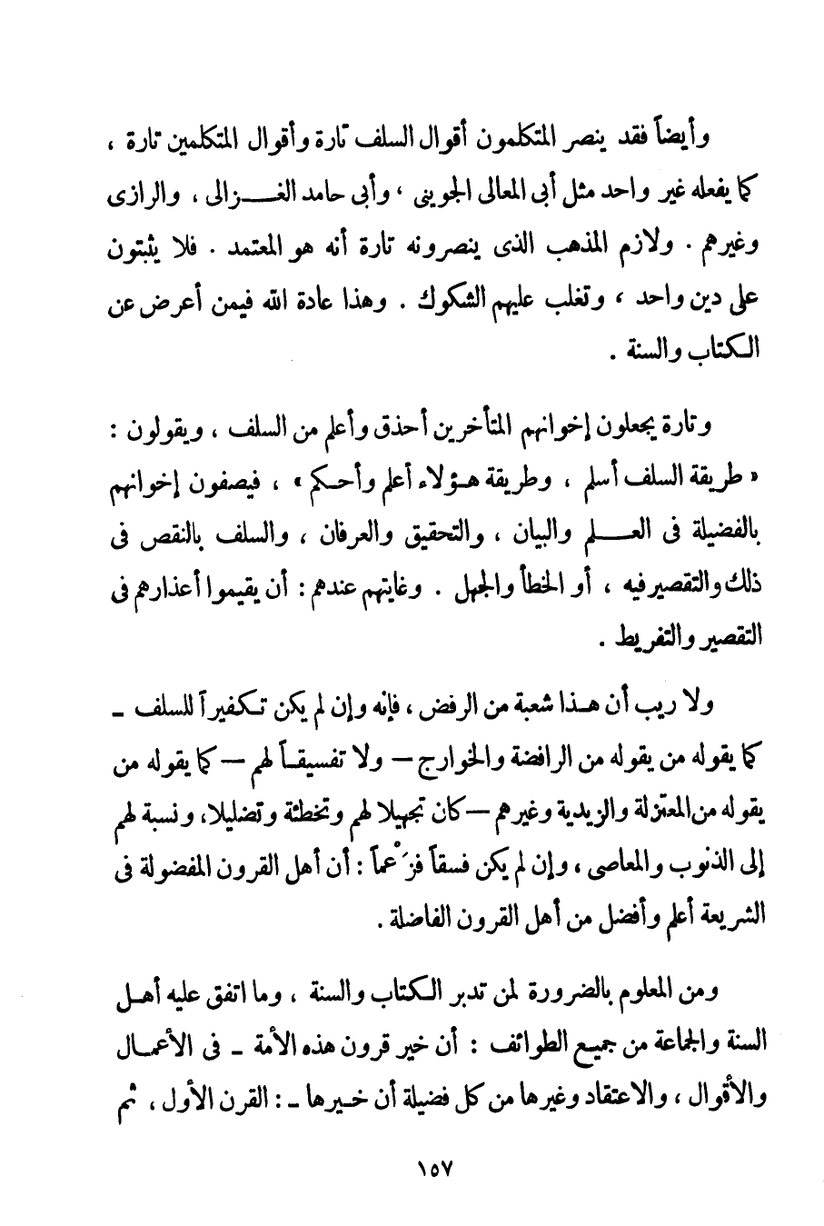وَأَيْضًا فَقَدْ يَنْصُرُ الْمُتَكَلِّمُونَ أَقْوَالَ السَّلَفِ تَارَةً وَأَقْوَالَ الْمُتَكَلِّمِينَ تَارَةً كَمَا يَفْعَلُهُ غَيْرُ وَاحِدٍ مِثْلُ أَبِي الْمَعَالِي الجُوَيْنِي وَأَبِي حَامِدٍ الْغَزَالِيِّ وَالرَّازِي وَغَيْرِهِمْ. وَلَازِمُ الْمَذْهَبِ الَّذِي يَنْصُرُونَهُ تَارَةً أَنَّهُ هُوَ الْمُعْتَمَدُ. فَلَا يَثْبُتُونَ عَلَى دِينٍ وَاحِدٍ وَتَغْلِبُ عَلَيْهِمْ الشُّكُوكُ. وَهَذَا عَادَةُ اللَّهِ فِيمَنْ أَعْرَضَ عَنْ الْكِتَابِ وَالسُّنَّةِ. وَتَارَةً يَجْعَلُونَ إخْوَانَهُمْ الْمُتَأَخِّرِينَ أَحْذَقَ وَأَعْلَمَ مِنْ السَّلَفِ وَيَقُولُونَ: " طَرِيقَةُ السَّلَفِ أَسْلَمُ وَطَرِيقَةُ هَؤُلَاءِ أَعْلَمُ وَأَحْكَمُ " فَيَصِفُونَ إخْوَانَهُمْ بِالْفَضِيلَةِ فِي الْعِلْمِ وَالْبَيَانِ وَالتَّحْقِيقِ وَالْعِرْفَانِ وَالسَّلَفَ بِالنَّقْصِ فِي ذَلِكَ وَالتَّقْصِيرِ فِيهِ أَوْ الْخَطَأِ وَالْجَهْلِ. وَغَايَتُهُمْ عِنْدَهُمْ: أَنْ يُقِيمُوا أَعْذَارَهُمْ فِي التَّقْصِيرِ وَالتَّفْرِيطِ. وَلَا رَيْبَ أَنَّ هَذَا شُعْبَةٌ مِنْ الرَّفْضِ فَإِنَّهُ وَإِنْ لَمْ يَكُنْ تَكْفِيرًا لِلسَّلَفِ - كَمَا يَقُولُهُ مَنْ يَقُولُهُ مِنْ الرَّافِضَةِ وَالْخَوَارِجِ - وَلَا تَفْسِيقًا لَهُمْ - كَمَا يَقُولُهُ مَنْ يَقُولُهُ مِنْ الْمُعْتَزِلَةِ وَالزَّيْدِيَّةِ وَغَيْرِهِمْ - كَانَ تَجْهِيلًا لَهُمْ وَتَخْطِئَةً وَتَضْلِيلًا وَنِسْبَةً لَهُمْ إلَى الذُّنُوبِ وَالْمَعَاصِي وَإِنْ لَمْ يَكُنْ فِسْقًا فَزَعْمًا: أَنَّ أَهْلَ الْقُرُونِ المفضولة فِي الشَّرِيعَةِ أَعْلَمُ وَأَفْضَلُ مِنْ أَهْلِ الْقُرُونِ الْفَاضِلَةِ. وَمِنْ الْمَعْلُومِ بِالضَّرُورَةِ لِمَنْ تَدَبَّرَ الْكِتَابَ وَالسُّنَّةَ وَمَا اتَّفَقَ عَلَيْهِ أَهْلُ السُّنَّةِ وَالْجَمَاعَةِ مِنْ جَمِيعِ الطَّوَائِفِ: أَنَّ خَيْرَ قُرُونِ هَذِهِ الْأُمَّةِ - فِي الْأَعْمَالِ وَالْأَقْوَالِ وَالِاعْتِقَادِ وَغَيْرِهَا مِنْ كُلِّ فَضِيلَةٍ أَنَّ خَيْرَهَا -: الْقَرْنُ الْأَوَّلُ ثُمَّ