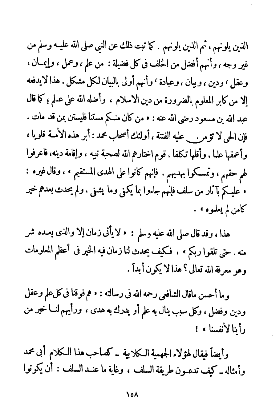 الَّذِينَ يَلُونَهُمْ ثُمَّ الَّذِينَ يَلُونَهُمْ كَمَا ثَبَتَ ذَلِكَ عَنْ النَّبِيِّ صَلَّى اللَّهُ عَلَيْهِ وَسَلَّمَ مِنْ غَيْرِ وَجْهٍ وَأَنَّهُمْ أَفْضَلُ مِنْ الْخَلَفِ فِي كُلِّ فَضِيلَةٍ: مِنْ عِلْمٍ وَعَمَلٍ وَإِيمَانٍ وَعَقْلٍ وَدِينٍ وَبَيَانٍ وَعِبَادَةٍ وَأَنَّهُمْ أَوْلَى بِالْبَيَانِ لِكُلِّ مُشْكِلٍ. هَذَا لَا يَدْفَعُهُ إلَّا مَنْ كَابَرَ الْمَعْلُومَ بِالضَّرُورَةِ مِنْ دِينِ الْإِسْلَامِ وَأَضَلَّهُ اللَّهُ عَلَى عِلْمٍ؛ كَمَا قَالَ عَبْدُ اللَّهِ بْنُ مَسْعُودٍ رَضِيَ اللَّهُ عَنْهُ " مَنْ كَانَ مِنْكُمْ مُسْتَنًّا فَلْيَسْتَنَّ بِمَنْ قَدْ مَاتَ. فَإِنَّ الْحَيَّ لَا تُؤْمَنُ عَلَيْهِ الْفِتْنَةُ أُولَئِكَ أَصْحَابُ مُحَمَّدٍ: أَبَرُّ هَذِهِ الْأُمَّةِ قُلُوبًا وَأَعْمَقُهَا عِلْمًا وَأَقَلُّهَا تَكَلُّفًا قَوْمٌ اخْتَارَهُمْ اللَّهُ لِصُحْبَةِ نَبِيِّهِ وَإِقَامَةِ دِينِهِ فَاعْرِفُوا لَهُمْ حَقَّهُمْ وَتَمَسَّكُوا بِهَدْيِهِمْ فَإِنَّهُمْ كَانُوا عَلَى الْهُدَى الْمُسْتَقِيمِ " وَقَالَ غَيْرُهُ: " عَلَيْكُمْ بِآثَارِ مَنْ سَلَفَ فَإِنَّهُمْ جَاءُوا بِمَا يَكْفِي وَمَا يَشْفِي وَلَمْ يَحْدُثْ بَعْدَهُمْ خَيْرٌ كَامِنٌ لَمْ يَعْلَمُوهُ ". هَذَا وَقَدْ قَالَ صَلَّى اللَّهُ عَلَيْهِ وَسَلَّمَ {لَا يَأْتِي زَمَانٌ إلَّا وَاَلَّذِي بَعْدَهُ شَرٌّ مِنْهُ حَتَّى تَلْقَوْا رَبَّكُمْ} فَكَيْفَ يَحْدُثُ لَنَا زَمَانٌ فِيهِ الْخَيْرُ فِي أَعْظَمِ الْمَعْلُومَاتِ وَهُوَ مَعْرِفَةُ اللَّهِ تَعَالَى؟ هَذَا لَا يَكُونُ أَبَدًا. وَمَا أَحْسَنَ مَا قَالَ الشَّافِعِيُّ رَحِمَهُ اللَّهُ فِي رِسَالَتِهِ: " هُمْ فَوْقَنَا فِي كُلِّ عِلْمٍ وَعَقْلٍ وَدِينٍ وَفَضْلٍ وَكُلِّ سَبَبٍ يُنَالُ بِهِ عِلْمٌ أَوْ يُدْرَكُ بِهِ هُدًى وَرَأْيُهُمْ لَنَا خَيْرٌ مِنْ رَأْيِنَا لِأَنْفُسِنَا " وَأَيْضًا فَيُقَالُ لِهَؤُلَاءِ الْجَهْمِيَّة الْكُلَّابِيَة - كَصَاحِبِ هَذَا الْكَلَامِ أَبِي مُحَمَّدٍ وَأَمْثَالِهِ - كَيْفَ تَدَعُونَ طَرِيقَةَ السَّلَفِ وَغَايَةُ مَا عِنْدَ السَّلَفِ: أَنْ يَكُونُوا