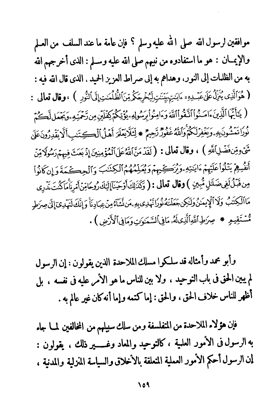 مُوَافِقِينَ لِرَسُولِ اللَّهِ صَلَّى اللَّهُ عَلَيْهِ وَسَلَّمَ؟ فَإِنَّ عَامَّةَ مَا عِنْدَ السَّلَفِ مِنْ الْعِلْمِ وَالْإِيمَانِ: هُوَ مَا اسْتَفَادُوهُ مِنْ نَبِيِّهِمْ صَلَّى اللَّهُ عَلَيْهِ وَسَلَّمَ الَّذِي أَخْرَجَهُمْ اللَّهُ بِهِ مِنْ الظُّلُمَاتِ إلَى النُّورِ وَهَدَاهُمْ بِهِ إلَى صِرَاطِ الْعَزِيزِ الْحَمِيدِ الَّذِي قَالَ اللَّهُ فِيهِ: {هُوَ الَّذِي يُنَزِّلُ عَلَى عَبْدِهِ آيَاتٍ بَيِّنَاتٍ لِيُخْرِجَكُمْ مِنَ الظُّلُمَاتِ إلَى النُّورِ} وَقَالَ تَعَالَى: {يَا أَيُّهَا الَّذِينَ آمَنُوا اتَّقُوا اللَّهَ وَآمِنُوا بِرَسُولِهِ يُؤْتِكُمْ كِفْلَيْنِ مِنْ رَحْمَتِهِ وَيَجْعَلْ لَكُمْ نُورًا تَمْشُونَ بِهِ وَيَغْفِرْ لَكُمْ وَاللَّهُ غَفُورٌ رَحِيمٌ} {لِئَلَّا يَعْلَمَ أَهْلُ الْكِتَابِ أَلَّا يَقْدِرُونَ عَلَى شَيْءٍ مِنْ فَضْلِ اللَّهِ} وَقَالَ تَعَالَى: {لَقَدْ مَنَّ اللَّهُ عَلَى الْمُؤْمِنِينَ إذْ بَعَثَ فِيهِمْ رَسُولًا مِنْ أَنْفُسِهِمْ يَتْلُو عَلَيْهِمْ آيَاتِهِ وَيُزَكِّيهِمْ وَيُعَلِّمُهُمُ الْكِتَابَ وَالْحِكْمَةَ وَإِنْ كَانُوا مِنْ قَبْلُ لَفِي ضَلَالٍ مُبِينٍ} وَقَالَ تَعَالَى: {وَكَذَلِكَ أَوْحَيْنَا إلَيْكَ رُوحًا مِنْ أَمْرِنَا مَا كُنْتَ تَدْرِي مَا الْكِتَابُ وَلَا الْإِيمَانُ وَلَكِنْ جَعَلْنَاهُ نُورًا نَهْدِي بِهِ مَنْ نَشَاءُ مِنْ عِبَادِنَا وَإِنَّكَ لَتَهْدِي إلَى صِرَاطٍ مُسْتَقِيمٍ} {صِرَاطِ اللَّهِ الَّذِي لَهُ مَا فِي السَّمَاوَاتِ وَمَا فِي الْأَرْضِ} . وَأَبُو مُحَمَّدٍ وَأَمْثَالُهُ قَدْ سَلَكُوا مَسْلَكَ الْمَلَاحِدَةِ الَّذِينَ يَقُولُونَ: إنَّ الرَّسُولَ لَمْ يُبَيِّنْ الْحَقَّ فِي بَابِ التَّوْحِيدِ وَلَا بَيَّنَ لِلنَّاسِ مَا هُوَ الْأَمْرُ عَلَيْهِ فِي نَفْسِهِ بَلْ أَظْهَرَ لِلنَّاسِ خِلَافَ الْحَقِّ وَالْحَقُّ: إمَّا كَتَمَهُ وَإِمَّا أَنَّهُ كَانَ غَيْرَ عَالِمٍ بِهِ.