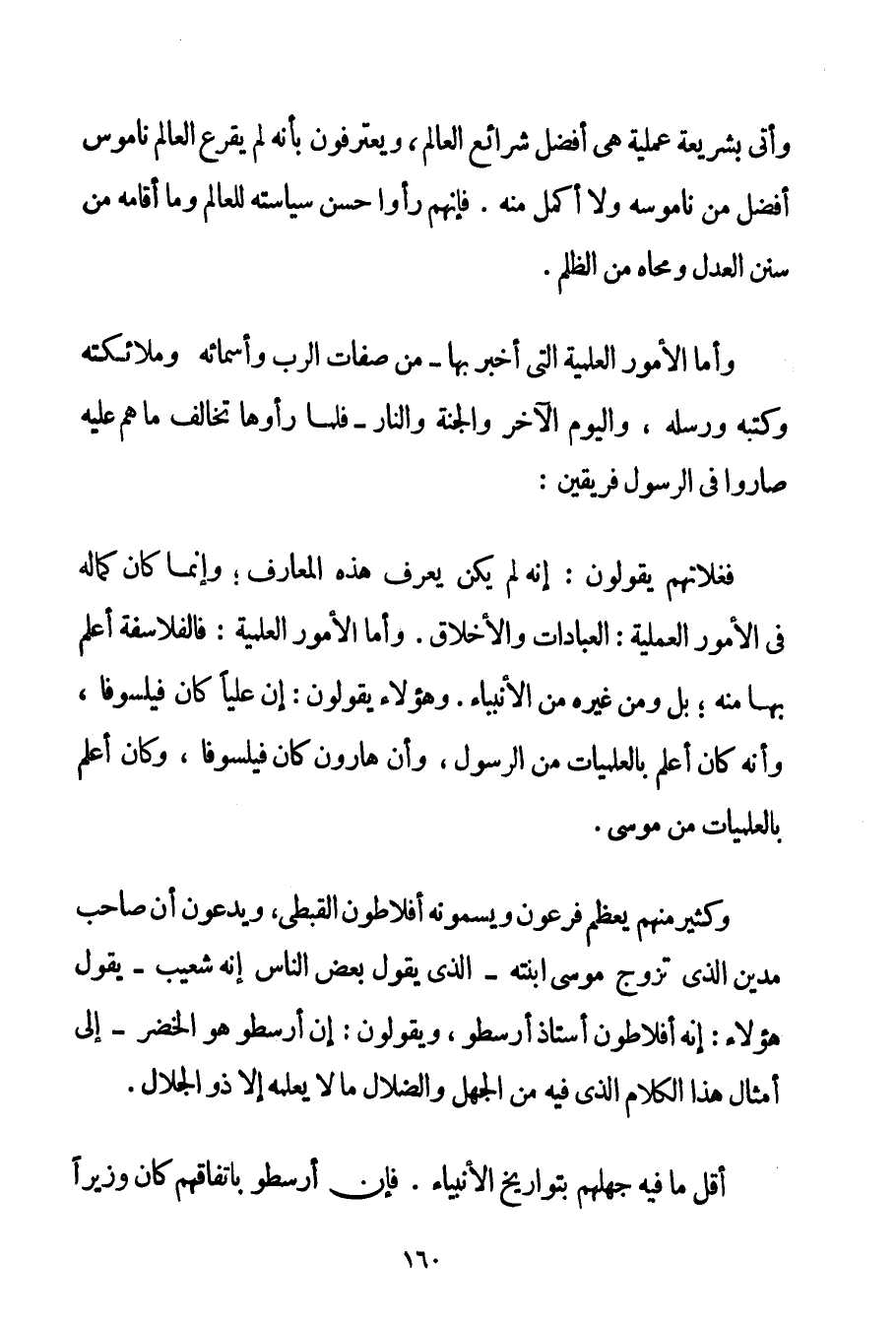 وَأَتَى بِشَرِيعَةِ عَمَلِيَّةٍ هِيَ أَفْضَلُ شَرَائِعِ الْعَالَمِ وَيَعْتَرِفُونَ بِأَنَّهُ لَمْ يَقْرَعْ الْعَالَمَ نَامُوسٌ أَفْضَلُ مِنْ نَامُوسِهِ وَلَا أَكْمَلُ مِنْهُ. فَإِنَّهُمْ رَأَوْا حُسْنَ سِيَاسَتِهِ لِلْعَالَمِ وَمَا أَقَامَهُ مِنْ سُنَنِ الْعَدْلِ وَمَحَاهُ مِنْ الظُّلْمِ. وَأَمَّا الْأُمُورُ الْعِلْمِيَّةُ الَّتِي أَخْبَرَ بِهَا - مِنْ صِفَاتِ الرَّبِّ وَأَسْمَائِهِ وَمَلَائِكَتِهِ وَكُتُبِهِ وَرُسُلِهِ وَالْيَوْمِ الْآخِرِ وَالْجَنَّةِ وَالنَّارِ - فَلَمَّا رَأَوْهَا تُخَالِفُ مَا هُمْ عَلَيْهِ صَارُوا فِي الرَّسُولِ فَرِيقَيْنِ. فَغُلَاتُهُمْ يَقُولُونَ: إنَّهُ لَمْ يَكُنْ يَعْرِفُ هَذِهِ الْمَعَارِفَ؛ وَإِنَّمَا كَانَ كَمَالِهِ فِي الْأُمُورِ الْعَمَلِيَّةِ. الْعِبَادَاتُ وَالْأَخْلَاقُ. وَأَمَّا الْأُمُورُ الْعِلْمِيَّةُ: فَالْفَلَاسِفَةُ أَعْلَمُ بِهَا مِنْهُ؛ بَلْ وَمِنْ غَيْرِهِ مِنْ الْأَنْبِيَاءِ. وَهَؤُلَاءِ يَقُولُونَ: إنَّ عَلِيًّا كَانَ فَيْلَسُوفًا وَأَنَّهُ كَانَ أَعْلَمَ بِالْعِلْمِيَّاتِ مِنْ الرَّسُولِ وَأَنَّ هَارُونَ كَانَ فَيْلَسُوفًا وَكَانَ أَعْلَمَ بِالْعِلْمِيَّاتِ مِنْ مُوسَى. وَكَثِيرٌ مِنْهُمْ يُعَظِّمُ فِرْعَوْنَ وَيُسَمُّونَهُ أَفْلَاطُونَ الْقِبْطِيَّ وَيَدَّعُونَ أَنَّ صَاحِبَ مَدْيَنَ الَّذِي تَزَوَّجَ مُوسَى ابْنَتَهُ - الَّذِي يَقُولُ بَعْضُ النَّاسِ إنَّهُ شُعَيْبٌ - يَقُولُ هَؤُلَاءِ: إنَّهُ أَفْلَاطُونُ أُسْتَاذُ أَرِسْطُو وَيَقُولُونَ: إنَّ أَرِسْطُو هُوَ الْخَضِرُ - إلَى أَمْثَالِ هَذَا الْكَلَامِ الَّذِي فِيهِ مِنْ الْجَهْلِ وَالضَّلَالِ مَا لَا يَعْلَمُهُ إلَّا ذُو الْجَلَالِ. أَقَلُّ مَا فِيهِ جَهْلُهُمْ بِتَوَارِيخِ الْأَنْبِيَاءِ. فَإِنَّ أَرِسْطُو بِاتِّفَاقِهِمْ كَانَ وَزِيرًا