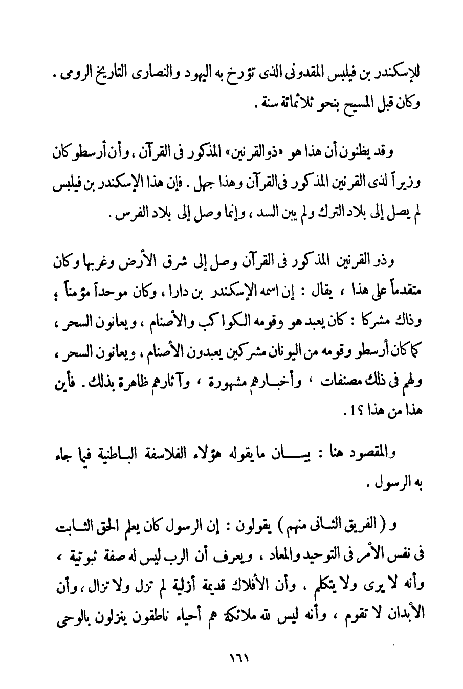لِلْإِسْكَنْدَرِ بْنِ فيلبس الْمَقْدُونِيِّ الَّذِي تُؤَرِّخُ بِهِ الْيَهُودُ وَالنَّصَارَى التَّارِيخَ الرُّومِيَّ. وَكَانَ قَبْلَ الْمَسِيحِ بِنَحْوِ ثَلَاثمِائَةِ سَنَةٍ. وَقَدْ يَظُنُّونَ أَنَّ هَذَا هُوَ " ذُو الْقَرْنَيْنِ " الْمَذْكُورُ فِي الْقُرْآنِ وَأَنَّ أَرِسْطُو كَانَ وَزِيرًا لِذِي الْقَرْنَيْنِ الْمَذْكُورِ فِي الْقُرْآنِ وَهَذَا جَهْلٌ. فَإِنَّ هَذَا الْإِسْكَنْدَرَ بْنَ فيلبس لَمْ يَصِلْ إلَى بِلَادِ التُّرْكِ وَلَمْ يَبْنِ السَّدَّ وَإِنَّمَا وَصَلَ إلَى بِلَادِ الْفُرْسِ. وَذُو الْقَرْنَيْنِ الْمَذْكُورُ فِي الْقُرْآنِ وَصَلَ إلَى شَرْقِ الْأَرْضِ وَغَرْبِهَا وَكَانَ مُتَقَدِّمًا عَلَى هَذَا يُقَالُ: إنَّ اسْمَهُ الْإِسْكَنْدَرُ بْنُ دَارَا وَكَانَ مُوَحِّدًا مُؤْمِنًا؛ وَذَاكَ مُشْرِكًا: كَانَ يَعْبُدُ هُوَ وَقَوْمُهُ الْكَوَاكِبَ وَالْأَصْنَامَ وَيُعَانُونَ السِّحْرَ كَمَا كَانَ أَرِسْطُو وَقَوْمُهُ مِنْ الْيُونَانِ مُشْرِكِينَ يَعْبُدُونَ الْأَصْنَامَ وَيُعَانُونَ السِّحْرَ وَلَهُمْ فِي ذَلِكَ مُصَنَّفَاتٌ وَأَخْبَارُهُمْ مَشْهُورَةٌ وَآثَارُهُمْ ظَاهِرَةٌ بِذَلِكَ. فَأَيْنَ هَذَا مِنْ هَذَا. وَالْمَقْصُودُ هُنَا: بَيَانُ مَا يَقُولُهُ هَؤُلَاءِ الْفَلَاسِفَةُ الْبَاطِنِيَّةُ فِيمَا جَاءَ بِهِ الرَّسُولُ. وَ (الْفَرِيقُ الثَّانِي مِنْهُمْ يَقُولُونَ: إنَّ الرَّسُولَ كَانَ يَعْلَمُ الْحَقَّ الثَّابِتَ فِي نَفْسِ الْأَمْرِ فِي التَّوْحِيدِ وَالْمَعَادِ وَيَعْرِفُ أَنَّ الرَّبَّ لَيْسَ لَهُ صِفَةٌ ثُبُوتِيَّةٌ وَأَنَّهُ لَا يَرَى وَلَا يَتَكَلَّمُ وَأَنَّ الْأَفْلَاكَ قَدِيمَةٌ أَزَلِيَّةٌ لَمْ تَزَلْ وَلَا تَزَالُ وَأَنَّ الْأَبْدَانَ لَا تَقُومُ وَأَنَّهُ لَيْسَ لِلَّهِ مَلَائِكَةٌ هُمْ أَحْيَاءٌ نَاطِقُونَ يَنْزِلُونَ بِالْوَحْيِ