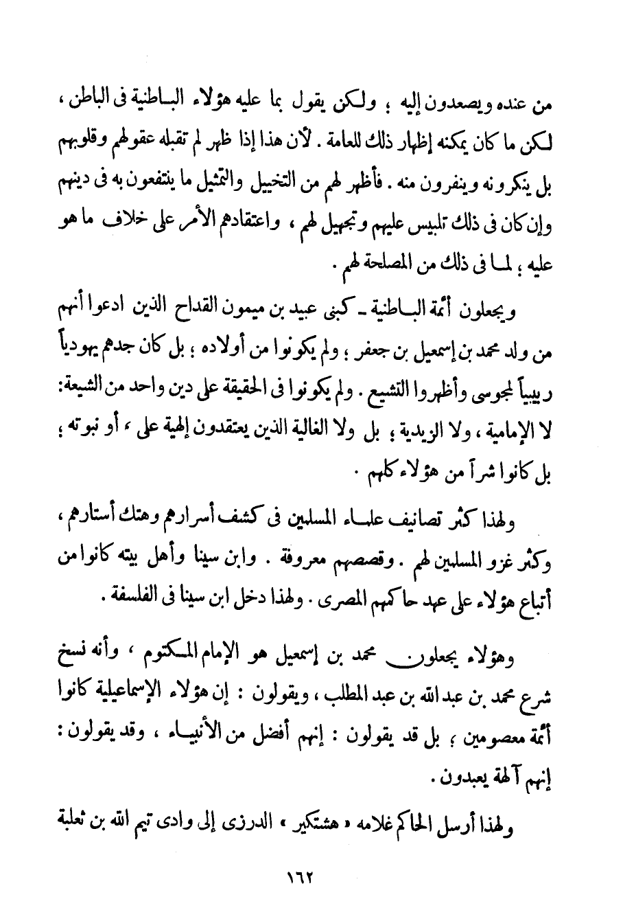 مِنْ عِنْدِهِ وَيَصْعَدُونَ إلَيْهِ؛ وَلَكِنْ يَقُولُ بِمَا عَلَيْهِ هَؤُلَاءِ الْبَاطِنِيَّةُ فِي الْبَاطِنِ لَكِنْ مَا كَانَ يُمْكِنُهُ إظْهَارُ ذَلِكَ لِلْعَامَّةِ. لِأَنَّ هَذَا إذَا ظَهَرَ لَمْ تَقْبَلْهُ عُقُولُهُمْ وَقُلُوبُهُمْ بَلْ يُنْكِرُونَهُ وَيَنْفِرُونَ مِنْهُ. فَأَظْهَرَ لَهُمْ مِنْ التَّخْيِيلِ وَالتَّمْثِيلِ مَا يَنْتَفِعُونَ بِهِ فِي دِينِهِمْ وَإِنْ كَانَ فِي ذَلِكَ تَلْبِيسٌ عَلَيْهِمْ وَتَجْهِيلٌ لَهُمْ وَاعْتِقَادُهُمْ الْأَمْرَ عَلَى خِلَافِ مَا هُوَ عَلَيْهِ؛ لِمَا فِي ذَلِكَ مِنْ الْمَصْلَحَةِ لَهُمْ. وَيَجْعَلُونَ أَئِمَّةَ الْبَاطِنِيَّةِ - كَبَنِي عُبَيْدِ بْنِ مَيْمُونَ الْقَدَّاحِ الَّذِينَ ادَّعَوْا أَنَّهُمْ مِنْ وَلَدِ مُحَمَّدِ بْنِ إسْمَاعِيلَ بْنِ جَعْفَرٍ؛ وَلَمْ يَكُونُوا مِنْ أَوْلَادِهِ؛ بَلْ كَانَ جَدُّهُمْ يَهُودِيًّا ربيبيا لِمَجُوسِيٍّ وَأَظْهَرُوا التَّشَيُّعَ. وَلَمْ يَكُونُوا فِي الْحَقِيقَةِ عَلَى دِينٍ وَاحِدٍ مِنْ الشِّيعَةِ: لَا الْإِمَامِيَّةُ وَلَا الزَّيْدِيَّةُ؛ بَلْ وَلَا الْغَالِيَةُ الَّذِينَ يَعْتَقِدُونَ إلَهِيَّةَ عَلِيٍّ أَوْ نُبُوَّتَهُ؛ بَلْ كَانُوا شَرًّا مِنْ هَؤُلَاءِ كُلِّهِمْ. وَلِهَذَا كَثُرَ تَصَانِيفُ عُلَمَاءِ الْمُسْلِمِينَ فِي كَشْفِ أَسْرَارِهِمْ وَهَتْكِ أَسْتَارِهِمْ وَكَثُرَ غَزْوُ الْمُسْلِمِينَ لَهُمْ. وَقِصَصُهُمْ مَعْرُوفَةٌ. وَابْنُ سِينَا وَأَهْلُ بَيْتِهِ كَانُوا مِنْ أَتْبَاعِ هَؤُلَاءِ عَلَى عَهْدِ حَاكِمِهِمْ الْمِصْرِيِّ. وَلِهَذَا دَخَلَ ابْنُ سِينَا فِي الْفَلْسَفَةِ. وَهَؤُلَاءِ يَجْعَلُونَ مُحَمَّدَ بْنَ إسْمَاعِيلَ هُوَ الْإِمَامُ الْمَكْتُومُ وَأَنَّهُ نَسَخَ شَرْعَ مُحَمَّدِ بْنِ عَبْدِ اللَّهِ بْنِ عَبْدِ الْمُطَّلِبِ وَيَقُولُونَ: إنَّ هَؤُلَاءِ الْإِسْمَاعِيلِيَّة كَانُوا أَئِمَّةً مَعْصُومِينَ؛ بَلْ قَدْ يَقُولُونَ: إنَّهُمْ أَفْضَلُ مِنْ الْأَنْبِيَاءِ وَقَدْ يَقُولُونَ. إنَّهُمْ آلِهَةٌ يُعْبَدُونَ. وَلِهَذَا أَرْسَلَ الْحَاكِمُ غُلَامَهُ " هشتكير " الدُّرْزِيَّ إلَى وَادِي تَيْمِ اللَّهِ بْنِ ثَعْلَبَةَ