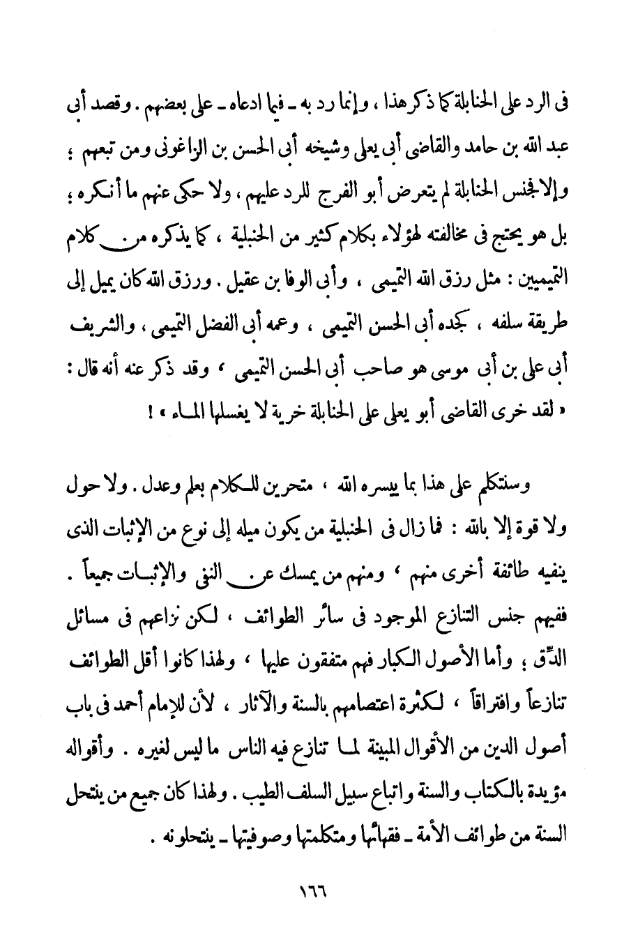 فِي الرَّدِّ عَلَى الْحَنَابِلَةِ كَمَا ذَكَرَ هَذَا وَإِنَّمَا رَدَّ بِهِ - فِيمَا ادَّعَاهُ - عَلَى بَعْضِهِمْ. وَقَصْدَ أَبا عَبْدِ اللَّهِ بْنِ حَامِدٍ وَالْقَاضِي أَبا يَعْلَى وَشَيْخِهِ أَبا الْحَسَنِ بْنِ الزَّاغُونِي وَمَنْ تَبِعَهُمْ؛ وَإِلَّا فَجِنْسُ الْحَنَابِلَةِ لَمْ يَتَعَرَّضْ أَبُو الْفَرَجِ لِلرَّدِّ عَلَيْهِمْ وَلَا حَكَى عَنْهُمْ مَا أَنْكَرَهُ؛ بَلْ هُوَ يَحْتَجُّ فِي مُخَالَفَتِهِ لِهَؤُلَاءِ بِكَلَامِ كَثِيرٍ مِنْ الْحَنْبَلِيَّةِ كَمَا يَذْكُرُهُ مِنْ كَلَامِ التَّمِيمِيِّينَ. مِثْلَ رِزْقِ اللَّهِ التَّمِيمِيِّ وَأَبِي الوفا بْنِ عَقِيلٍ. وَرِزْقُ اللَّهِ كَانَ يَمِيلُ إلَى طَرِيقَةِ سَلَفِهِ كَجَدِّهِ أَبِي الْحَسَنِ التَّمِيمِيِّ وَعَمِّهِ أَبِي الْفَضْلِ التَّمِيمِيِّ وَالشَّرِيفِ أَبِي عَلِيِّ بْنِ أَبِي مُوسَى هُوَ صَاحِبُ أَبِي الْحَسَنِ التَّمِيمِيِّ وَقَدْ ذَكَرَ عَنْهُ أَنَّهُ قَالَ: " لَقَدْ خري الْقَاضِي أَبُو يَعْلَى عَلَى الْحَنَابِلَةِ خرية لَا يَغْسِلُهَا الْمَاءُ " وَسَنَتَكَلَّمُ عَلَى هَذَا بِمَا يُيَسِّرُهُ اللَّهُ مُتَحَرِّينَ لِلْكَلَامِ بِعِلْمِ وَعَدْلٍ. وَلَا حَوْلَ وَلَا قُوَّةَ إلَّا بِاَللَّهِ: فَمَا زَالَ فِي الْحَنْبَلِيَّةِ مَنْ يَكُونُ مَيْلُهُ إلَى نَوْعٍ مِنْ الْإِثْبَاتِ الَّذِي يَنْفِيهِ طَائِفَةٌ أُخْرَى مِنْهُمْ وَمِنْهُمْ مَنْ يُمْسِكُ عَنْ النَّفْيِ وَالْإِثْبَاتِ جَمِيعًا. فَفِيهِمْ جِنْسُ التَّنَازُعِ الْمَوْجُودِ فِي سَائِرِ الطَّوَائِفِ لَكِنَّ نِزَاعَهُمْ فِي مَسَائِلِ الدَّقِّ؛ وَأَمَّا الْأُصُولُ الْكِبَارُ فَهُمْ مُتَّفِقُونَ عَلَيْهَا وَلِهَذَا كَانُوا أَقَلَّ الطَّوَائِفِ تَنَازُعًا وَافْتِرَاقًا لِكَثْرَةِ اعْتِصَامِهِمْ بِالسُّنَّةِ وَالْآثَارِ لِأَنَّ لِلْإِمَامِ أَحْمَدَ فِي بَابِ أُصُولِ الدِّينِ مِنْ الْأَقْوَالِ الْمُبَيِّنَةِ لِمَا تَنَازَعَ فِيهِ النَّاسُ مَا لَيْسَ لِغَيْرِهِ. وَأَقْوَالُهُ مُؤَيَّدَةٌ بِالْكِتَابِ وَالسُّنَّةِ وَاتِّبَاعِ سَبِيلِ السَّلَفِ الطَّيِّبِ. وَلِهَذَا كَانَ جَمِيعُ مَنْ يَنْتَحِلُ السُّنَّةَ مِنْ طَوَائِفِ الْأُمَّةِ - فُقَهَائِهَا وَمُتَكَلِّمَتِهَا وَصُوفِيَّتِهَا - يَنْتَحِلُونَهُ.