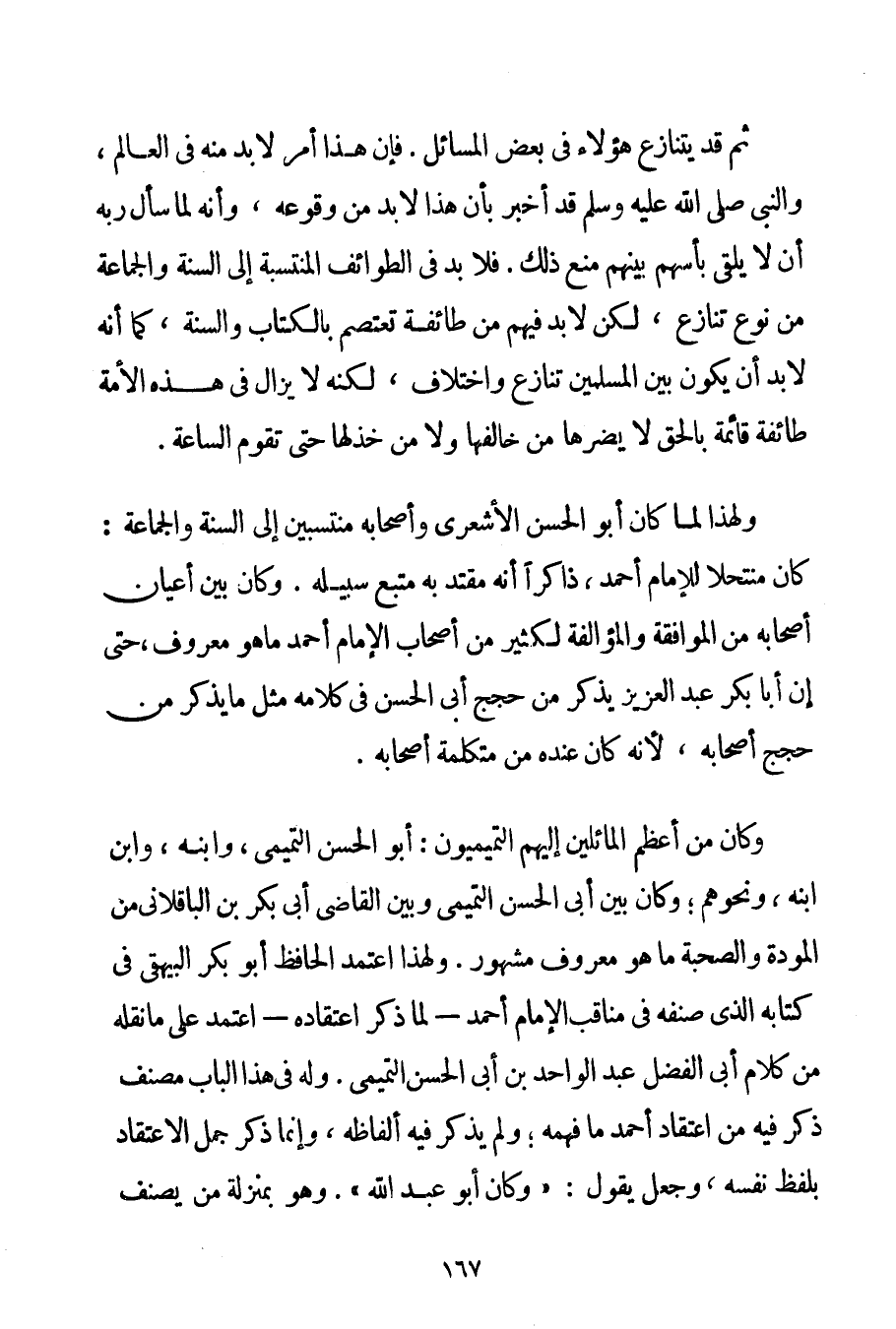 ثُمَّ قَدْ يَتَنَازَعُ هَؤُلَاءِ فِي بَعْضِ الْمَسَائِلِ. فَإِنَّ هَذَا أَمْرٌ لَا بُدَّ مِنْهُ فِي الْعَالِمِ وَالنَّبِيُّ صَلَّى اللَّهُ عَلَيْهِ وَسَلَّمَ قَدْ أَخْبَرَ بِأَنَّ هَذَا لَا بُدَّ مِنْ وُقُوعِهِ وَأَنَّهُ لَمَّا سَأَلَ رَبَّهُ أَنْ لَا يُلْقِي بَأْسَهُمْ بَيْنَهُمْ مُنِعَ ذَلِكَ. فَلَا بُدَّ فِي الطَّوَائِفِ الْمُنْتَسِبَةِ إلَى السُّنَّةِ وَالْجَمَاعَةِ مِنْ نَوْعِ تَنَازُعٍ لَكِنْ لَا بُدَّ فِيهِمْ مِنْ طَائِفَةٍ تَعْتَصِمُ بِالْكِتَابِ وَالسُّنَّةِ كَمَا أَنَّهُ لَا بُدَّ أَنْ يَكُونَ بَيْنَ الْمُسْلِمِينَ تَنَازُعٌ وَاخْتِلَافٌ لَكِنَّهُ لَا يَزَالُ فِي هَذِهِ الْأُمَّةِ طَائِفَةٌ قَائِمَةٌ بِالْحَقِّ لَا يَضُرُّهَا مَنْ خَالَفَهَا وَلَا مَنْ خَذَلَهَا حَتَّى تَقُومَ السَّاعَةُ. وَلِهَذَا لَمَّا كَانَ أَبُو الْحَسَنِ الْأَشْعَرِيُّ وَأَصْحَابُهُ مُنْتَسِبِينَ إلَى السُّنَّةِ وَالْجَمَاعَةِ: كَانَ مُنْتَحِلًا لِلْإِمَامِ أَحْمَدَ ذَاكِرًا أَنَّهُ مُقْتَدٍ بِهِ مُتَّبِعٌ سَبِيلَهُ. وَكَانَ بَيْنَ أَعْيَانِ أَصْحَابِهِ مِنْ الْمُوَافَقَةِ وَالْمُؤَالَفَةِ لِكَثِيرِ مِنْ أَصْحَابِ الْإِمَامِ أَحْمَدَ مَا هُوَ مَعْرُوفٌ حَتَّى إنَّ أَبَا بَكْرٍ عَبْدَ الْعَزِيزِ يَذْكُرُ مِنْ حُجَجِ أَبِي الْحَسَنِ فِي كَلَامِهِ مِثْلَ مَا يُذْكَرُ مِنْ حُجَجِ أَصْحَابِهِ لِأَنَّهُ كَانَ عِنْدَهُ مِنْ مُتَكَلِّمَةِ أَصْحَابِهِ.