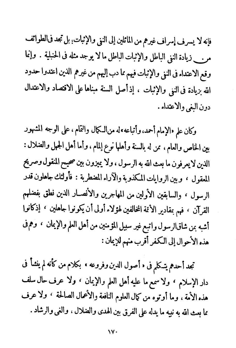 فَإِنَّهُ لَا يُسْرِفُ إسْرَافَ غَيْرِهِمْ مِنْ الْمَائِلِينَ إلَى النَّفْيِ وَالْإِثْبَاتِ؛ بَلْ تَجِدُ فِي الطَّوَائِفِ مِنْ زِيَادَةِ النَّفْيِ الْبَاطِلِ وَالْإِثْبَاتِ الْبَاطِلِ مَا لَا يُوجَدُ مِثْلُهُ فِي الْحَنْبَلِيَّةِ. وَإِنَّمَا وَقَعَ الِاعْتِدَاءُ فِي النَّفْيِ وَالْإِثْبَاتِ فِيهِمْ مِمَّا دَبَّ إلَيْهِمْ مِنْ غَيْرِهِمْ الَّذِينَ اعْتَدَوْا حُدُودَ اللَّهِ بِزِيَادَةِ فِي النَّفْيِ وَالْإِثْبَاتِ إذْ أَصْلُ السُّنَّةِ مَبْنَاهَا عَلَى الِاقْتِصَادِ وَالِاعْتِدَالِ دُونَ الْبَغْيِ وَالِاعْتِدَاءِ. وَكَانَ عِلْمُ " الْإِمَامِ أَحْمَدَ وَأَتْبَاعِهِ " لَهُ مِنْ الْكَمَالِ وَالتَّمَامِ عَلَى الْوَجْهِ الْمَشْهُورِ بَيْنَ الْخَاصِّ وَالْعَامِّ مِمَّنْ لَهُ بِالسُّنَّةِ وَأَهْلِهَا نَوْعُ إلْمَامٍ وَأَمَّا أَهْلُ الْجَهْلِ وَالضَّلَالِ: الَّذِينَ لَا يَعْرِفُونَ مَا بَعَثَ اللَّهُ بِهِ الرَّسُولَ وَلَا يُمَيِّزُونَ بَيْنَ صَحِيحِ الْمَنْقُولِ وَصَرِيحِ الْمَعْقُولِ وَبَيْنَ الرِّوَايَاتِ الْمَكْذُوبَةِ وَالْآرَاءِ الْمُضْطَرِبَةِ: فَأُولَئِكَ جَاهِلُونَ قَدْرَ الرَّسُولِ وَالسَّابِقِينَ الْأَوَّلِينَ مِنْ الْمُهَاجِرِينَ وَالْأَنْصَارِ الَّذِينَ نَطَقَ بِفَضْلِهِمْ الْقُرْآنُ فَهُمْ بِمَقَادِيرِ الْأَئِمَّةِ الْمُخَالِفِينَ لِهَؤُلَاءِ أَوْلَى أَنْ يَكُونُوا جَاهِلِينَ إذْ كَانُوا أَشْبَهَ بِمَنْ شَاقَّ الرَّسُولَ وَاتَّبَعَ غَيْرَ سَبِيلِ الْمُؤْمِنِينَ مِنْ أَهْلِ الْعِلْمِ وَالْإِيمَانِ وَهُمْ فِي هَذِهِ الْأَحْوَالِ إلَى الْكُفْرِ أَقْرَبُ مِنْهُمْ لِلْإِيمَانِ: تَجِدُ أَحَدَهُمْ يَتَكَلَّمُ فِي " أُصُولِ الدِّينِ وَفُرُوعِهِ " بِكَلَامِ مَنْ كَأَنَّهُ لَمْ يَنْشَأْ فِي دَارِ الْإِسْلَامِ وَلَا سَمِعَ مَا عَلَيْهِ أَهْلُ الْعِلْمِ وَالْإِيمَانِ وَلَا عَرَفَ حَالَ سَلَفِ هَذِهِ الْأُمَّةِ وَمَا أُوتُوهُ مِنْ كَمَالِ الْعُلُومِ النَّافِعَةِ وَالْأَعْمَالِ الصَّالِحَةِ وَلَا عَرَفَ مِمَّا بَعَثَ اللَّهُ بِهِ نَبِيَّهُ مَا يَدُلُّهُ عَلَى الْفَرْقِ بَيْنَ الْهُدَى وَالضَّلَالِ وَالْغَيِّ وَالرَّشَادِ.