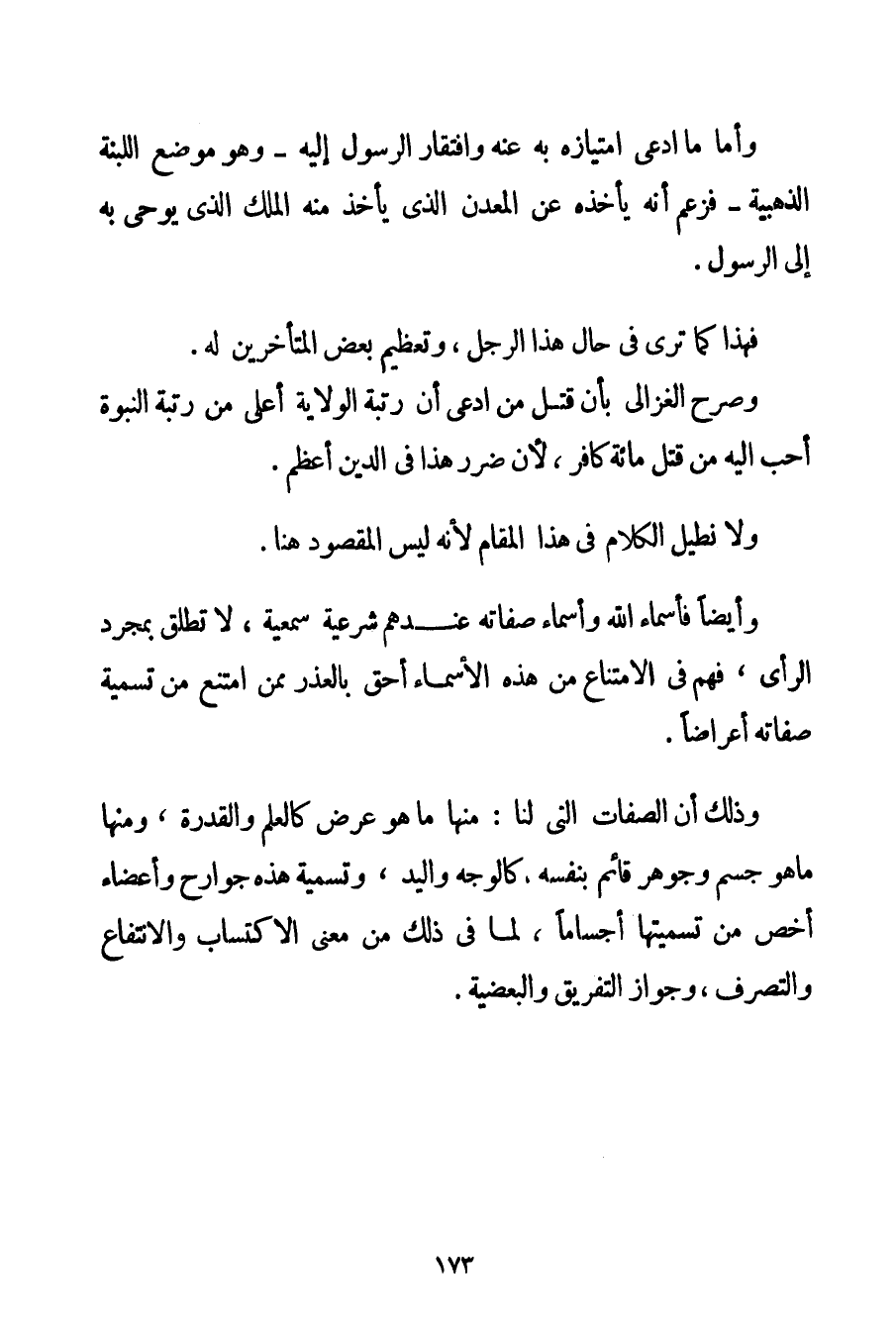 وَأَمَّا مَا ادَّعَى امْتِيَازَهُ بِهِ عَنْهُ وَافْتِقَارَ الرَّسُولِ إلَيْهِ - وَهُوَ مَوْضِعُ اللَّبِنَةِ الذَّهَبِيَّةِ - فَزَعَمَ أَنَّهُ يَأْخُذُهُ عَنْ الْمَعْدِنِ الَّذِي يَأْخُذُ مِنْهُ الْمَلَكُ الَّذِي يُوحَى بِهِ إلَى الرَّسُولِ. فَهَذَا كَمَا تَرَى فِي حَالِ هَذَا الرَّجُلِ وَتَعْظِيمِ بَعْضِ الْمُتَأَخِّرِينَ لَهُ. وَصَرَّحَ الْغَزَالِيُّ بِأَنَّ قَتْلَ مَنْ ادَّعَى أَنَّ رُتْبَةَ الْوِلَايَةِ أَعْلَى مِنْ رُتْبَةِ النُّبُوَّةِ أَحَبُّ إلَيْهِ مِنْ قَتْلِ مِائَةِ كَافِرٍ لِأَنَّ ضَرَرَ هَذَا فِي الدِّينِ أَعْظَمُ. وَلَا نُطِيلُ الْكَلَامَ فِي هَذَا الْمَقَامِ لِأَنَّهُ لَيْسَ الْمَقْصُودُ هُنَا. وَأَيْضًا فَأَسْمَاءُ اللَّهِ وَأَسْمَاءُ صِفَاتِهِ عِنْدَهُمْ شَرْعِيَّةٌ سَمْعِيَّةٌ لَا تُطْلَقُ بِمُجَرَّدِ الرَّأْيِ فَهُمْ فِي الِامْتِنَاعِ مِنْ هَذِهِ الْأَسْمَاءِ أَحَقُّ بِالْعُذْرِ مِمَّنْ امْتَنَعَ مِنْ تَسْمِيَةِ صِفَاتِهِ أَعْرَاضًا. وَذَلِكَ أَنَّ الصِّفَاتِ الَّتِي لَنَا: مِنْهَا مَا هُوَ عَرَضٌ كَالْعِلْمِ وَالْقُدْرَةِ وَمِنْهَا مَا هُوَ جِسْمٌ وَجَوْهَرٌ قَائِمٌ بِنَفْسِهِ كَالْوَجْهِ وَالْيَدِ وَتَسْمِيَةُ هَذِهِ جَوَارِحَ وَأَعْضَاءَ أَخَصُّ مِنْ تَسْمِيَتِهَا أَجْسَامًا لِمَا فِي ذَلِكَ مِنْ مَعْنَى الِاكْتِسَابِ وَالِانْتِفَاعِ وَالتَّصَرُّفِ وَجَوَازِ التَّفْرِيقِ وَالْبَعْضِيَّةِ.