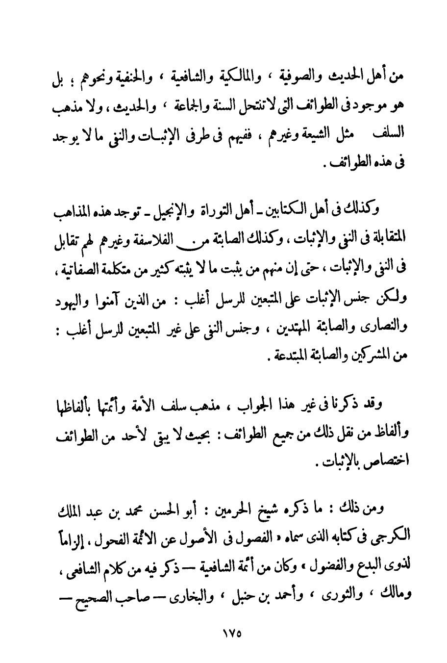 مِنْ أَهْلِ الْحَدِيثِ وَالصُّوفِيَّةِ وَالْمَالِكِيَّةِ وَالشَّافِعِيَّةِ وَالْحَنَفِيَّةِ وَنَحْوِهِمْ؛ بَلْ هُوَ مَوْجُودٌ فِي الطَّوَائِفِ الَّتِي لَا تَنْتَحِلُ السُّنَّةَ وَالْجَمَاعَةَ وَالْحَدِيثَ وَلَا مَذْهَبَ السَّلَفِ مِثْلِ الشِّيعَةِ وَغَيْرِهِمْ فَفِيهِمْ فِي طَرَفَيْ الْإِثْبَاتِ وَالنَّفْيِ مَا لَا يُوجَدُ فِي هَذِهِ الطَّوَائِفِ. وَكَذَلِكَ فِي أَهْلِ الْكِتَابَيْنِ - أَهْلِ التَّوْرَاةِ وَالْإِنْجِيلِ - تُوجَدُ هَذِهِ الْمَذَاهِبُ الْمُتَقَابِلَةُ فِي النَّفْيِ وَالْإِثْبَاتِ وَكَذَلِكَ الصَّابِئَةُ مِنْ الْفَلَاسِفَةِ وَغَيْرِهِمْ لَهُمْ تَقَابُلٌ فِي النَّفْيِ وَالْإِثْبَاتِ حَتَّى إنَّ مِنْهُمْ مَنْ يُثْبِتُ مَا لَا يُثْبِتُهُ كَثِيرٌ مِنْ مُتَكَلِّمَةِ الصفاتية وَلَكِنْ جِنْسُ الْإِثْبَاتِ عَلَى الْمُتَّبِعِينَ لِلرُّسُلِ أَغْلَبُ: مِنْ الَّذِينَ آمَنُوا وَالْيَهُودِ وَالنَّصَارَى وَالصَّابِئَةِ الْمُهْتَدِينَ وَجِنْسُ النَّفْيِ عَلَى غَيْرِ الْمُتَّبِعِينَ لِلرُّسُلِ أَغْلَبُ: مِنْ الْمُشْرِكِينَ وَالصَّابِئَةِ الْمُبْتَدِعَةِ. وَقَدْ ذَكَرْنَا فِي غَيْرِ هَذَا الْجَوَابِ مَذْهَبَ سَلَفِ الْأُمَّةِ وَأَئِمَّتِهَا بِأَلْفَاظِهَا وَأَلْفَاظِ مَنْ نَقَلَ ذَلِكَ مِنْ جَمِيعِ الطَّوَائِفِ: بِحَيْثُ لَا يَبْقَى لِأَحَدِ مِنْ الطَّوَائِفِ اخْتِصَاصٌ بِالْإِثْبَاتِ.
