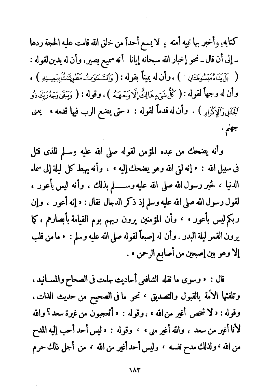 كِتَابُهُ؛ وَأَخْبَرَ بِهَا نَبِيُّهُ أُمَّتَهُ؛ لَا يَسَعُ أَحَدًا مِنْ خَلْقِ اللَّهِ قَامَتْ عَلَيْهِ الْحُجَّةُ رَدُّهَا - إلَى أَنْ قَالَ - نَحْوَ إخْبَارِ اللَّهِ سُبْحَانَهُ إيَّانَا أَنَّهُ سَمِيعٌ بَصِيرٌ وَأَنَّ لَهُ يَدَيْنِ لِقَوْلِهِ: {بَلْ يَدَاهُ مَبْسُوطَتَانِ} وَأَنَّ لَهُ يَمِينًا بِقَوْلِهِ: {وَالسَّمَاوَاتُ مَطْوِيَّاتٌ بِيَمِينِهِ} وَأَنَّ لَهُ وَجْهًا لِقَوْلِهِ: {كُلُّ شَيْءٍ هَالِكٌ إلَّا وَجْهَهُ} وَقَوْلُهُ: {وَيَبْقَى وَجْهُ رَبِّكَ ذُو الْجَلَالِ وَالْإِكْرَامِ} وَأَنَّ لَهُ قَدَمًا لِقَوْلِهِ: {حَتَّى يَضَعَ الرَّبُّ فِيهَا قَدَمَهُ} يَعْنِي جَهَنَّمَ. وَأَنَّهُ يَضْحَكُ مِنْ عَبْدِهِ الْمُؤْمِنِ {لِقَوْلِهِ صَلَّى اللَّهُ عَلَيْهِ وَسَلَّمَ لِلَّذِي قُتِلَ فِي سَبِيلِ اللَّهِ: إنَّهُ لَقِيَ اللَّهَ وَهُوَ يَضْحَكُ إلَيْهِ} وَأَنَّهُ يَهْبِطُ كُلَّ لَيْلَةٍ إلَى سَمَاءِ الدُّنْيَا لِخَبَرِ رَسُولِ اللَّهِ صَلَّى اللَّهُ عَلَيْهِ وَسَلَّمَ بِذَلِكَ وَأَنَّهُ لَيْسَ بِأَعْوَرَ {لِقَوْلِ رَسُولِ اللَّهِ صَلَّى اللَّهُ عَلَيْهِ وَسَلَّمَ إذْ ذَكَرَ الدَّجَّالَ فَقَالَ: إنَّهُ أَعْوَرُ وَإِنَّ رَبَّكُمْ لَيْسَ بِأَعْوَرَ} وَأَنَّ الْمُؤْمِنِينَ يَرَوْنَ رَبَّهُمْ يَوْمَ الْقِيَامَةِ بِأَبْصَارِهِمْ كَمَا يَرَوْنَ الْقَمَرَ لَيْلَةَ الْبَدْرِ وَأَنَّ لَهُ إصْبَعًا لِقَوْلِهِ صَلَّى اللَّهُ عَلَيْهِ وَسَلَّمَ {مَا مِنْ قَلْبٍ إلَّا وَهُوَ بَيْنَ إصْبَعَيْنِ مِنْ أَصَابِعِ الرَّحْمَنِ} . قَالَ: " وَسِوَى مَا نَقَلَهُ الشَّافِعِيُّ أَحَادِيثُ جَاءَتْ فِي الصِّحَاحِ وَالْمَسَانِيدِ وَتَلَقَّتْهَا الْأُمَّةُ بِالْقَبُولِ وَالتَّصْدِيقِ نَحْوَ مَا فِي الصَّحِيحِ مِنْ حَدِيثِ الذَّاتِ وَقَوْلِهِ: {لَا شَخْصَ أَغْيَرُ مِنْ اللَّهِ} وَقَوْلِهِ: {أَتَعْجَبُونَ مِنْ غَيْرَةِ سَعْدٍ؟ وَاَللَّهِ لَأَنَا أَغْيَرُ مِنْ سَعْدٍ وَاَللَّهُ أَغْيَرُ مِنِّي} وَقَوْلِهِ: {لَيْسَ أَحَدٌ أَحَبَّ إلَيْهِ الْمَدْحُ مِنْ اللَّهِ وَلِذَلِكَ مَدَحَ نَفْسَهُ وَلَيْسَ أَحَدٌ أَغْيَرَ مِنْ اللَّهِ مِنْ أَجْلِ ذَلِكَ حَرَّمَ