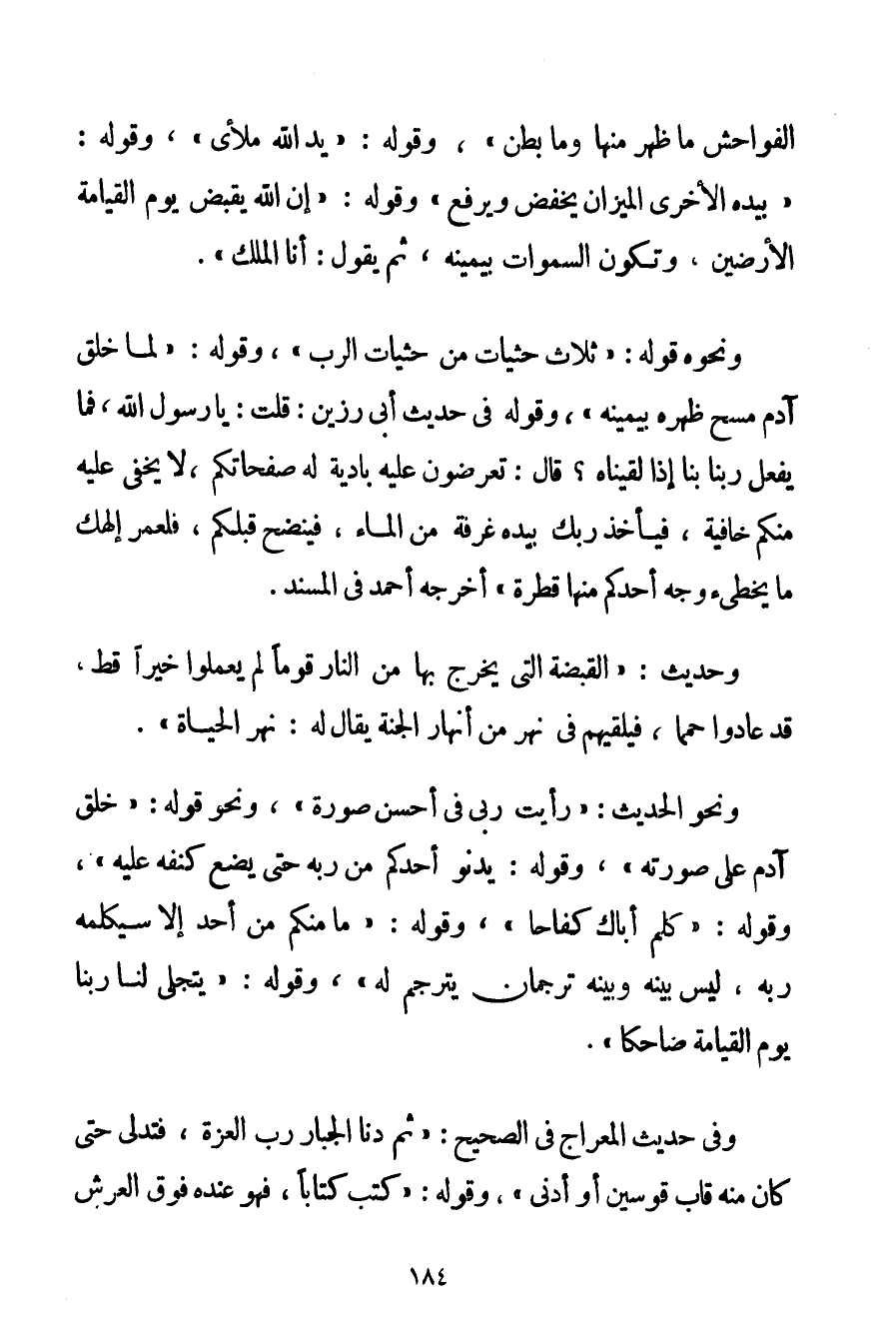 الْفَوَاحِشَ مَا ظَهَرَ مِنْهَا وَمَا بَطَنَ} وَقَوْلِهِ: {يَدُ اللَّهِ مَلْأَى} وَقَوْلِهِ: {بِيَدِهِ الْأُخْرَى الْمِيزَانُ يَخْفِضُ وَيَرْفَعُ} وَقَوْلِهِ: {إنَّ اللَّهَ يَقْبِضُ يَوْمَ الْقِيَامَةِ الْأَرْضِينَ وَتَكُونُ السَّمَوَاتُ بِيَمِينِهِ ثُمَّ يَقُولُ: أَنَا الْمَلِكُ} . وَنَحْوُهُ قَوْلُهُ: {ثَلَاثَ حَثَيَاتٍ مِنْ حَثَيَاتِ الرَّبِّ} وَقَوْلُهُ: {لَمَّا خَلَقَ آدَمَ مَسَحَ ظَهْرَهُ بِيَمِينِهِ} وَقَوْلُهُ فِي {حَدِيثِ أَبِي رَزِينٍ: قُلْت: يَا رَسُولَ اللَّهِ فَمَا يَفْعَلُ رَبُّنَا بِنَا إذَا لَقِينَاهُ؟ قَالَ: تُعْرَضُونَ عَلَيْهِ بَادِيَةً لَهُ صَفَحَاتُكُمْ لَا يَخْفَى عَلَيْهِ مِنْكُمْ خَافِيَةٌ فَيَأْخُذُ رَبُّك بِيَدِهِ غَرْفَةً مِنْ الْمَاءِ فَيَنْضَحُ قِبَلَكُمْ فَلَعَمْرُ إلَهِك مَا يُخْطِئُ وَجْهَ أَحَدِكُمْ مِنْهَا قَطْرَةٌ} أَخْرَجَهُ أَحْمَدُ فِي الْمُسْنَدِ. وَحَدِيثُ: {الْقَبْضَةُ الَّتِي يُخْرِجُ بِهَا مِنْ النَّارِ قَوْمًا لَمْ يَعْمَلُوا خَيْرًا قَطُّ قَدْ عَادُوا حُمَمًا فَيُلْقِيهِمْ فِي نَهْرٍ مِنْ أَنْهَارِ الْجَنَّةِ يُقَالُ لَهُ. نَهْرُ الْحَيَاةِ} . وَنَحْوُ الْحَدِيثِ: {رَأَيْت رَبِّي فِي أَحْسَنِ صُورَةٍ} وَنَحْوُ قَوْلِهِ: {خَلَقَ آدَمَ عَلَى صُورَتِهِ} وَقَوْلِهِ: {يَدْنُو أَحَدُكُمْ مِنْ رَبِّهِ حَتَّى يَضَعَ كَنَفَهُ عَلَيْهِ} وَقَوْلِهِ: {كَلَّمَ أَبَاك كِفَاحًا} وَقَوْلِهِ: {مَا مِنْكُمْ مِنْ أَحَدٍ إلَّا سَيُكَلِّمُهُ رَبُّهُ لَيْسَ بَيْنَهُ وَبَيْنَهُ تُرْجُمَانٌ يُتَرْجِمُ لَهُ} وَقَوْلِهِ: {يَتَجَلَّى لَنَا رَبُّنَا يَوْمَ الْقِيَامَةِ ضَاحِكًا} . وَفِي حَدِيثِ الْمِعْرَاجِ فِي الصَّحِيحِ: {ثُمَّ دَنَا الْجَبَّارُ رَبُّ الْعِزَّةِ فَتَدَلَّى حَتَّى كَانَ مِنْهُ قَابَ قَوْسَيْنِ أَوْ أَدْنَى} وَقَوْلِهِ: {كَتَبَ كِتَابًا فَهُوَ عِنْدَهُ فَوْقَ الْعَرْشِ