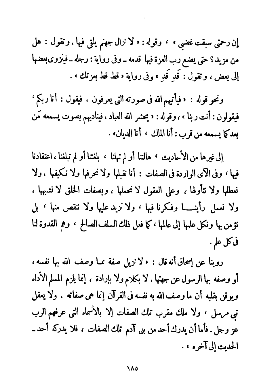 إنَّ رَحْمَتِي سَبَقَتْ غَضَبِي} وَقَوْلِهِ: {لَا تَزَالُ جَهَنَّمُ يُلْقَى فِيهَا وَتَقُولُ: هَلْ مِنْ مَزِيدٍ؟ حَتَّى يَضَعَ رَبُّ الْعِزَّةِ فِيهَا قَدَمَهُ - وَفِي رِوَايَةٍ: رِجْلَهُ - فَيَنْزَوِي بَعْضُهَا إلَى بَعْضٍ وَتَقُولُ: قَدْ قَدْ وَفِي رِوَايَةٍ قَطُّ قَطُّ بِعِزَّتِك} . وَنَحْوُ قَوْلِهِ: {فَيَأْتِيهِمْ اللَّهُ فِي صُورَتِهِ الَّتِي يَعْرِفُونَ فَيَقُولُ: أَنَا رَبُّكُمْ فَيَقُولُونَ: أَنْتَ رَبُّنَا} وَقَوْلِهِ: {يَحْشُرُ اللَّهُ الْعِبَادَ فَيُنَادِيهِمْ بِصَوْتِ يَسْمَعُهُ مَنْ بَعُدَ كَمَا يَسْمَعُهُ مَنْ قَرُبَ: أَنَا الْمَلِكُ أَنَا الدَّيَّانُ} . إلَى غَيْرِهَا مِنْ الْأَحَادِيثِ هَالَتْنَا أَوْ لَمْ تَهُلْنَا بَلَغَتْنَا أَوْ لَمْ تَبْلُغْنَا اعْتِقَادُنَا فِيهَا وَفِي الْآيِ الْوَارِدَةِ فِي الصِّفَاتِ: أَنَّا نَقْبَلُهَا وَلَا نُحَرِّفُهَا وَلَا نُكَيِّفُهَا وَلَا نُعَطِّلُهَا وَلَا نَتَأَوَّلُهَا وَعَلَى الْعُقُولِ لَا نَحْمِلُهَا وَبِصِفَاتِ الْخَلْقِ لَا نُشَبِّهُهَا وَلَا نُعْمِلُ رَأْيَنَا وَفِكْرَنَا فِيهَا وَلَا نَزِيدُ عَلَيْهَا وَلَا نَنْقُصُ مِنْهَا بَلْ نُؤْمِنُ بِهَا وَنَكِلُ عِلْمَهَا إلَى عَالَمِهَا كَمَا فَعَلَ ذَلِكَ السَّلَفُ الصَّالِحُ وَهُمْ الْقُدْوَةُ لَنَا فِي كُلِّ عِلْمٍ. رُوِينَا عَنْ إسْحَاقَ أَنَّهُ قَالَ: " لَا نُزِيلُ صِفَةً مِمَّا وَصَفَ اللَّهُ بِهَا نَفْسَهُ أَوْ وَصَفَهُ بِهَا الرَّسُولُ عَنْ جِهَتِهَا لَا بِكَلَامِ وَلَا بِإِرَادَةِ إنَّمَا يَلْزَمُ الْمُسْلِمَ الْأَدَاءُ وَيُوقِنُ بِقَلْبِهِ أَنَّ مَا وَصَفَ اللَّهُ بِهِ نَفْسَهُ فِي الْقُرْآنِ إنَّمَا هِيَ صِفَاتُهُ وَلَا يَعْقِلُ نَبِيٌّ مُرْسَلٌ وَلَا مَلَكٌ مُقَرَّبٌ تِلْكَ الصِّفَاتِ إلَّا بِالْأَسْمَاءِ الَّتِي عَرَّفَهُمْ الرَّبُّ عَزَّ وَجَلَّ. فَإِمَّا أَنْ يُدْرِكَ أَحَدٌ مِنْ بَنِي آدَمَ تِلْكَ الصِّفَاتِ فَلَا يُدْرِكُهُ أَحَدٌ - الْحَدِيثَ إلَى آخِرِهِ
