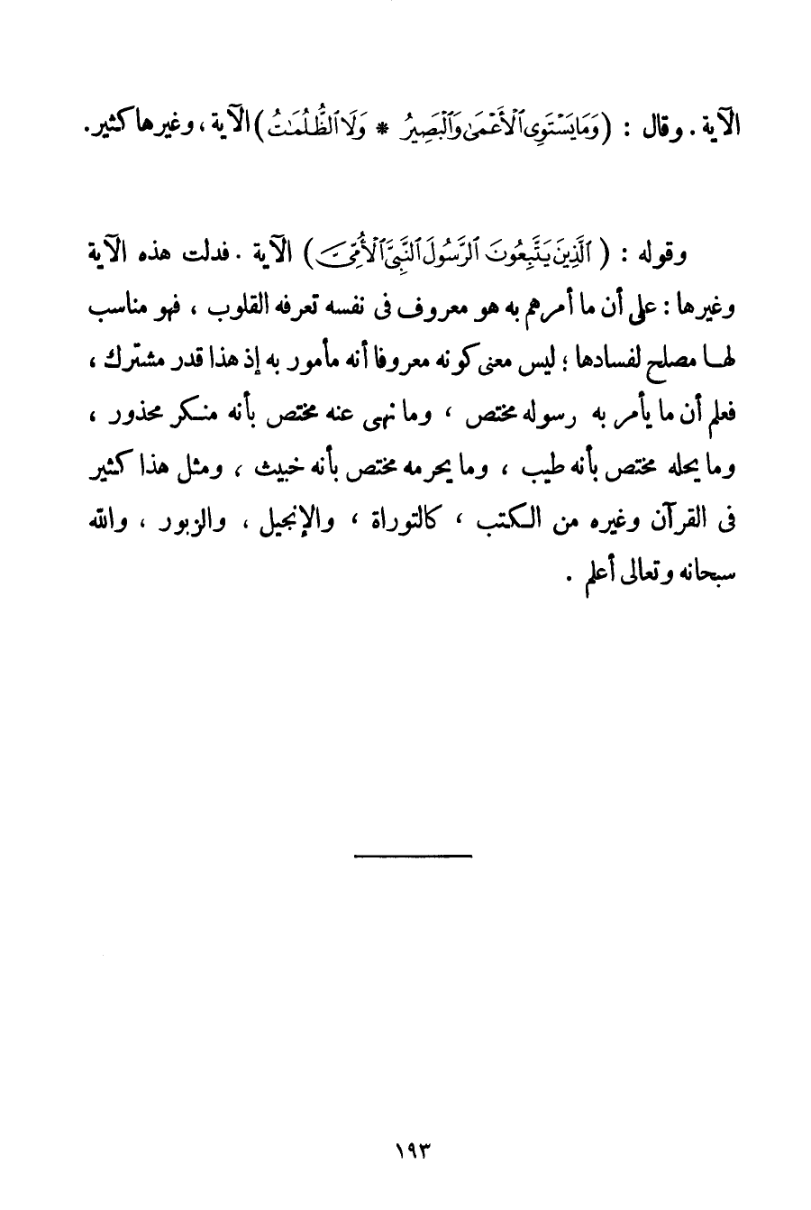 كَالْمُجْرِمِينَ} الْآيَةَ. وَقَالَ: {وَمَا يَسْتَوِي الْأَعْمَى وَالْبَصِيرُ} {وَلَا الظُّلُمَاتُ} الْآيَةَ وَغَيْرُهَا كَثِيرٌ. وَقَوْلِهِ: {الَّذِينَ يَتَّبِعُونَ الرَّسُولَ النَّبِيَّ الْأُمِّيَّ} الْآيَةَ. فَدَلَّتْ هَذِهِ الْآيَةُ وَغَيْرُهَا: عَلَى أَنَّ مَا أَمَرَهُمْ بِهِ هُوَ مَعْرُوفٌ فِي نَفْسِهِ تَعْرِفُهُ الْقُلُوبُ فَهُوَ مُنَاسِبٌ لَهَا مُصْلِحٌ لِفَسَادِهَا؛ لَيْسَ مَعْنَى كَوْنِهِ مَعْرُوفًا أَنَّهُ مَأْمُورٌ بِهِ إذْ هَذَا قَدْرٌ مُشْتَرَكٌ فَعُلِمَ أَنَّ مَا يَأْمُرُ بِهِ رَسُولَهُ مُخْتَصٌّ وَمَا نَهَى عَنْهُ مُخْتَصٌّ بِأَنَّهُ مُنْكَرٌ مَحْذُورٌ وَمَا يُحِلُّهُ مُخْتَصٌّ بِأَنَّهُ طَيِّبٌ وَمَا يُحَرِّمُهُ مُخْتَصٌّ بِأَنَّهُ خَبِيثٌ وَمِثْلُ هَذَا كَثِيرٌ فِي الْقُرْآنِ وَغَيْرِهِ مِنْ الْكُتُبِ كَالتَّوْرَاةِ وَالْإِنْجِيلِ وَالزَّبُورِ وَاَللَّهُ سُبْحَانَهُ وَتَعَالَى أَعْلَمُ.