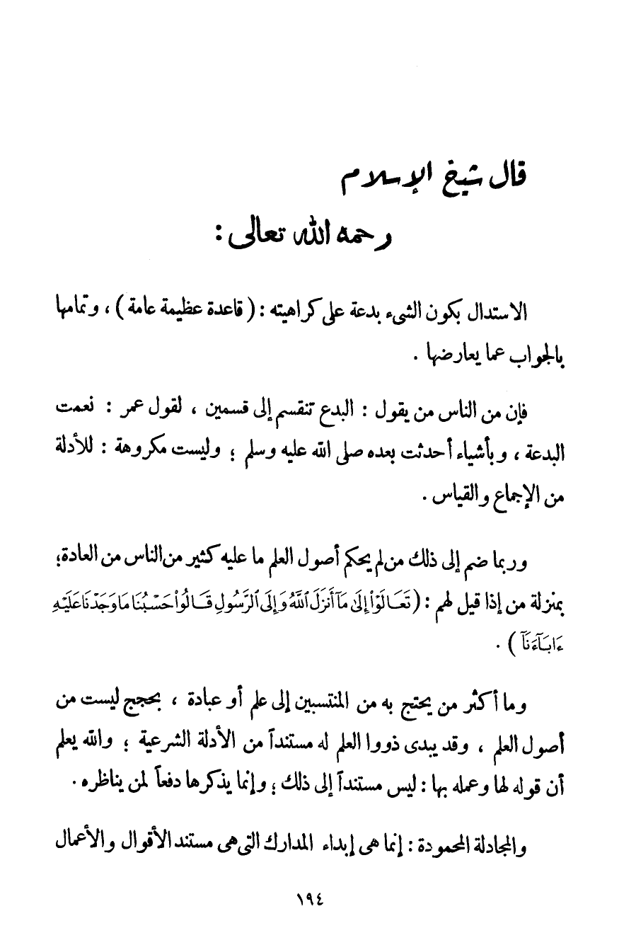 فَإِنَّ مِنْ النَّاسِ مَنْ يَقُولُ: الْبِدَعُ تَنْقَسِمُ إلَى قِسْمَيْنِ لِقَوْلِ عُمَرَ: نِعْمَتْ الْبِدْعَةُ وَبِأَشْيَاءَ أُحْدِثَتْ بَعْدَهُ صَلَّى اللَّهُ عَلَيْهِ وَسَلَّمَ وَلَيْسَتْ مَكْرُوهَةً: لِلْأَدِلَّةِ مِنْ الْإِجْمَاعِ وَالْقِيَاسِ. وَرُبَّمَا ضُمَّ إلَى ذَلِكَ مَنْ لَمْ يُحَكِّمْ أُصُولَ الْعِلْمِ مَا عَلَيْهِ كَثِيرٌ مِنْ النَّاسِ مِنْ الْعَادَةِ؛ بِمَنْزِلَةِ مَنْ إذَا قِيلَ لَهُمْ: {تَعَالَوْا إلَى مَا أَنْزَلَ اللَّهُ وَإِلَى الرَّسُولِ قَالُوا حَسْبُنَا مَا وَجَدْنَا عَلَيْهِ آبَاءَنَا} . وَمَا أَكْثَرَ مَنْ يُحْتَجُّ بِهِ مِنْ الْمُنْتَسِبِينَ إلَى عِلْمٍ أَوْ عِبَادَةٍ بِحُجَجِ لَيْسَتْ مِنْ أُصُولِ الْعِلْمِ وَقَدْ يُبْدِي ذووا الْعِلْمِ لَهُ مُسْتَنَدًا مِنْ الْأَدِلَّةِ الشَّرْعِيَّةِ؛ وَاَللَّهُ يَعْلَمُ أَنَّ قَوْلَهُ لَهَا وَعَمَلَهُ بِهَا: لَيْسَ مُسْتَنِدًا إلَى ذَلِكَ؛ وَإِنَّمَا يَذْكُرُهَا دَفْعًا لِمَنْ يُنَاظِرُهُ. وَالْمُجَادَلَةُ الْمَحْمُودَةُ: إنَّمَا هِيَ إبْدَاءُ الْمَدَارِكِ الَّتِي هِيَ مُسْتَنَدُ الْأَقْوَالِ وَالْأَعْمَالِ