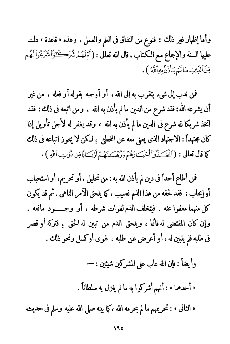 وَأَمَّا إظْهَارُ غَيْرِ ذَلِكَ: فَنَوْعٌ مِنْ النِّفَاقِ فِي الْعِلْمِ وَالْعَمَلِ وَهَذِهِ " قَاعِدَةٌ " دَلَّتْ عَلَيْهَا السُّنَّةُ وَالْإِجْمَاعُ مَعَ الْكِتَابِ قَالَ اللَّهُ تَعَالَى: {أَمْ لَهُمْ شُرَكَاءُ شَرَعُوا لَهُمْ مِنَ الدِّينِ مَا لَمْ يَأْذَنْ بِهِ اللَّهُ} . فَمَنْ نُدِبَ إلَى شَيْءٍ يَتَقَرَّبُ بِهِ إلَى اللَّهِ أَوْ أَوْجَبَهُ بِقَوْلِهِ أَوْ فِعْلِهِ مِنْ غَيْرِ أَنْ يُشَرِّعَهُ اللَّهُ: فَقَدْ شَرَعَ مِنْ الدِّينِ مَا لَمْ يَأْذَنْ بِهِ اللَّهُ وَمَنْ اتَّبَعَهُ فِي ذَلِكَ: فَقَدْ اتَّخَذَ شَرِيكًا لِلَّهِ شَرَعَ فِي الدِّينِ مَا لَمْ يَأْذَنْ بِهِ اللَّهُ وَقَدْ يُغْفَرُ لَهُ لِأَجْلِ تَأْوِيلٍ إذَا كَانَ مُجْتَهِدًا: الِاجْتِهَادَ الَّذِي يُعْفَى مَعَهُ عَنْ الْمُخْطِئِ؛ لَكِنْ لَا يَجُوزُ اتِّبَاعُهُ فِي ذَلِكَ كَمَا قَالَ تَعَالَى: {اتَّخَذُوا أَحْبَارَهُمْ وَرُهْبَانَهُمْ أَرْبَابًا مِنْ دُونِ اللَّهِ} . فَمَنْ أَطَاعَ أَحَدًا فِي دِينٍ لَمْ يَأْذَنْ اللَّهُ بِهِ: مِنْ تَحْلِيلٍ أَوْ تَحْرِيمٍ أَوْ اسْتِحْبَابٍ أَوْ إيجَابٍ: فَقَدْ لَحِقَهُ مِنْ هَذَا الذَّمِّ نَصِيبٌ كَمَا يَلْحَقُ الْآمِرَ النَّاهِيَ. ثُمَّ قَدْ يَكُونُ كُلٌّ مِنْهُمَا مَعْفُوًّا عَنْهُ. فَيَتَخَلَّفُ الذَّمُّ لِفَوَاتِ شَرْطِهِ أَوْ وُجُودِ مَانِعِهِ. وَإِنْ كَانَ الْمُقْتَضِي لَهُ قَائِمًا وَيَلْحَقُ الذَّمُّ مَنْ تَبَيَّنَ لَهُ الْحَقُّ؛ فَتَرَكَهُ أَوْ قَصَّرَ فِي طَلَبِهِ فَلَمْ يَتَبَيَّنْ لَهُ أَوْ أَعْرَضَ عَنْ طَلَبِهِ لِهَوَى أَوْ كَسَلٍ وَنَحْوِ ذَلِكَ. وَأَيْضًا: فَإِنَّ اللَّهَ عَابَ عَلَى الْمُشْرِكِينَ شَيْئَيْنِ: - " أَحَدُهُمَا ": أَنَّهُمْ أَشْرَكُوا بِهِ مَا لَمْ يُنَزِّلْ بِهِ سُلْطَانًا.