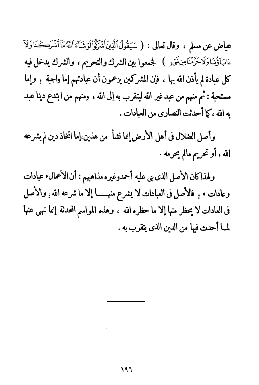 وَأَصْلُ الضَّلَالِ فِي أَهْلِ الْأَرْضِ إنَّمَا نَشَأَ مِنْ هَذَيْنِ إمَّا اتِّخَاذُ دِينٍ لَمْ يُشَرِّعْهُ اللَّهُ أَوْ تَحْرِيمُ مَا لَمْ يُحَرِّمْهُ.